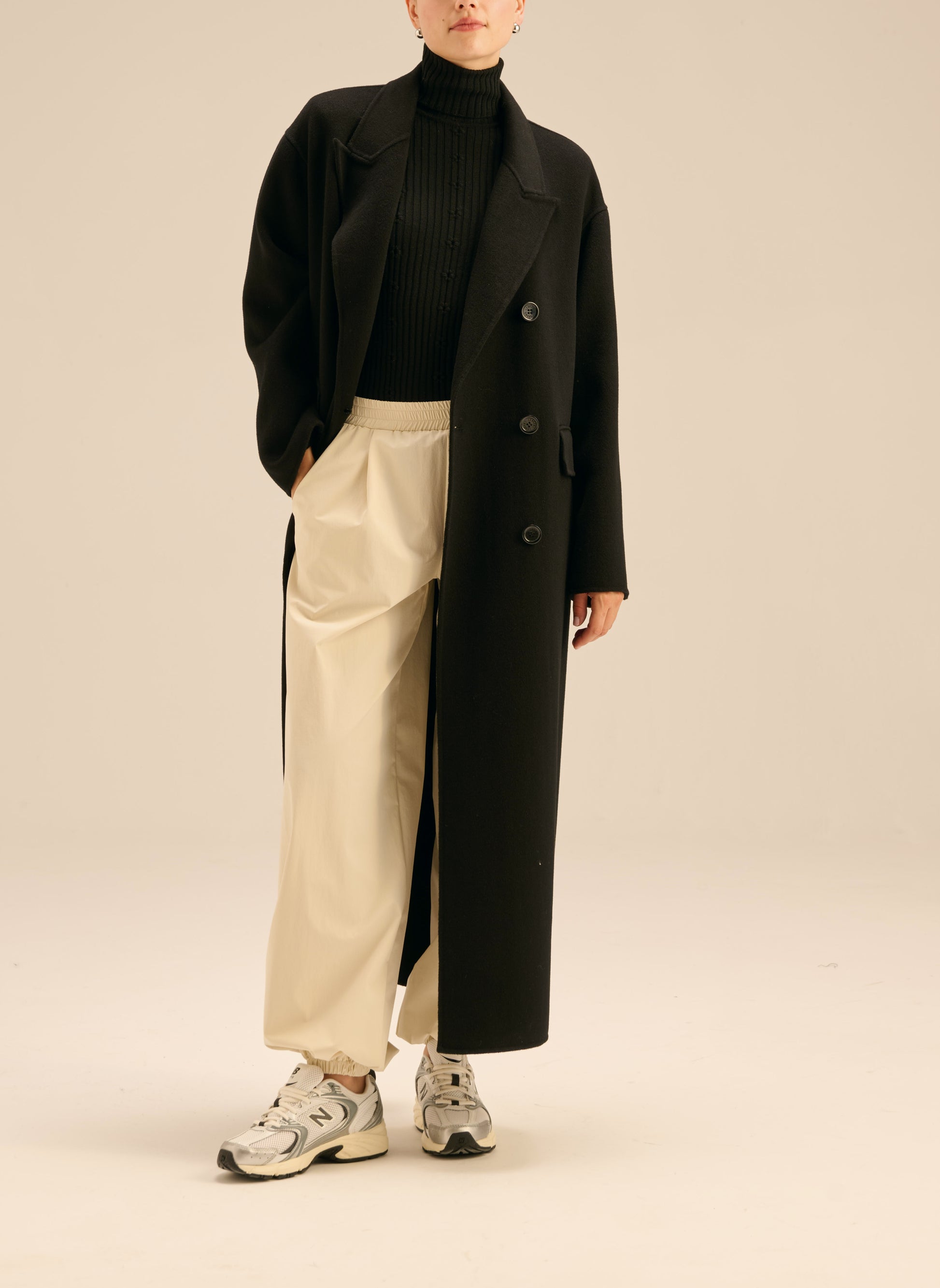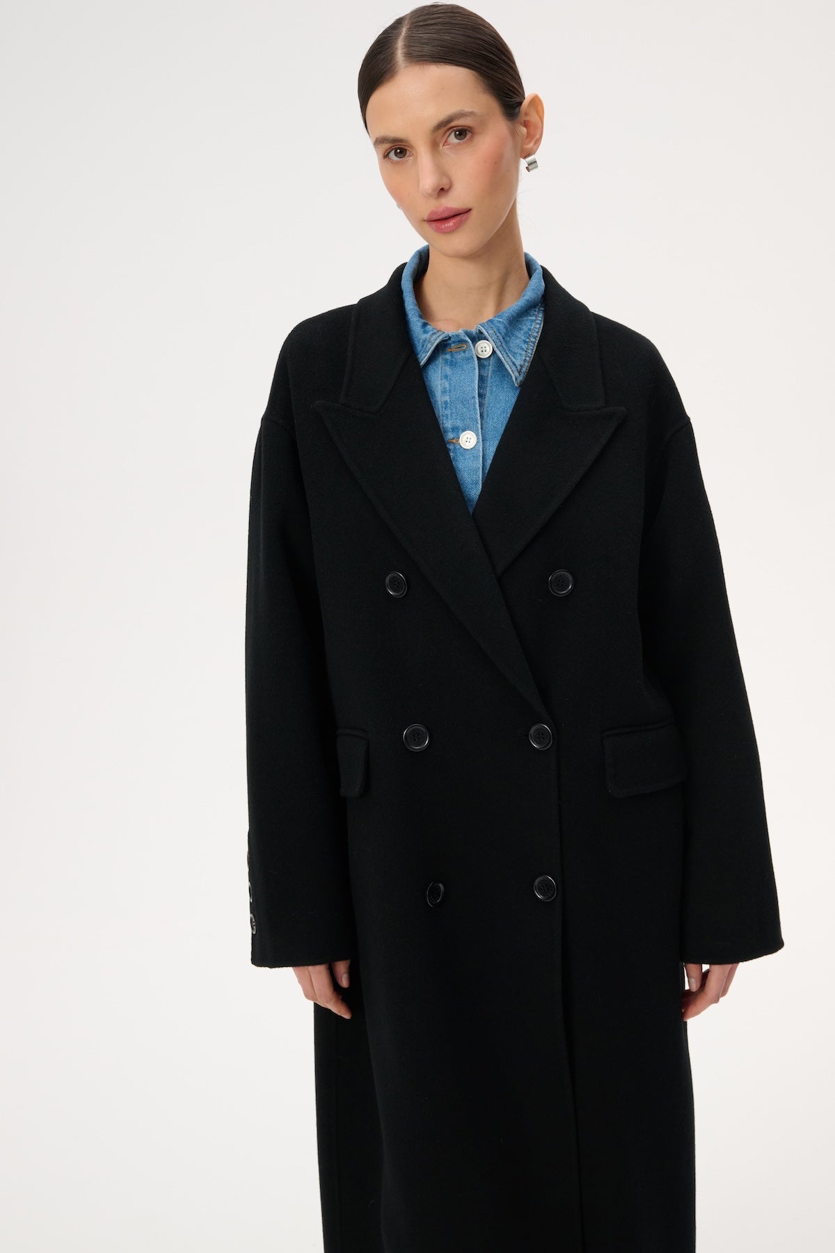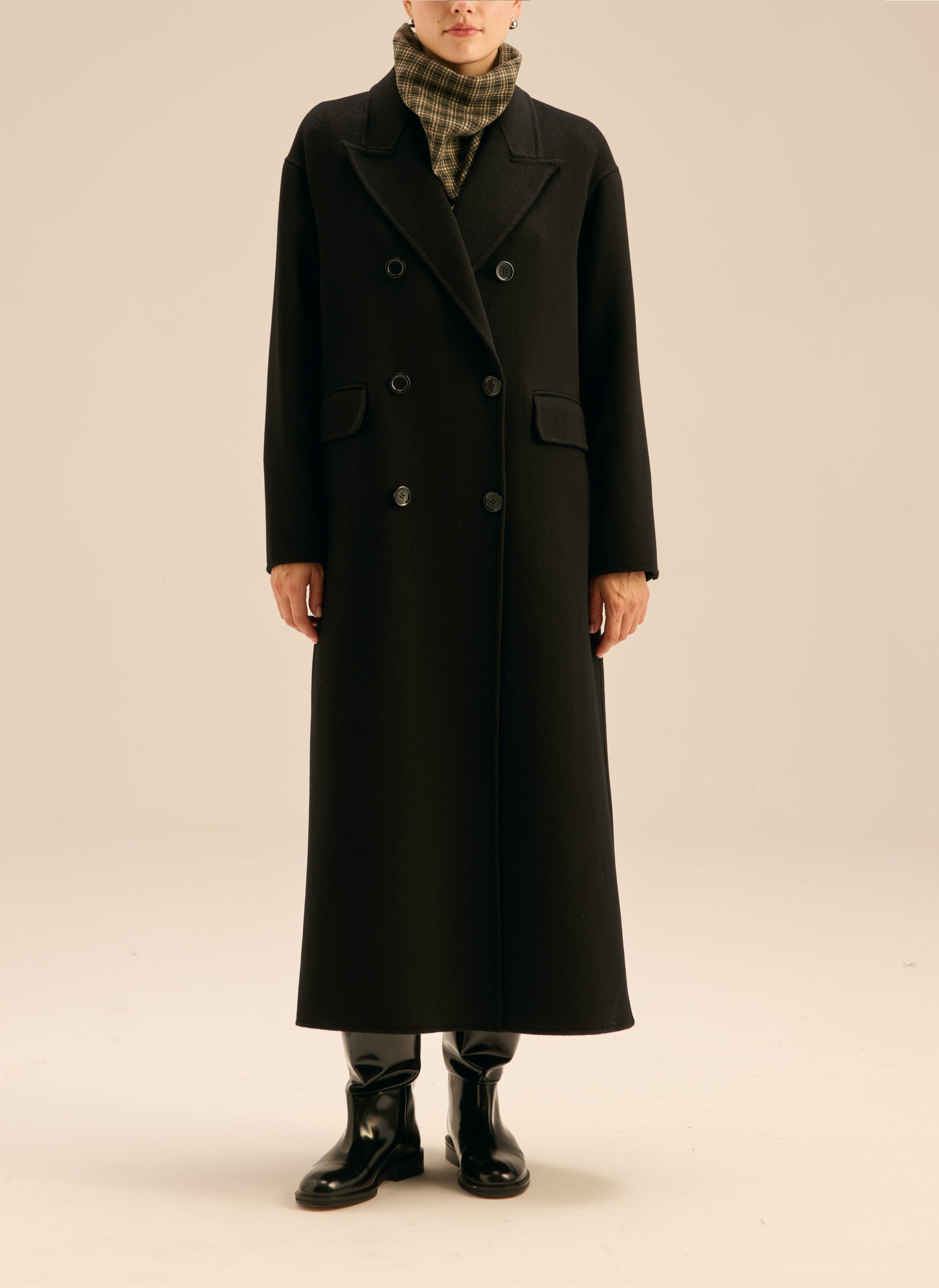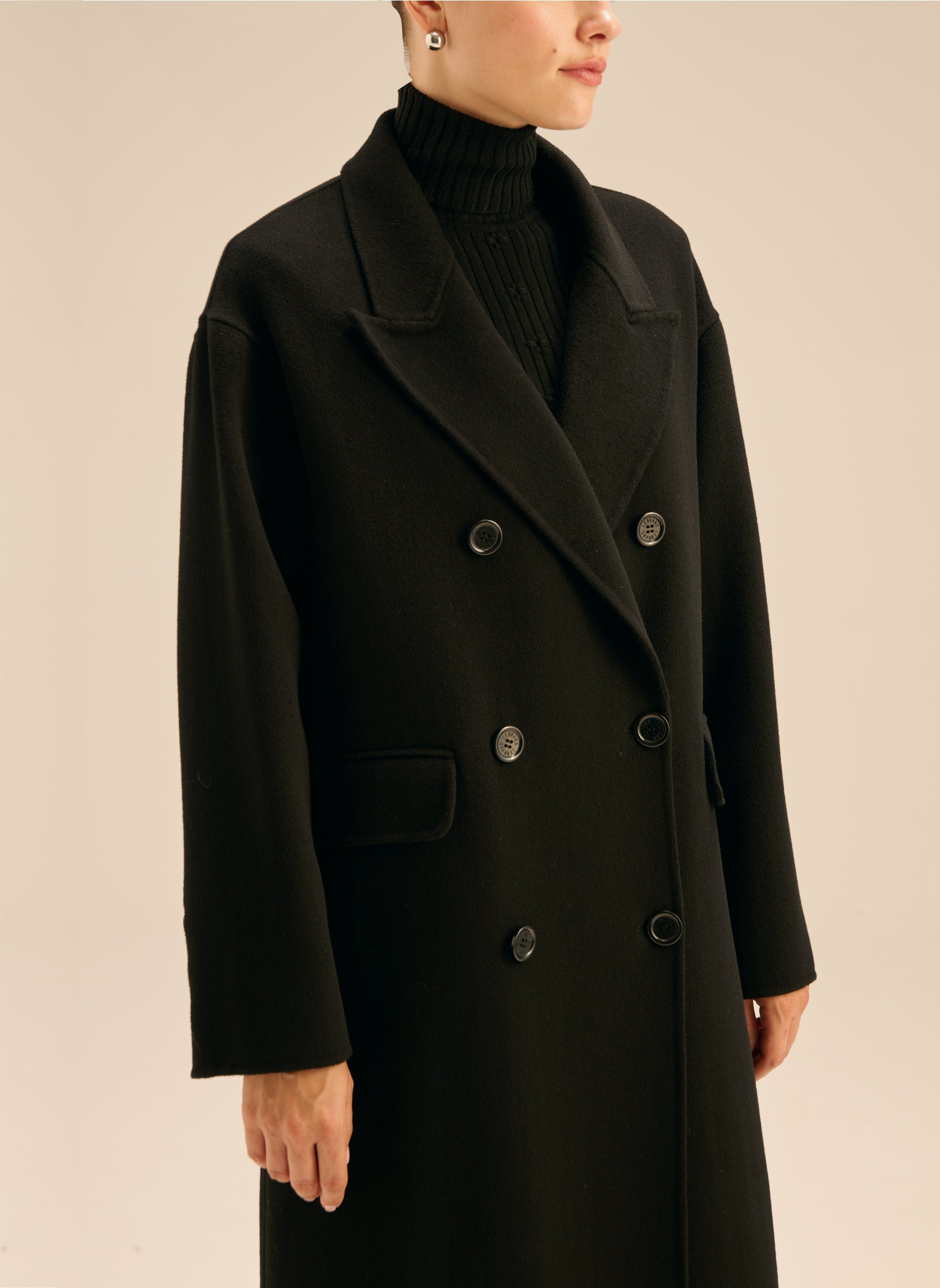 Długi płaszcz o kroju oversize. Wykonany w 100% z miękkiej wełny w czarnym kolorze. Posiada dwurzędowe zapięcie na guziki, szerokie klapy oraz dwie kieszenie. Model bez podszewki/ double face.