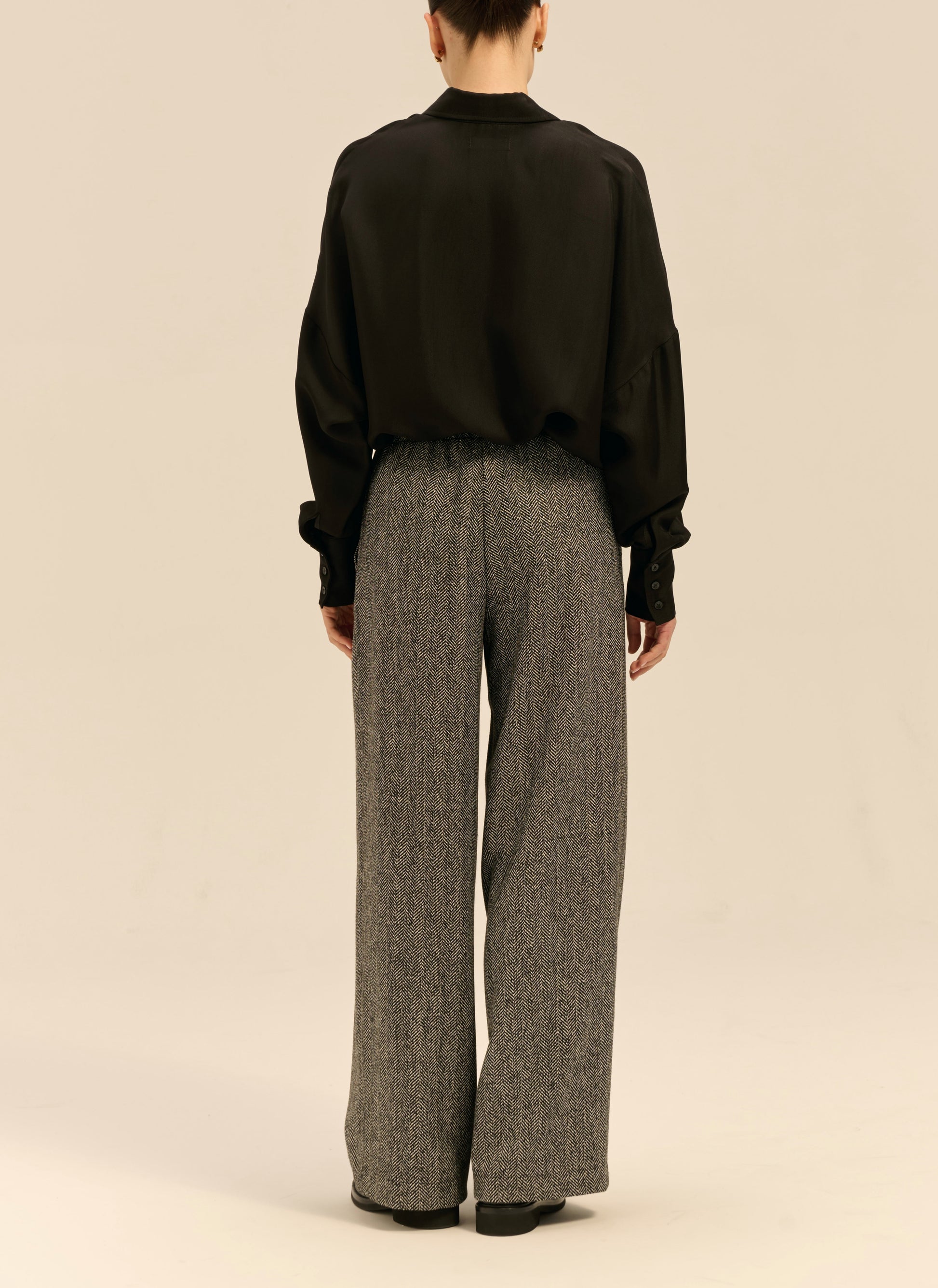 Spodnie z szeroką nogawką i elastycznym pasem w szarą jodełkę - Franco