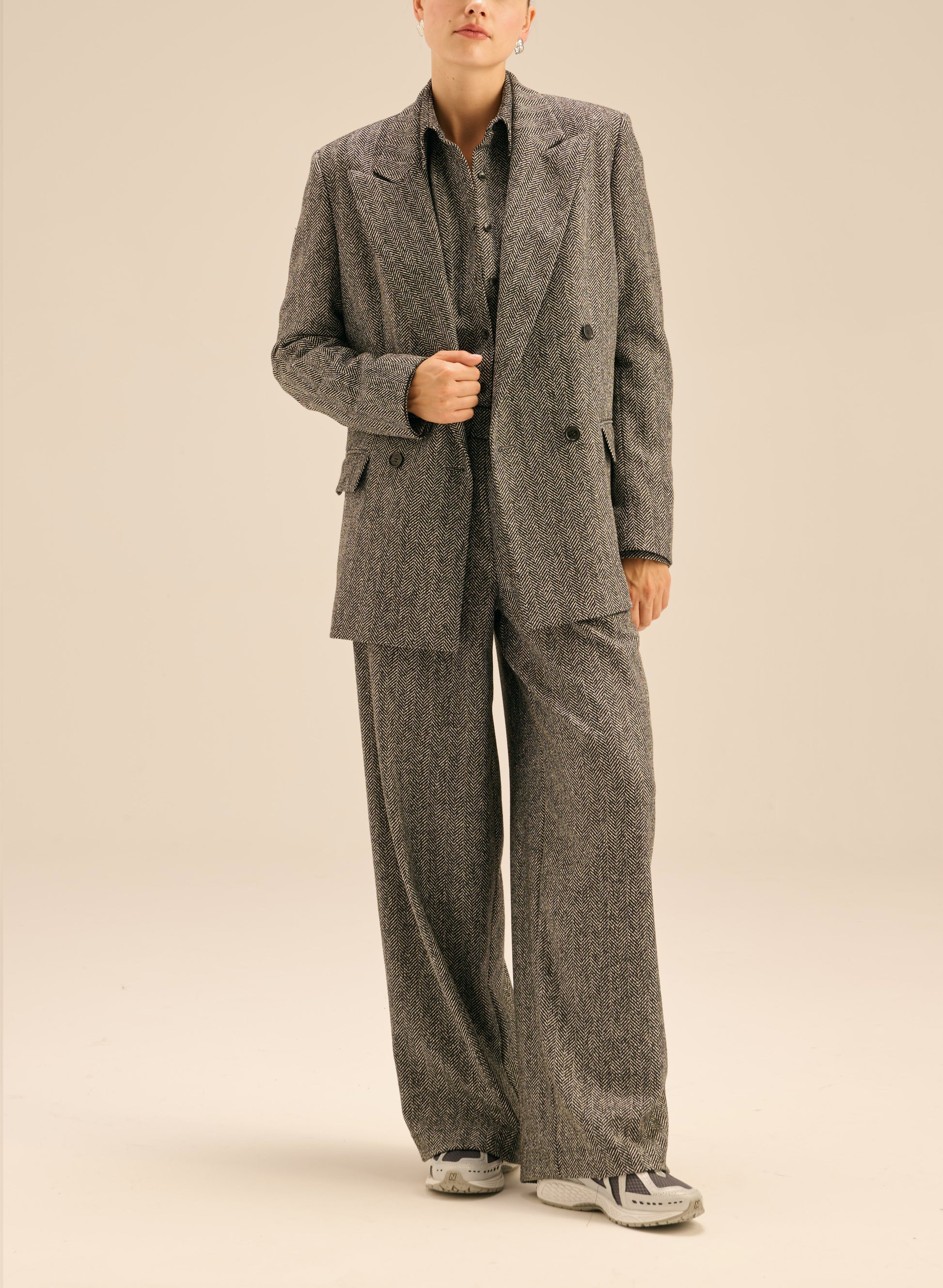 Spodnie o długich, szerokich nogawkach, wykonane z miękkiej tkaniny we wzór jodełki w szarym kolorze. Posiadają regularny stan, delikatne zaszewki, elastyczną talię.