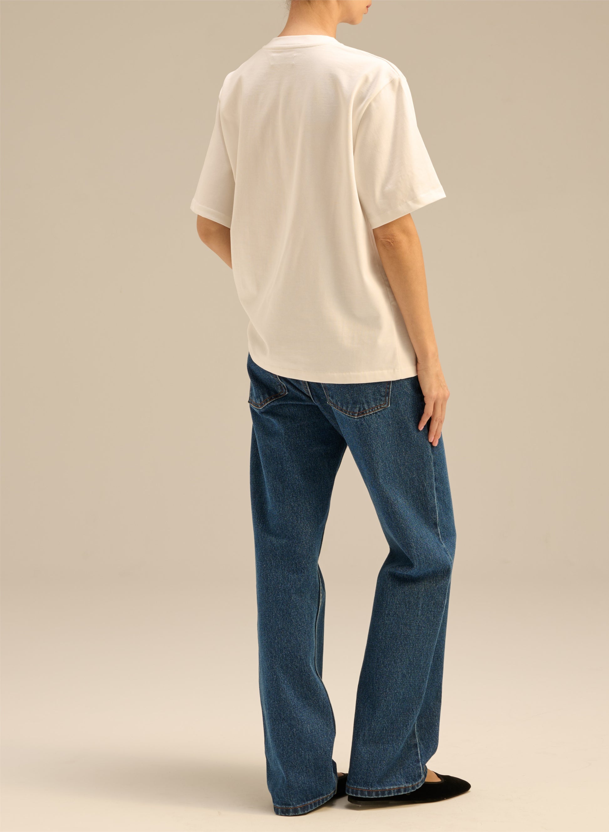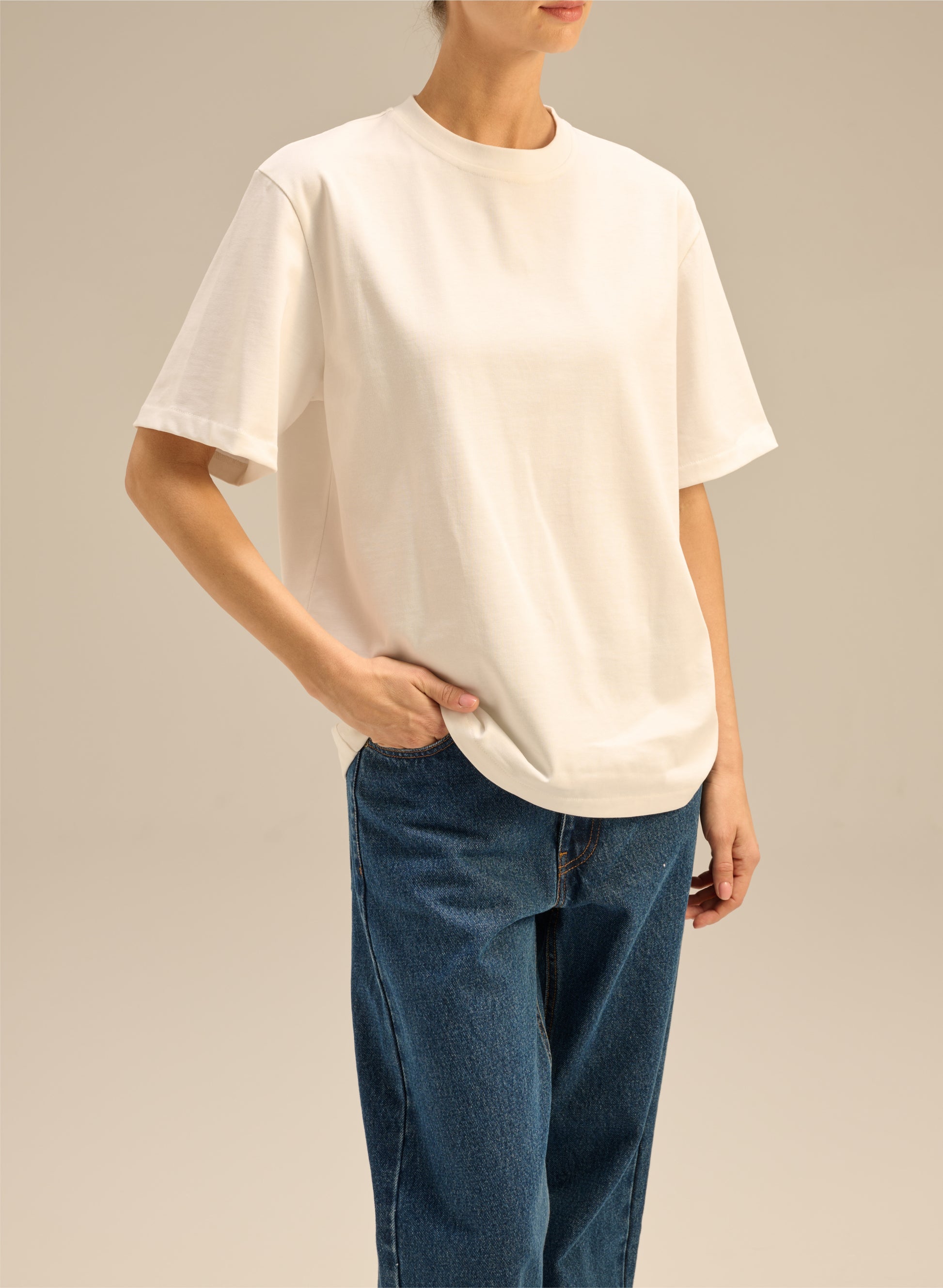 T-shirt o luźnym kroju, wykonany w 100% z mięsistej bawełny w kolorze białym. Posiada materiał o gramaturze 300g/m2, ściągacz przy szyi oraz okrągły dekolt.