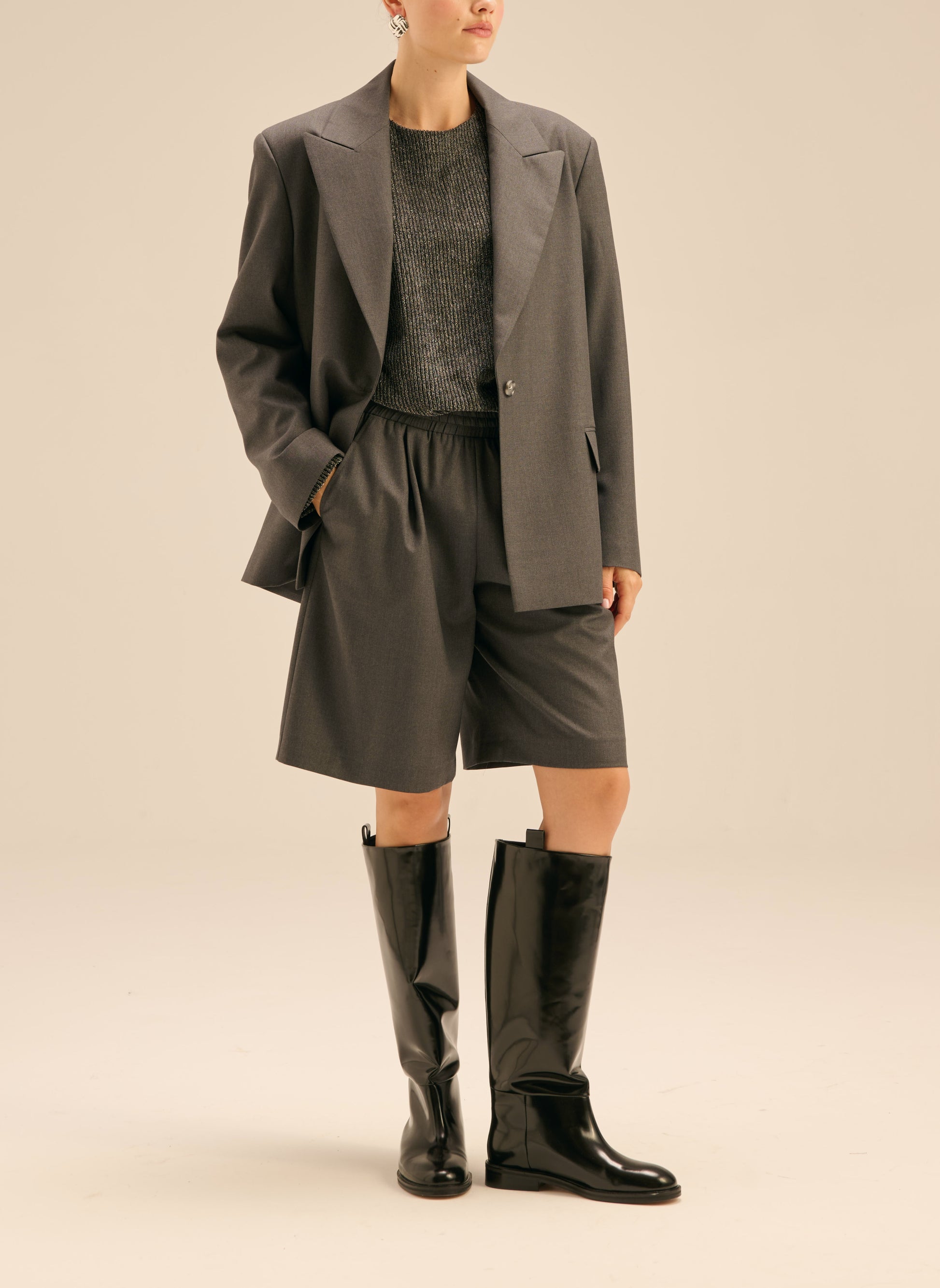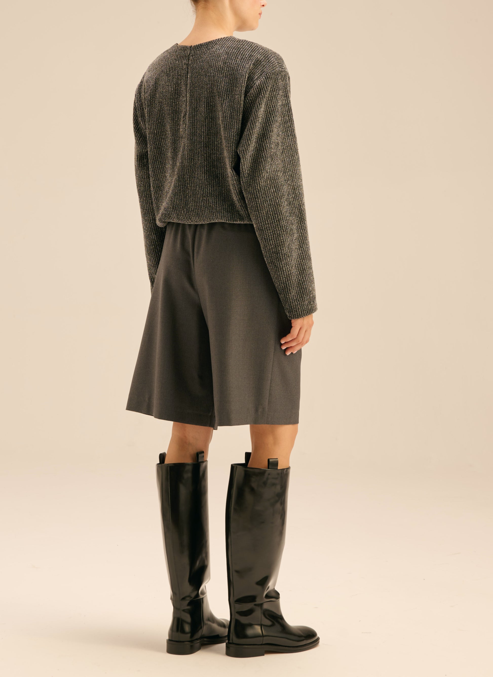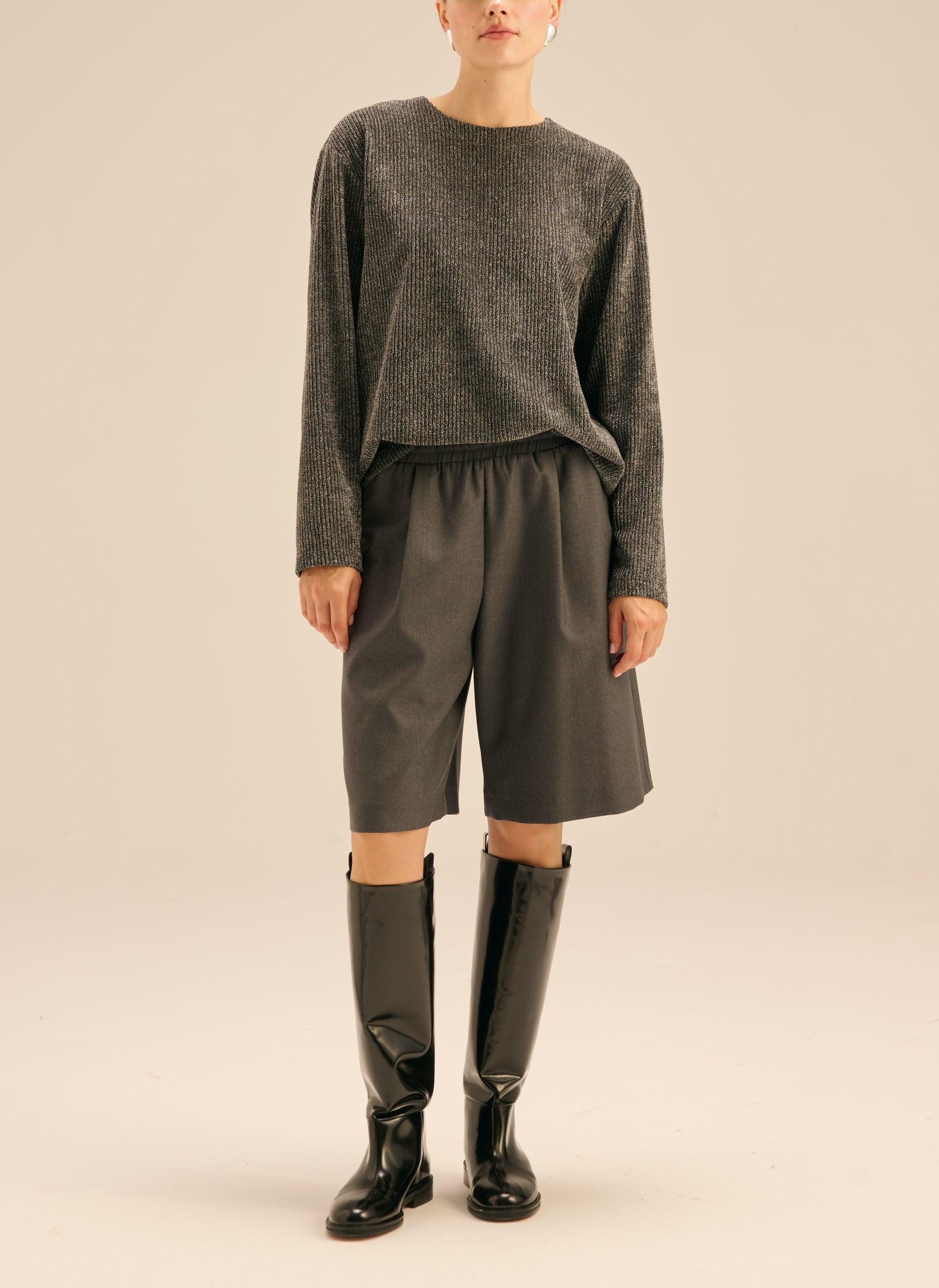 Szorty typu bermudy o długości za kolano i szerokich nogawkach wykonanych z lekkiej wełnianej tkaniny w szarym kolorze. Posiadają delikatne zaszewki, elastyczną talię oraz dwie kieszenie boczne.