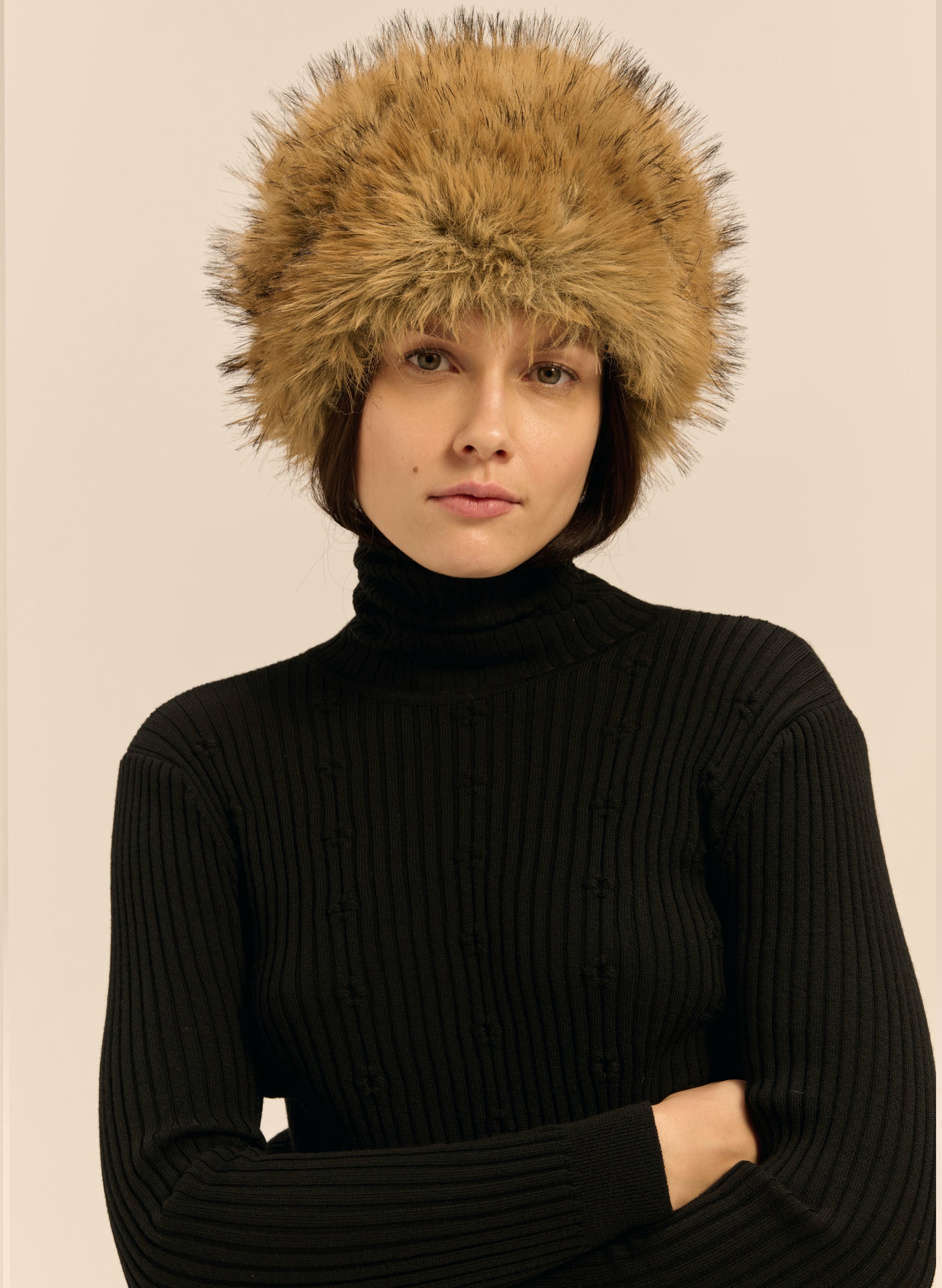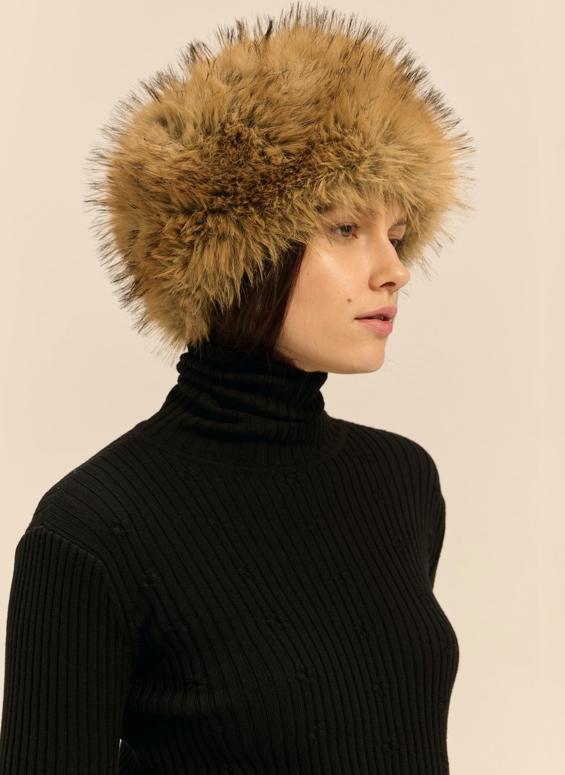 Okrągła czapka wykonana z miękkiego, sztucznego futra w kolorze jasnego brązu.