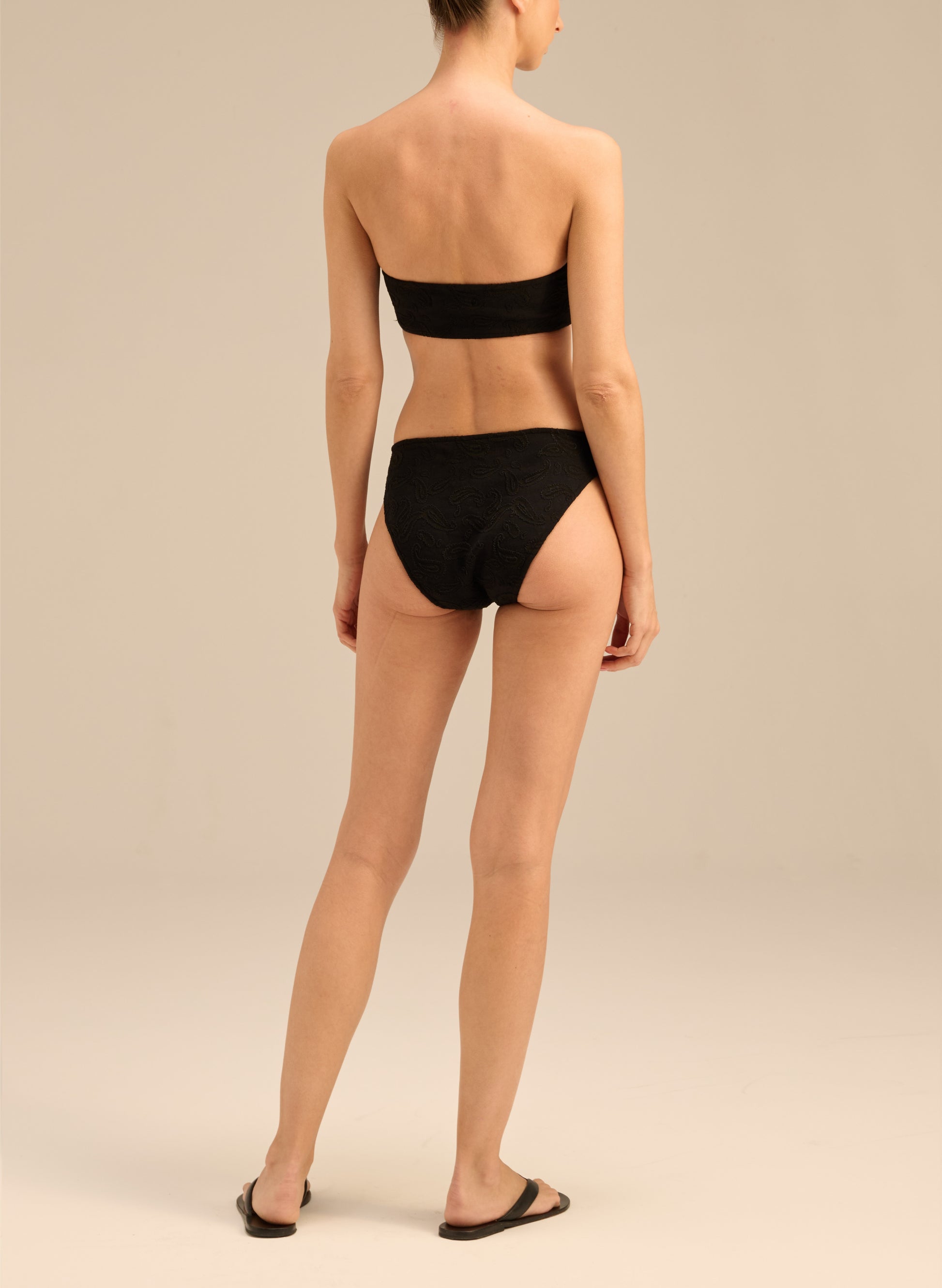 Dół kąpielowy od bikini o klasycznym fasonie i gumką w pasie w czarnym kolorze. Wykonany z elastycznego materiału w haftowany nadruk inspirowany wzorem bandany w kolorze czarnym.