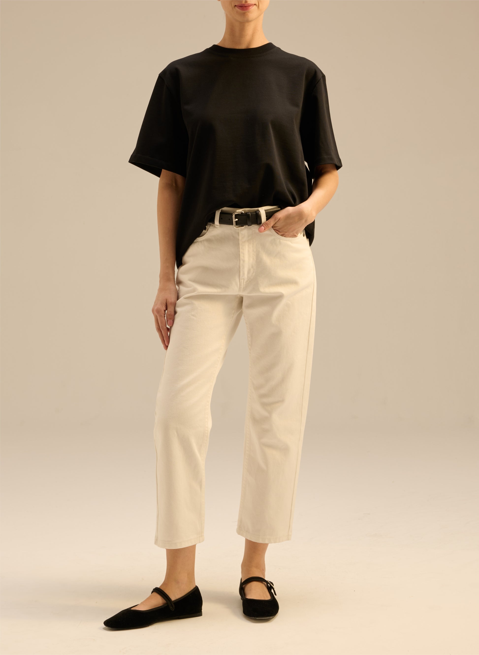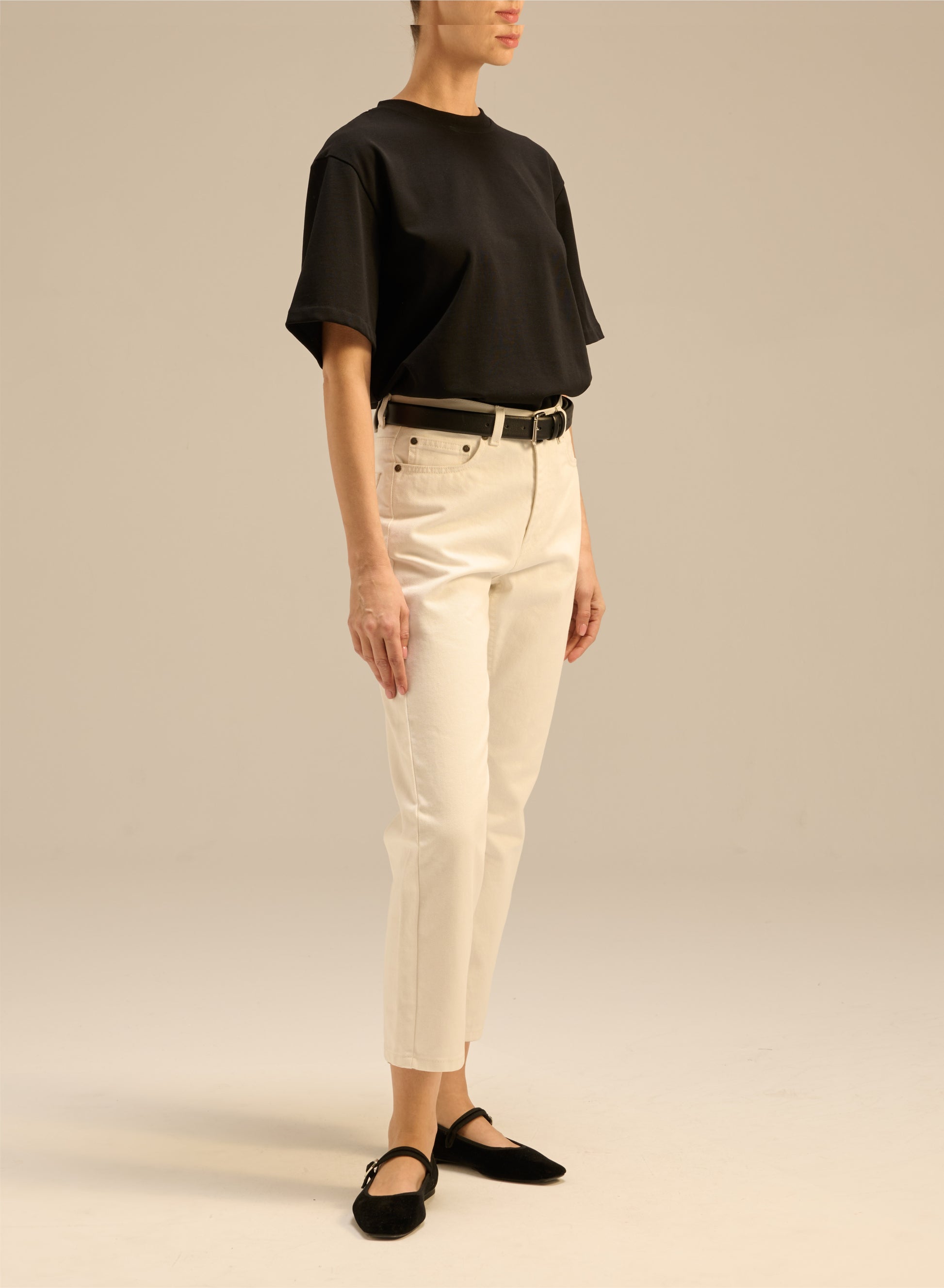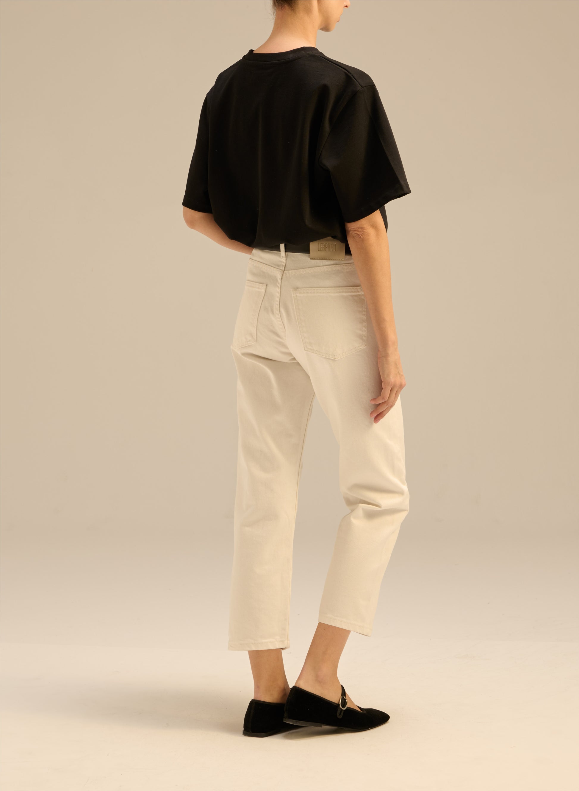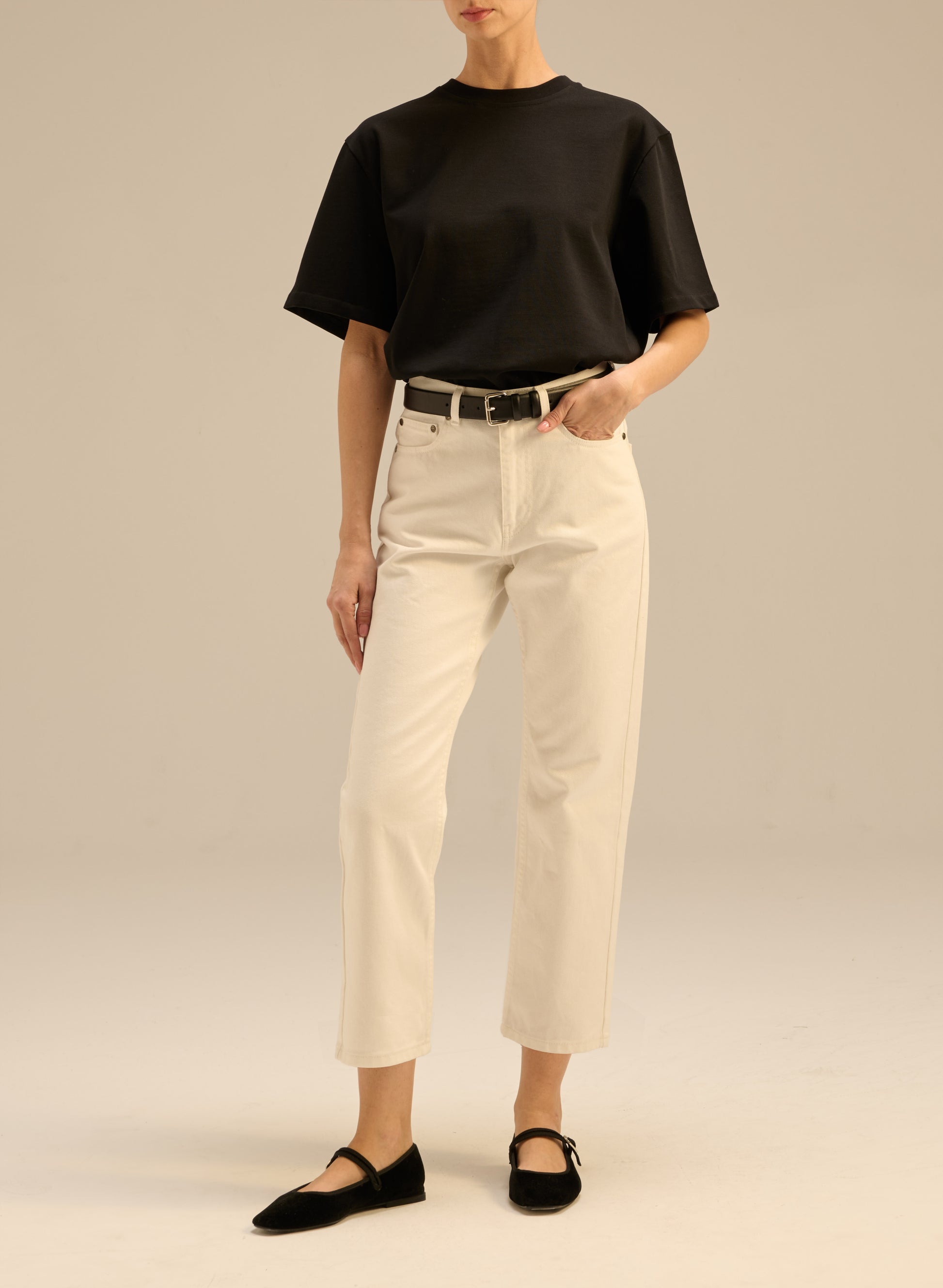 Jeansy o klasycznym fasonie z wysokim stanem i zwężaną nogawką o długości sięgającej lekko ponad kostkę. Wykonane w 100% z nieelastycznej bawełny w kolorze ecru. Posiadają zapięcie na guzik i suwak, skórzaną naszywkę z wytłoczonym logo z tyłu oraz pięć wsuwanych kieszeni.