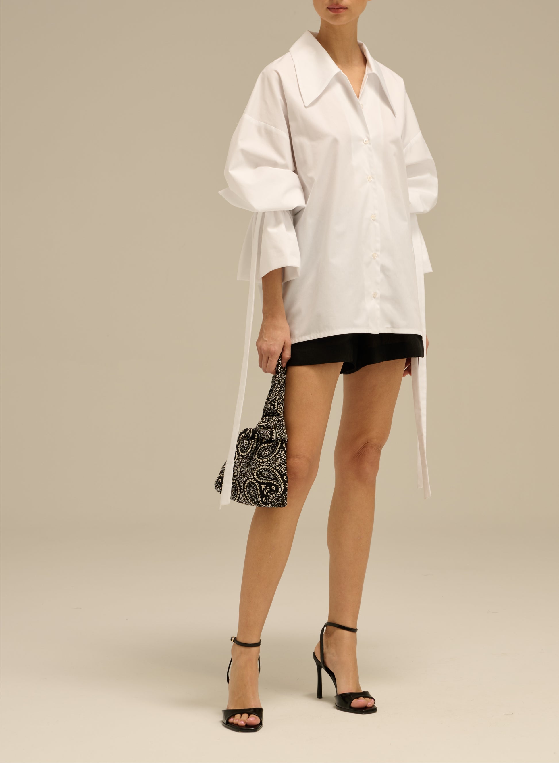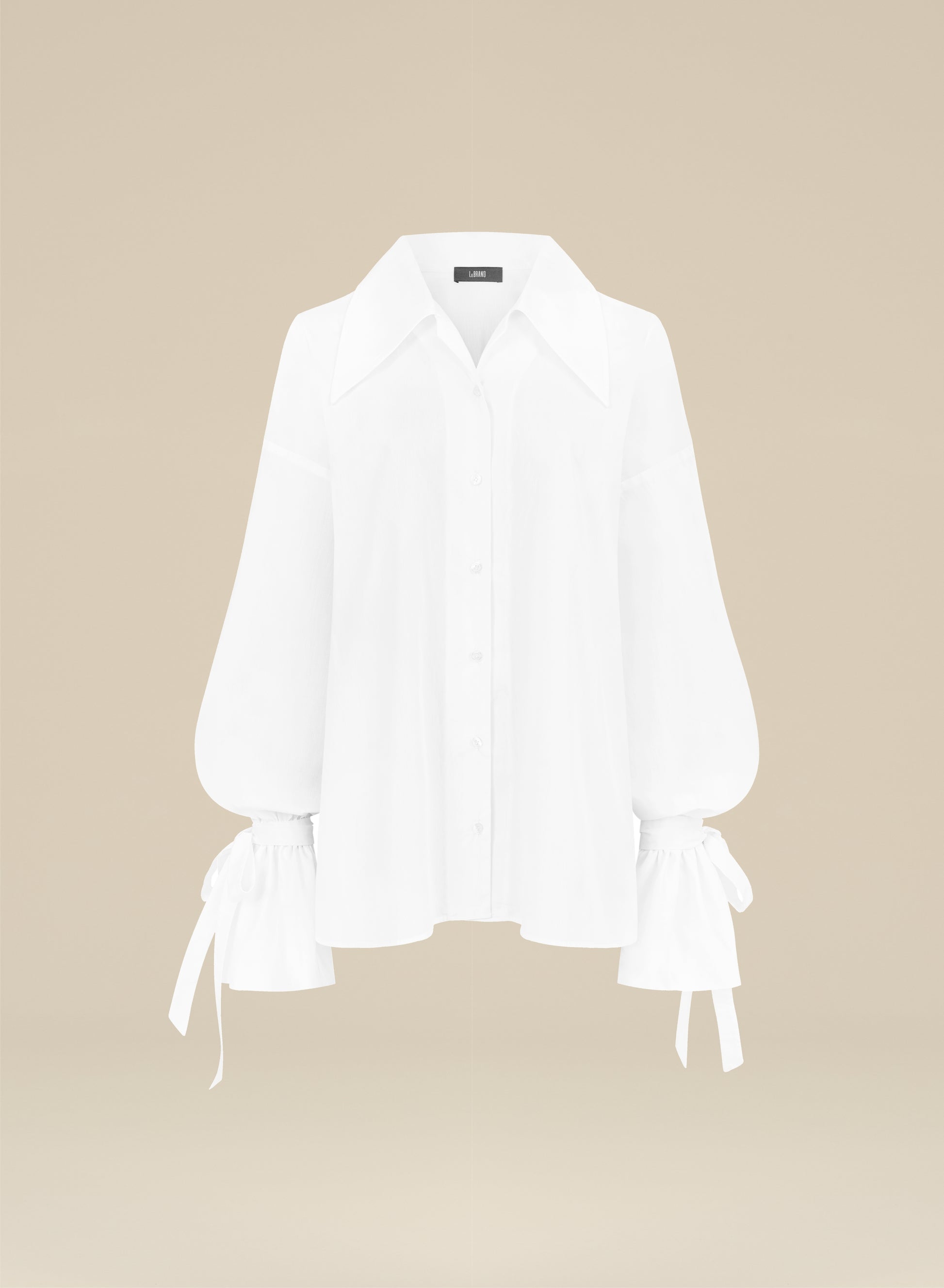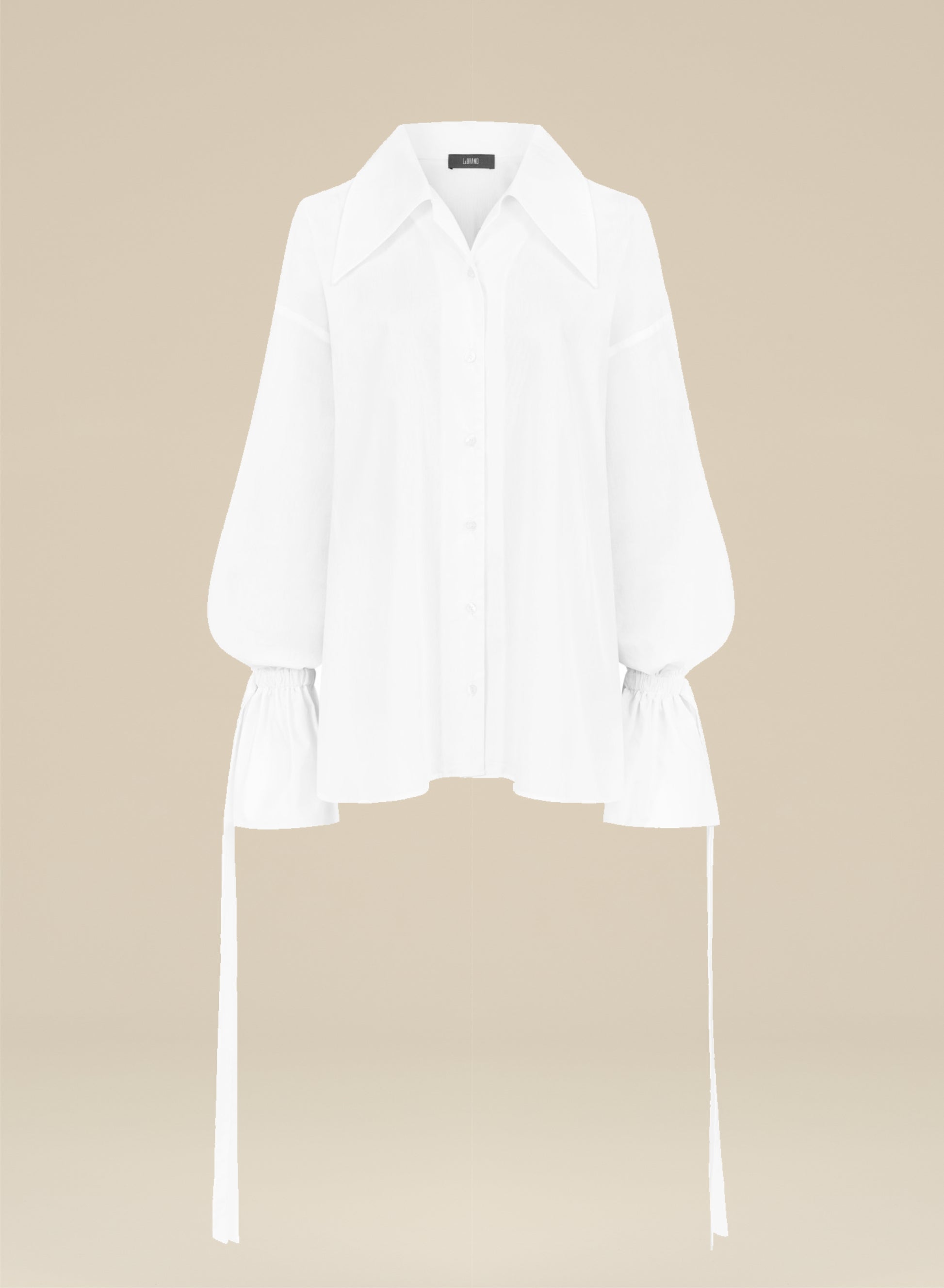 Szeroka koszula wykonana z lekkiej bawełny. Posiada duży kołnierz i długie rękawy z elastycznym ściągaczem i długimi troczkami.
