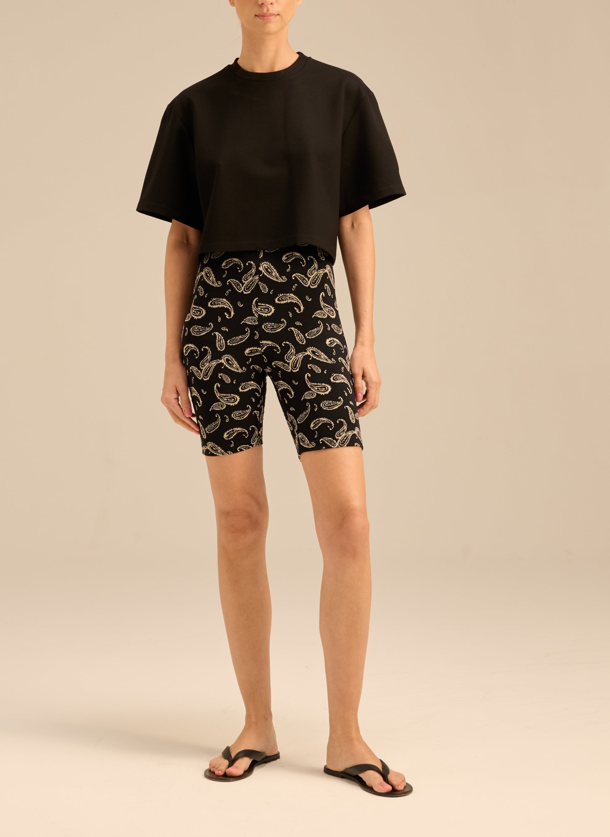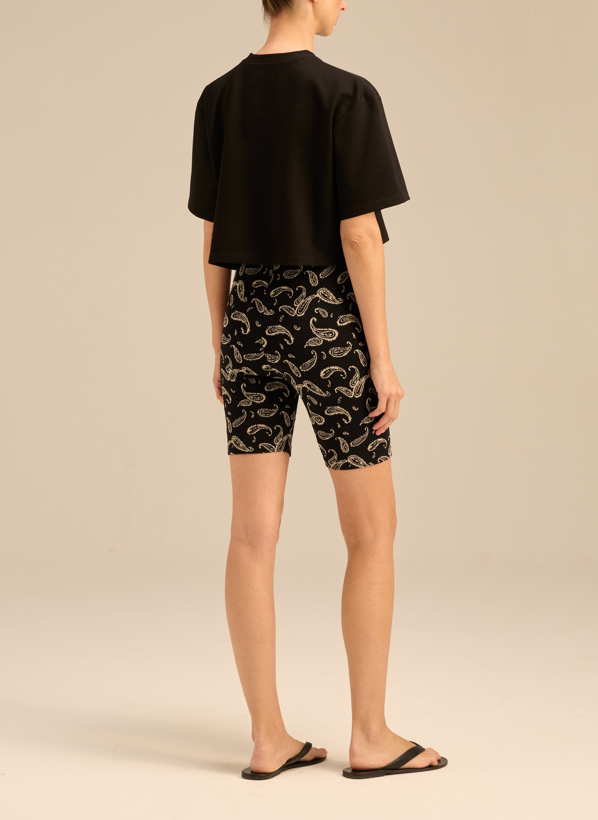 Dół od kostiumu w postaci spodenek w czarnym kolorze. Wykonany z elastycznego materiału w haftowany nadruk inspirowany wzorem bandany w kolorze ecru. Posiada dopasowany krój, podwyższony stan oraz gumkę w pasie.