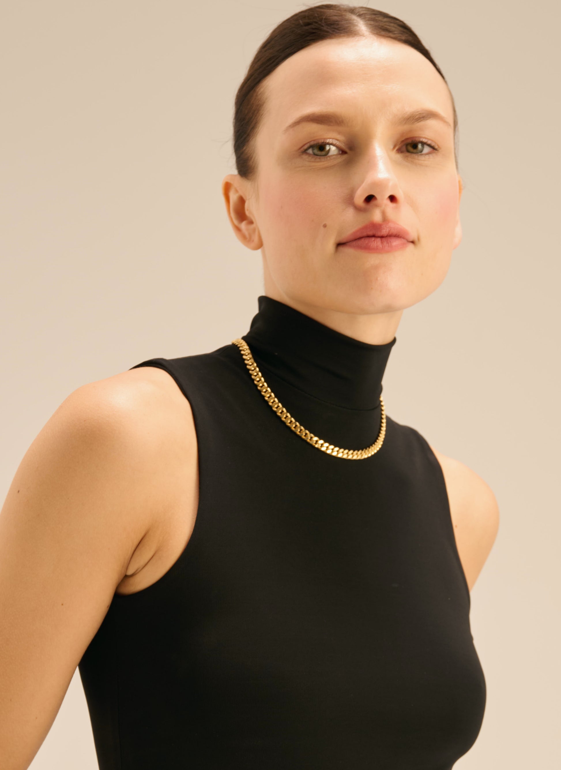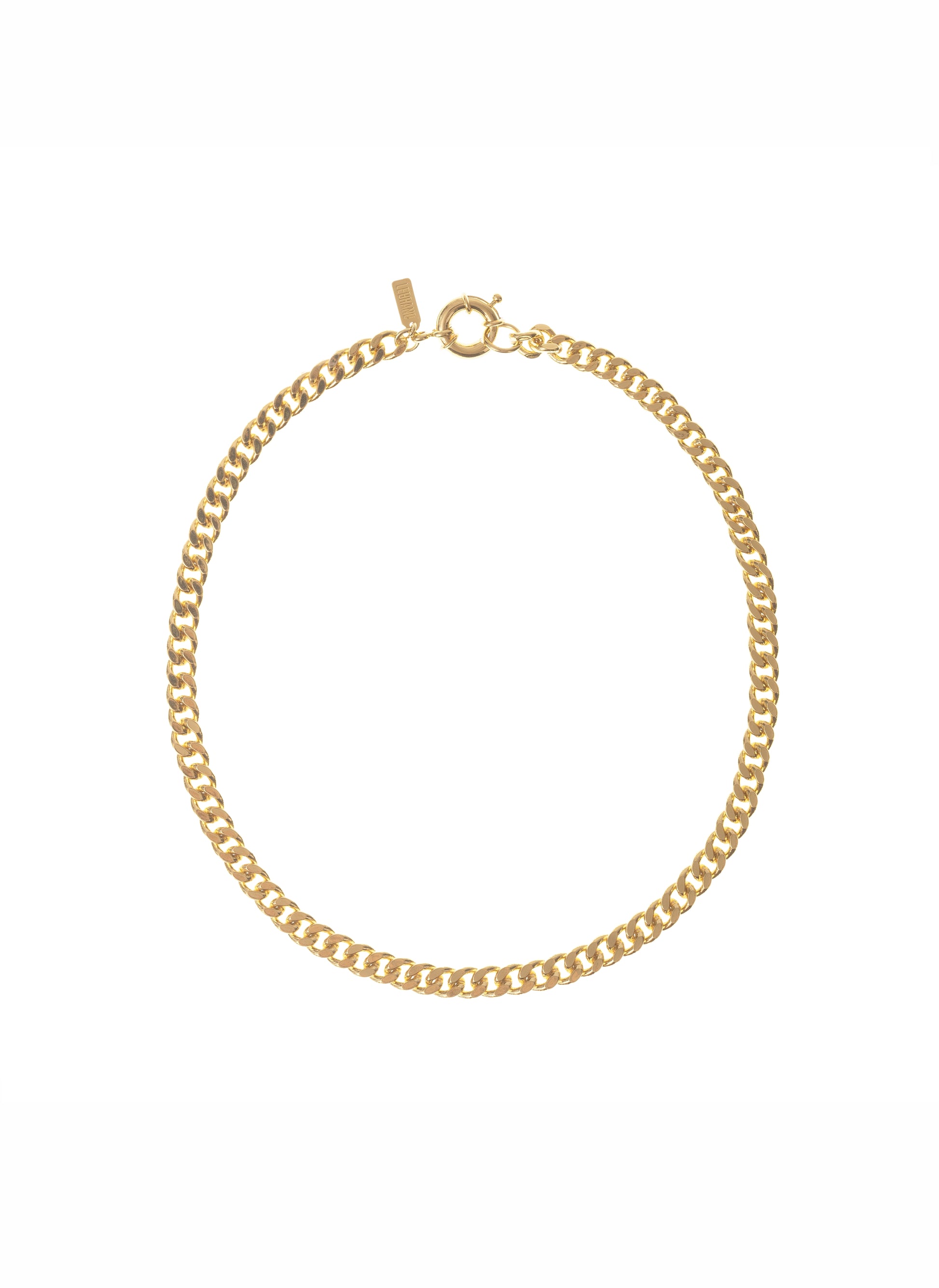 Złoty naszyjnik o płaskich ogniwach, wykonany ręcznie z mosiądzu pozłacanego 24 karatowym złotem.