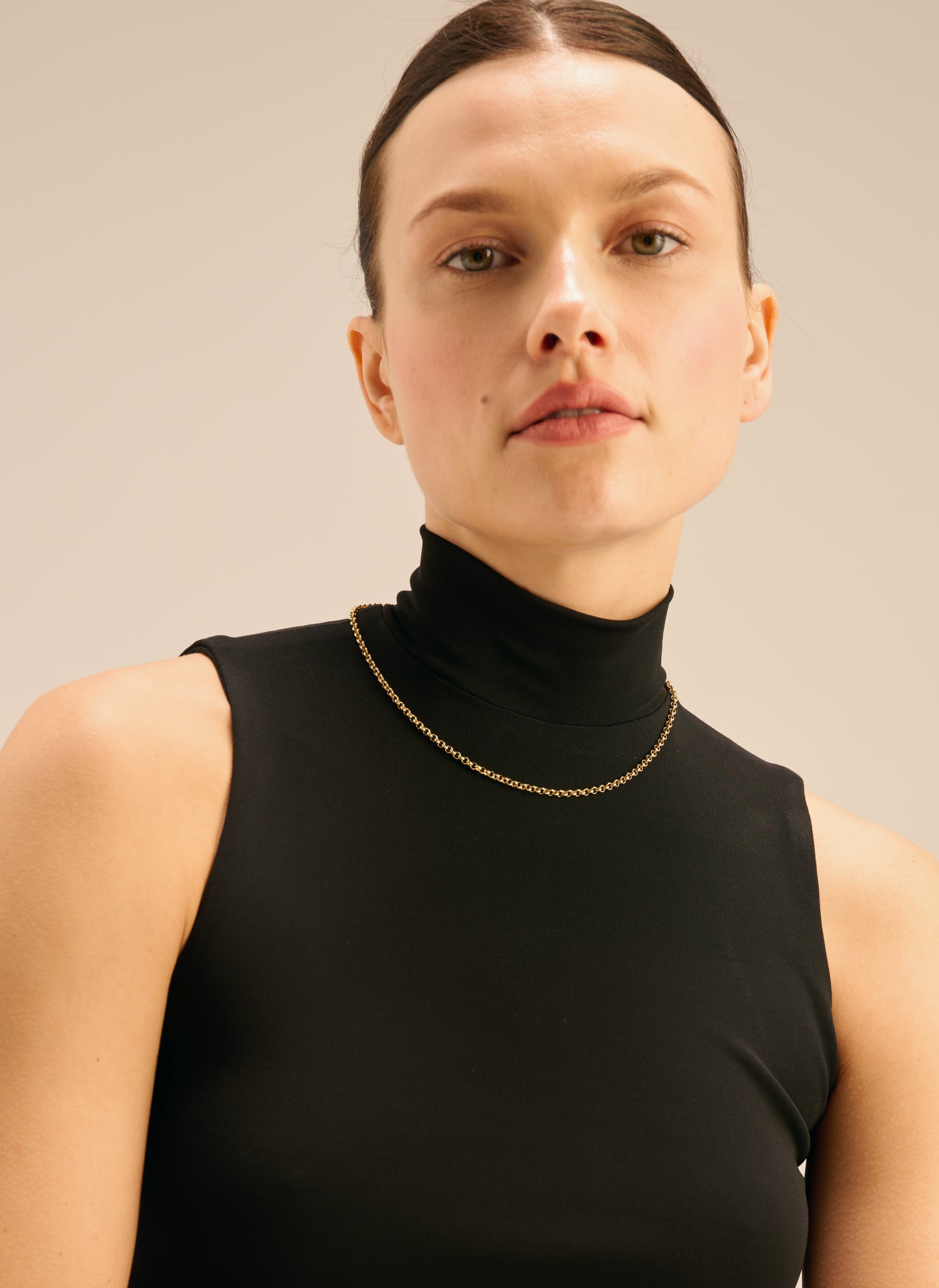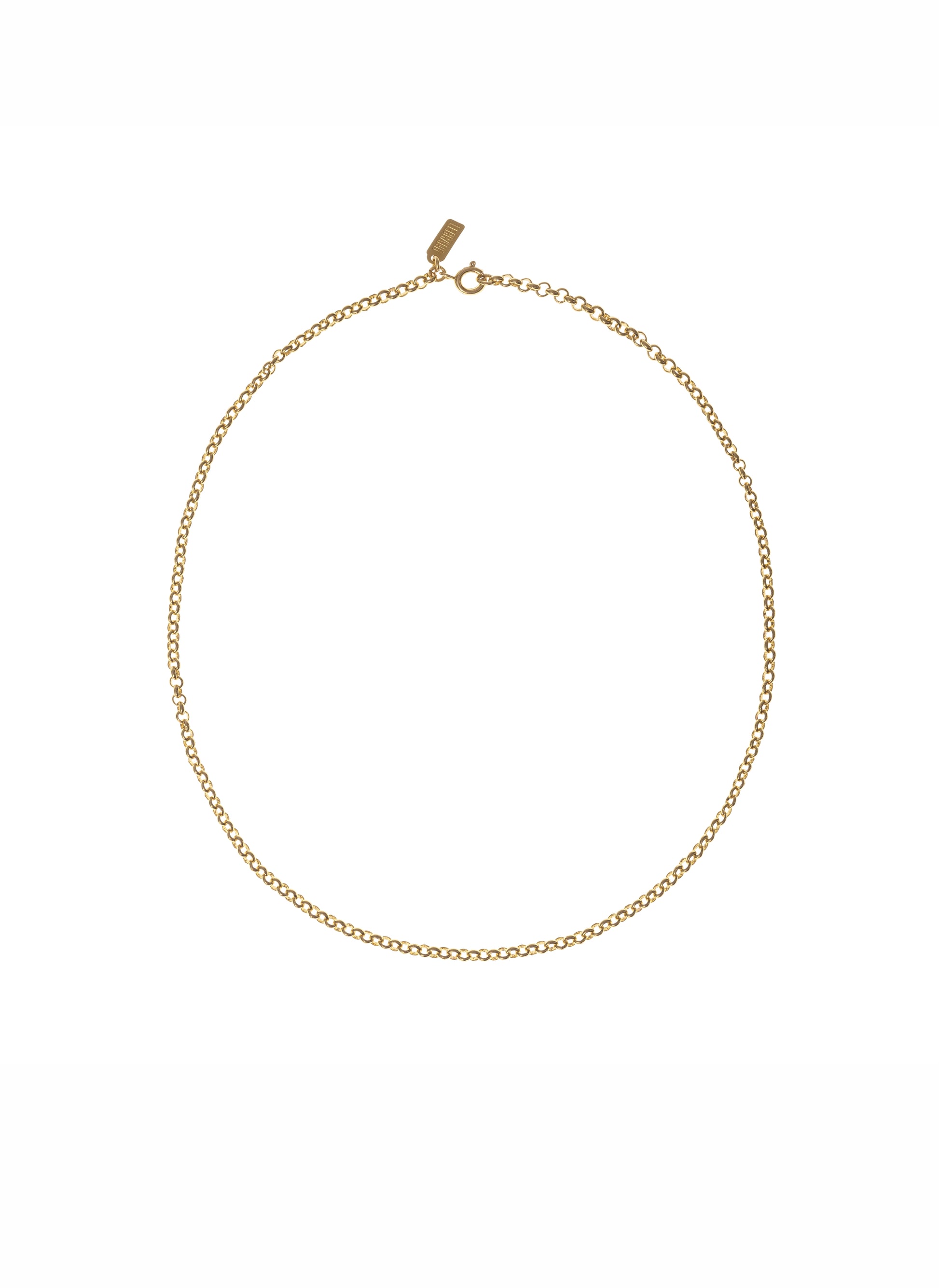 Złoty naszyjnik o delikatnych, okrągłych ogniwach, wykonany ręcznie z mosiądzu pozłacanego 24 karatowym złotem.