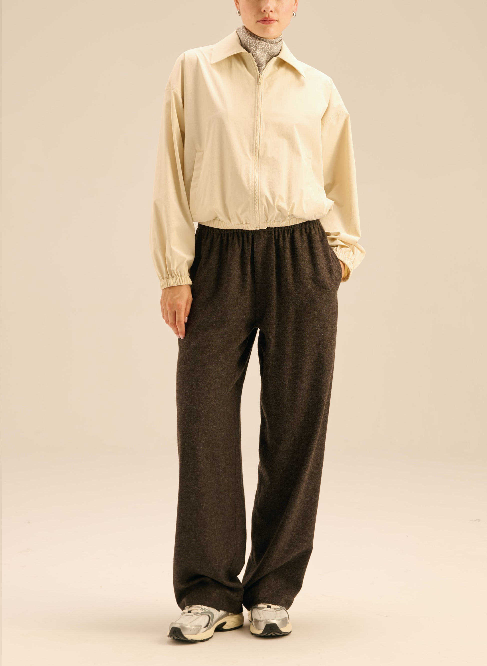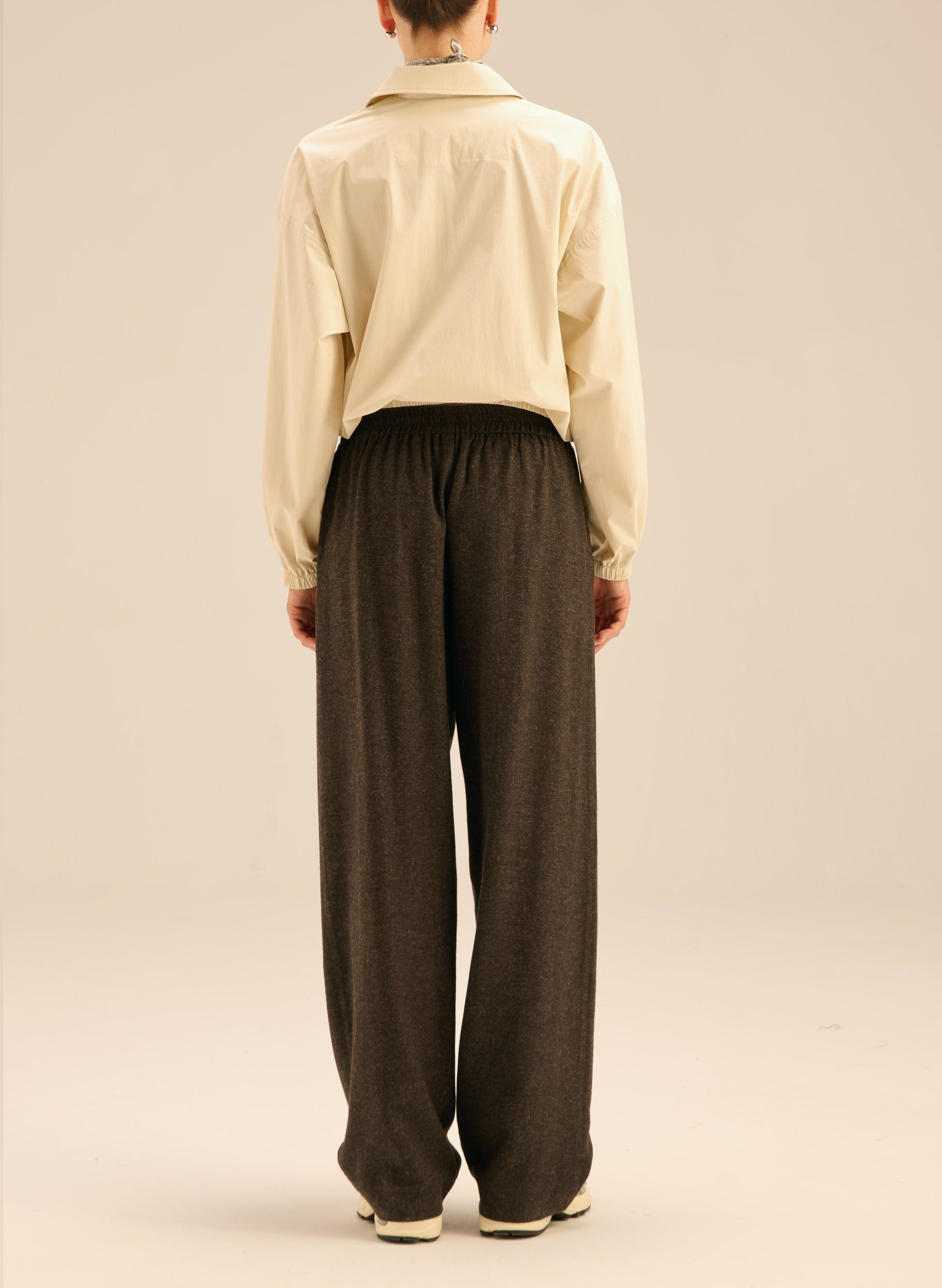 Spodnie o długich, szerokich nogawkach, wykonane z miękkiej, delikatnej tkaniny w kolorze brązowego melanżu. Posiadają regularny stan, delikatne zaszewki, elastyczną talię.