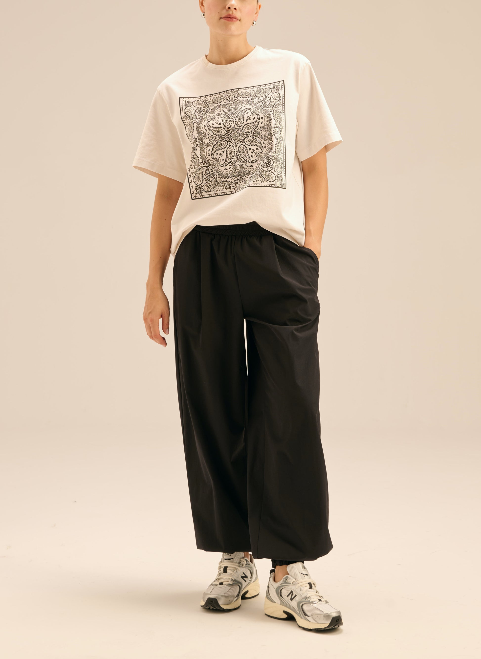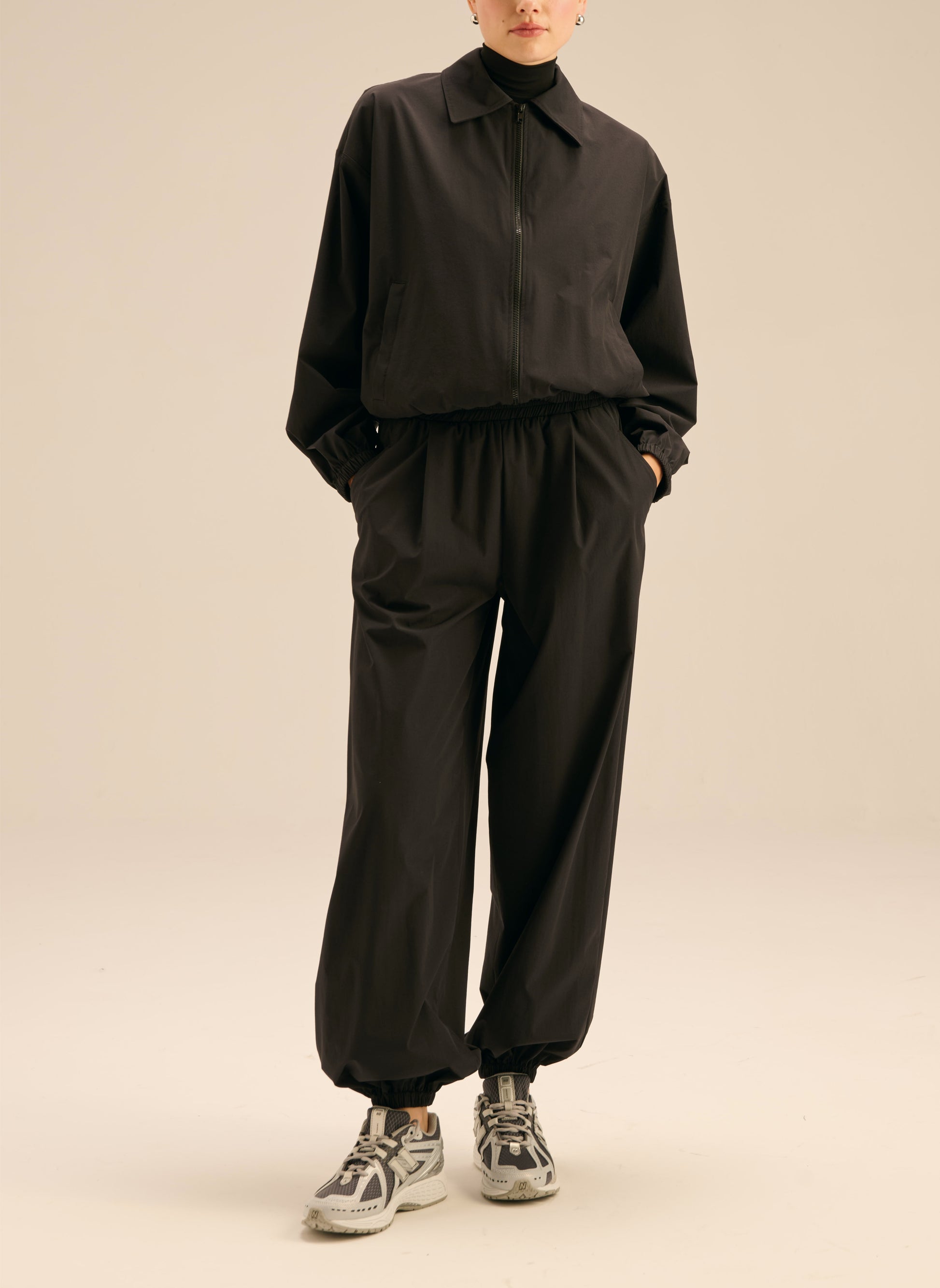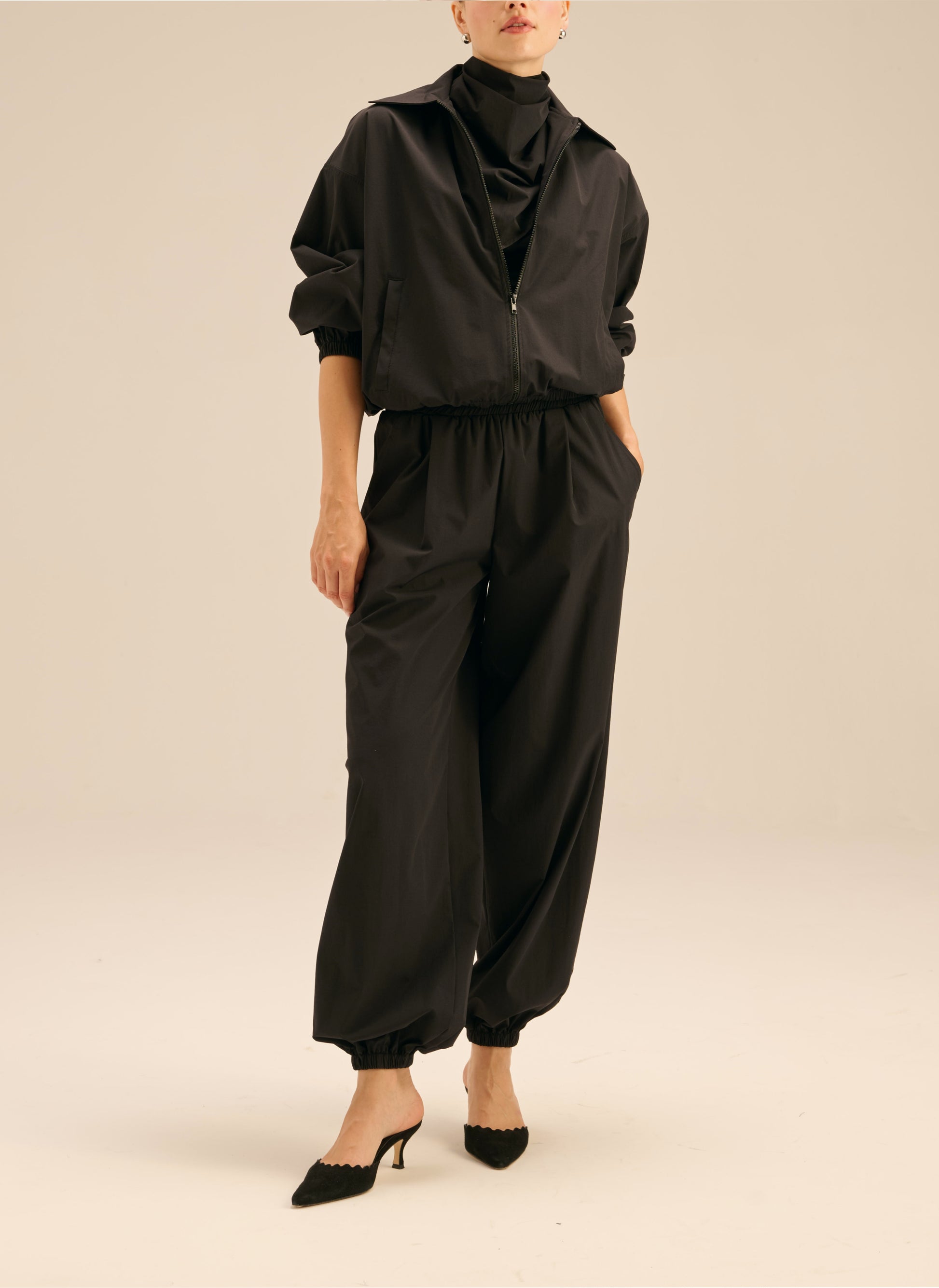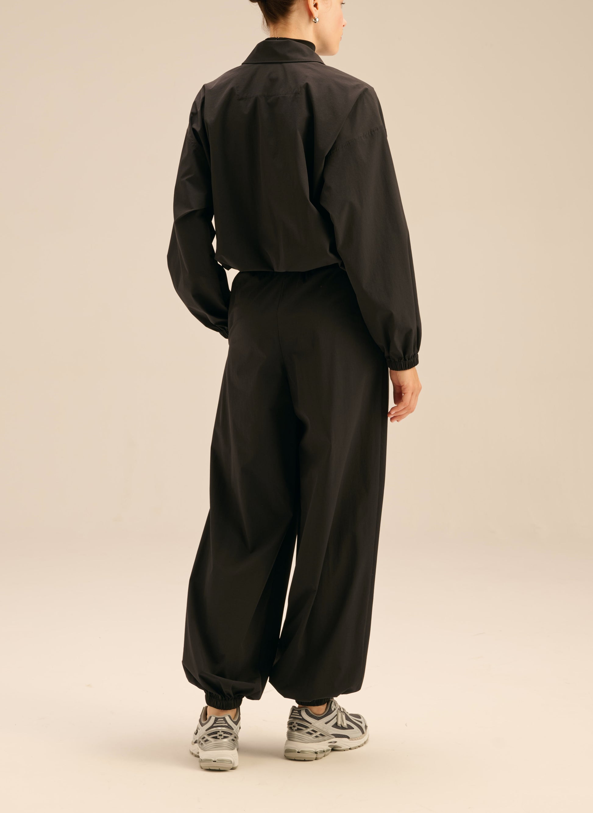Spodnie o luźnym kroju wykonane z lekkiego materiału typu ortalion, w czarnym kolorze. Posiadają elastyczną talię, dwie kiedzenie i szerokie nogawki ściągane gumką.