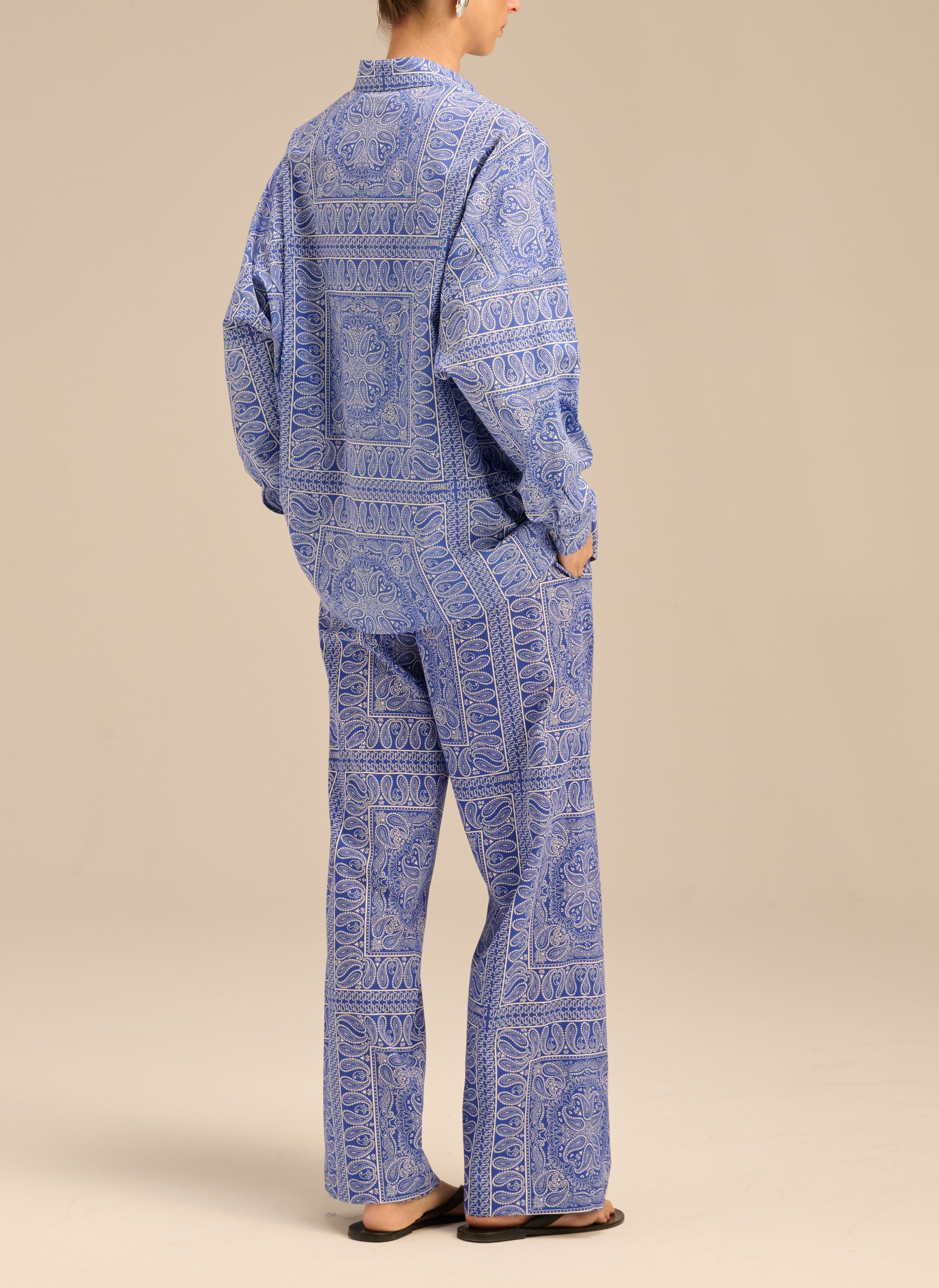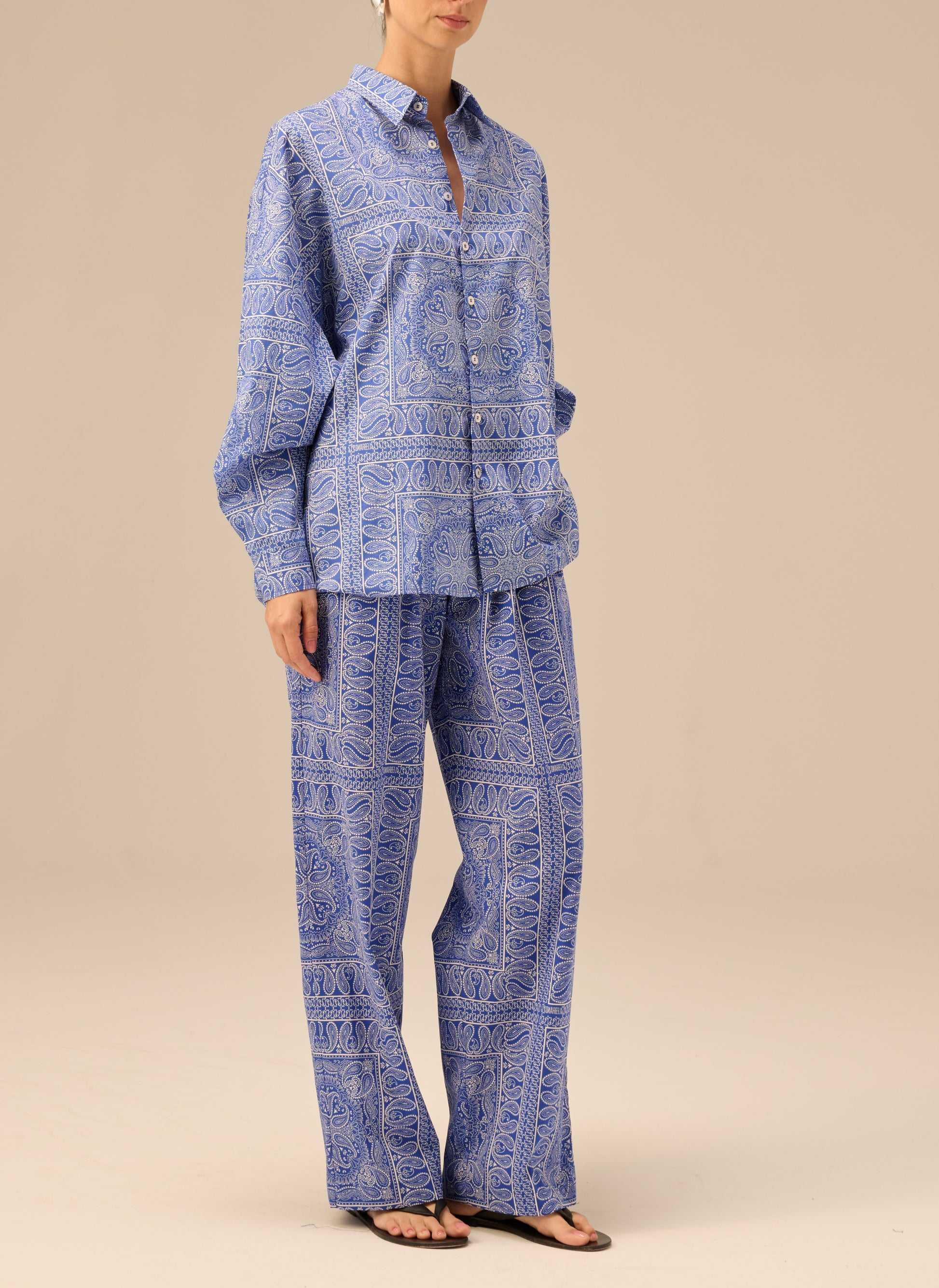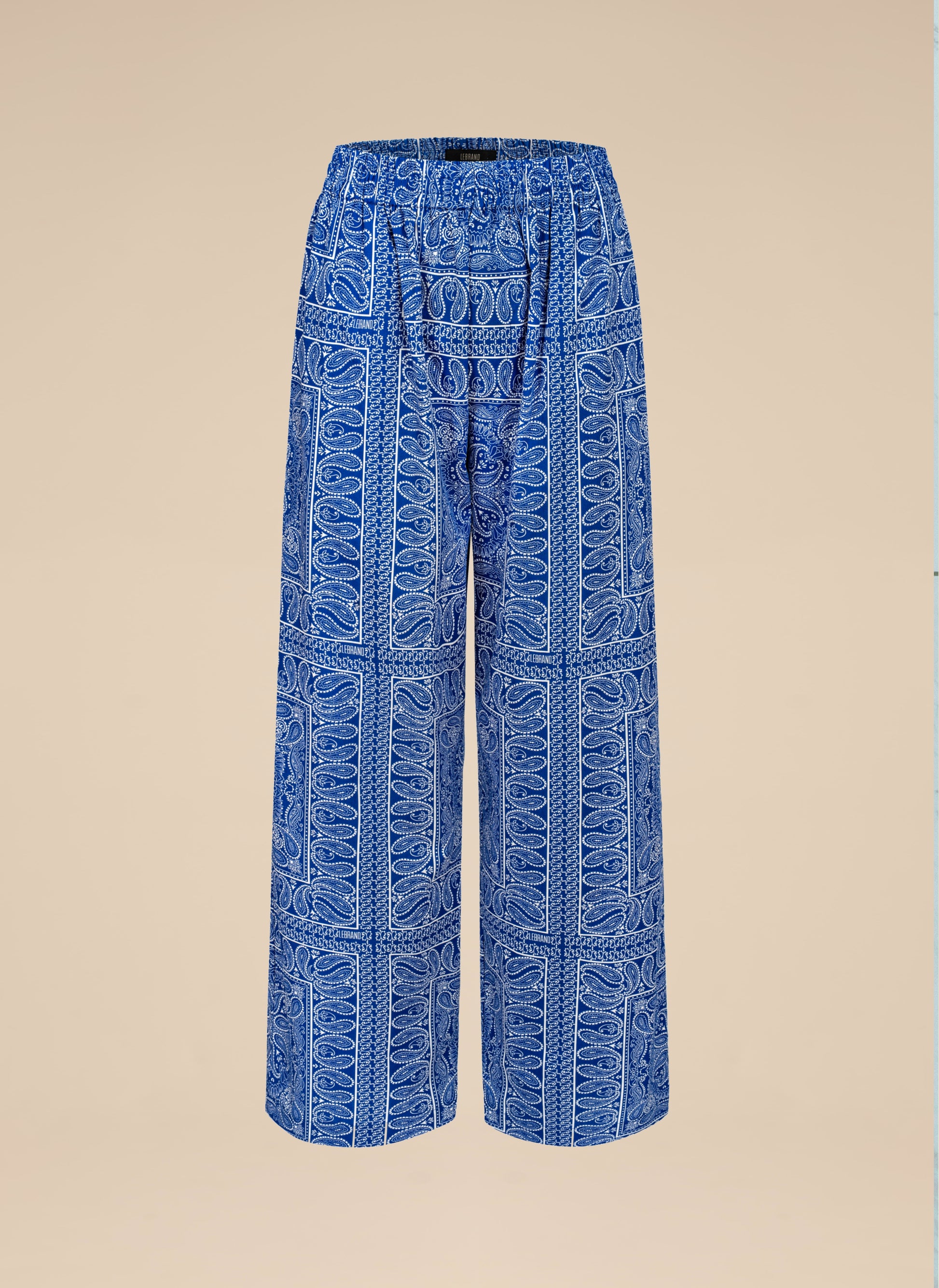 Szerokie spodnie z długimi nogawkami, wykonane z delikatnej bawełny drukowanej w rozpoznawalny wzór bandany w kolorze chabrowym. Posiadają elastyczny pas oraz dwie boczne kieszenie.