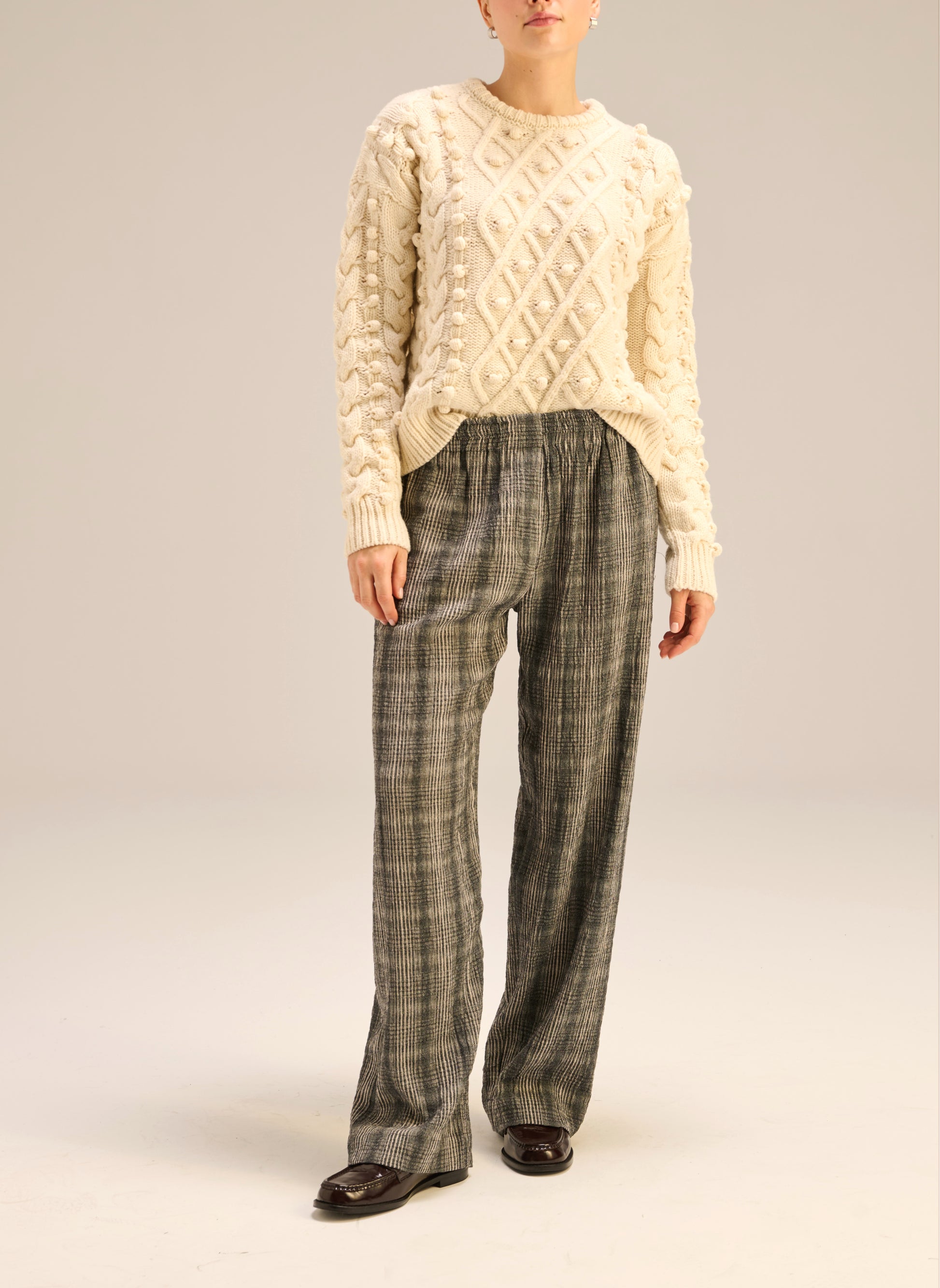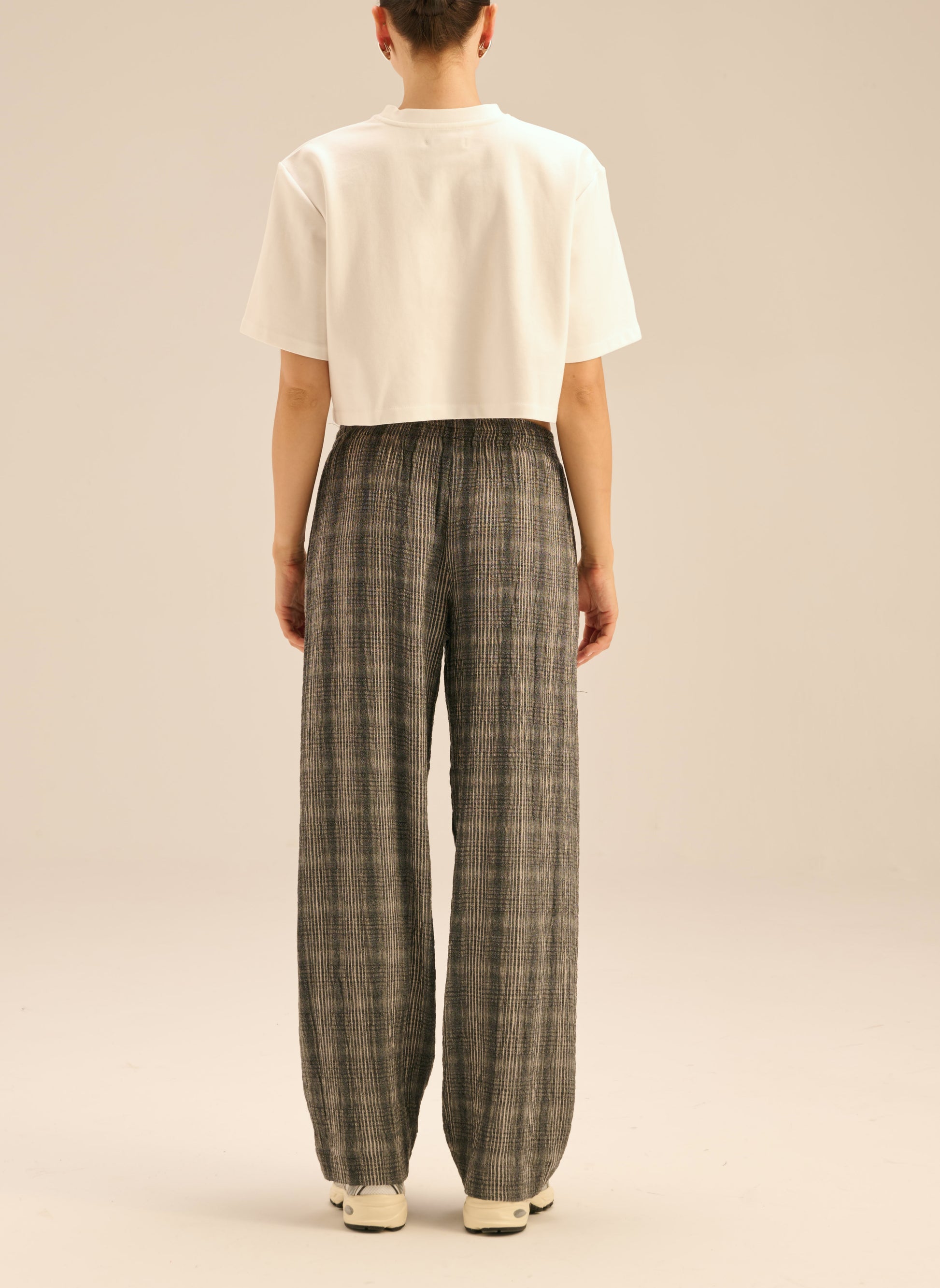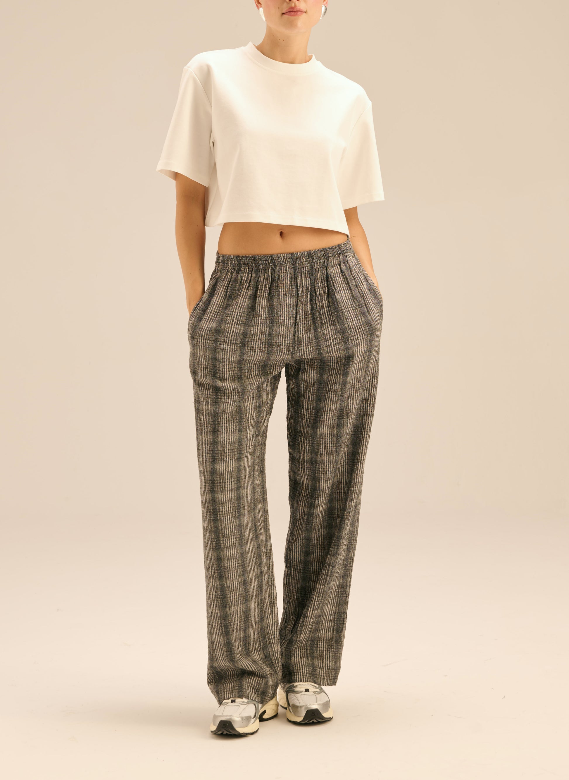 Szerokie spodnie z długimi nogawkami, wykonane z lekkiej tkaniny w kraciasty wzór. Posiadają elastyczny pas oraz dwie kieszenie.
