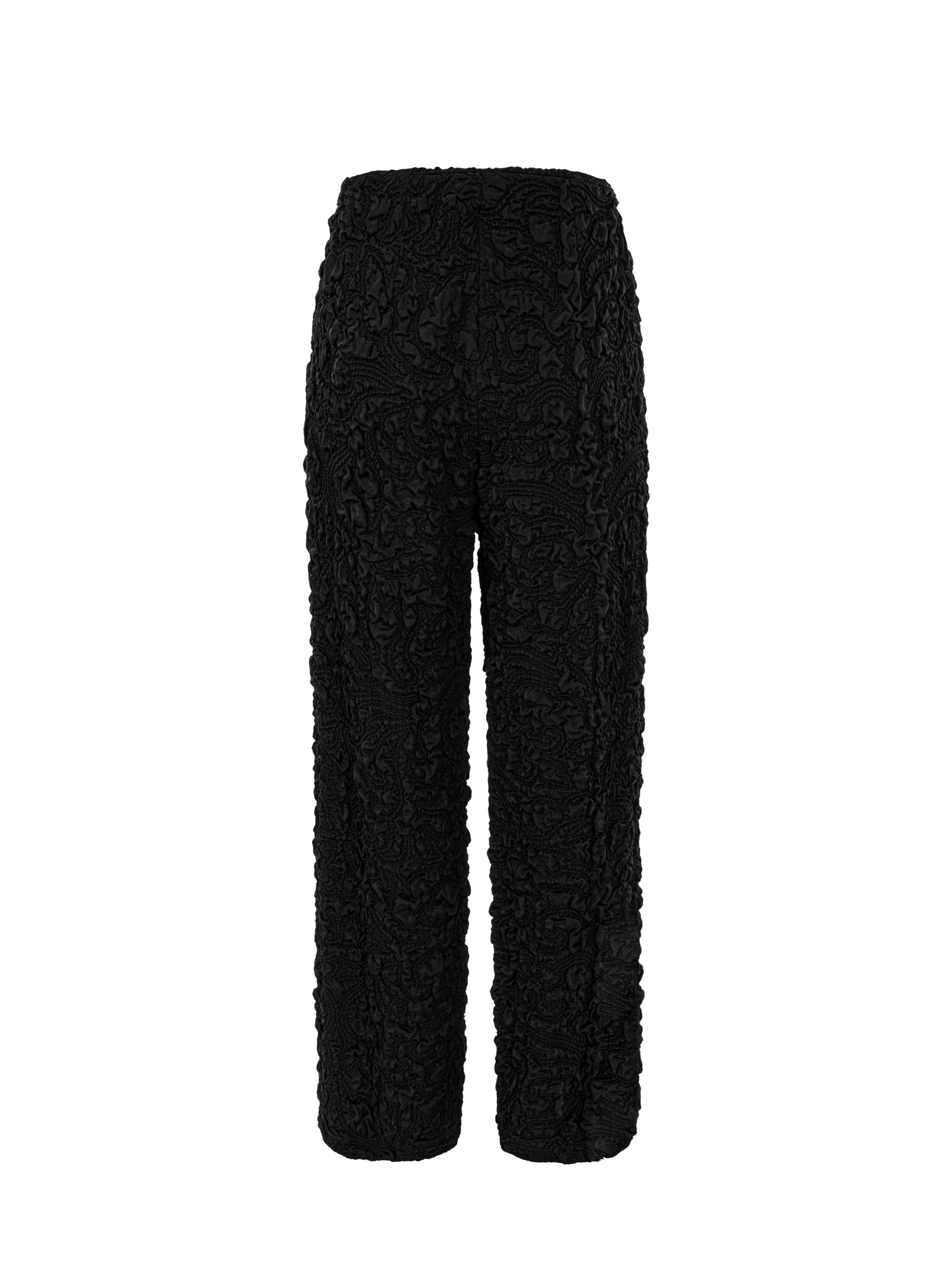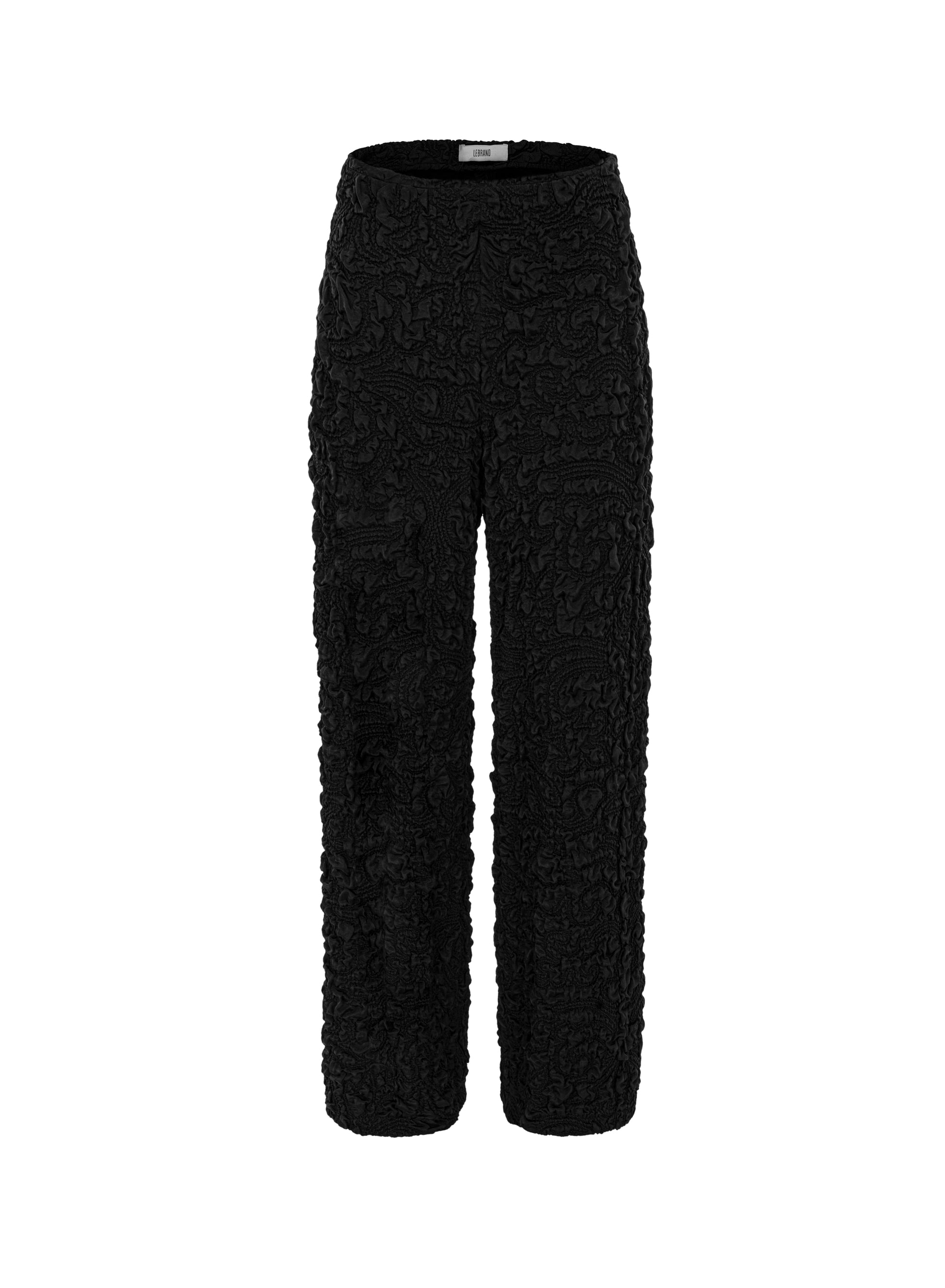 Lekkie spodnie wykonane z elastycznego materiału w kolorze głębokiej czerni o teksturze bubble. Posiadają proste, długie nogawki i podwyższony stan.