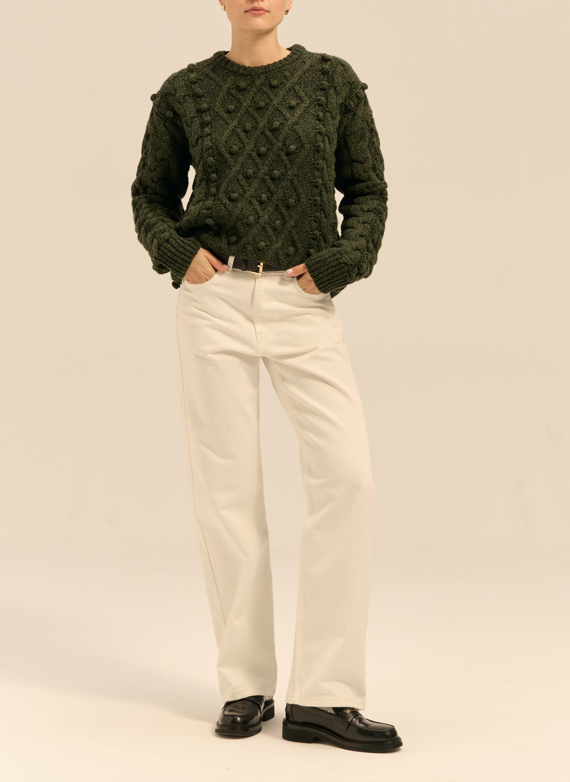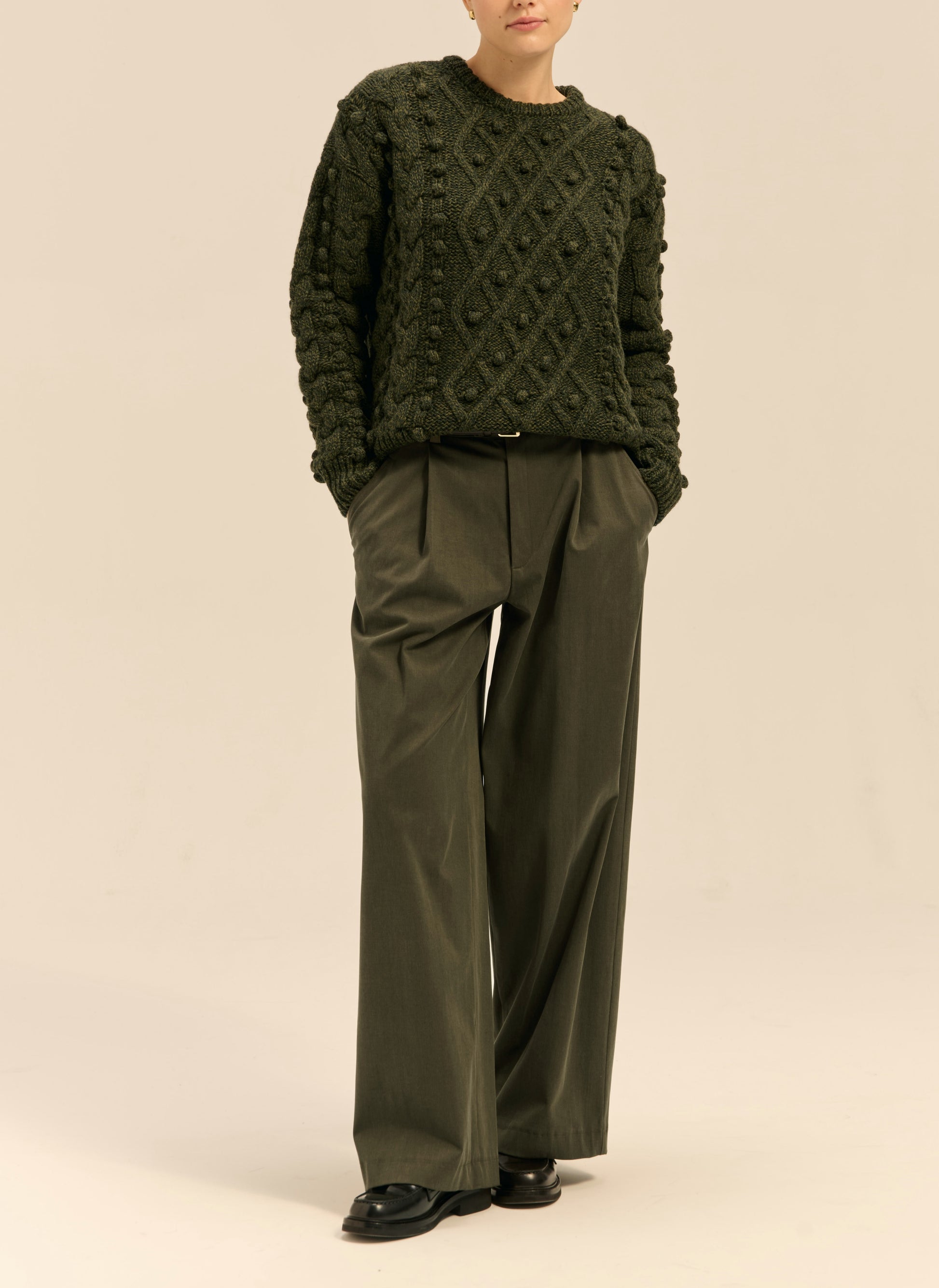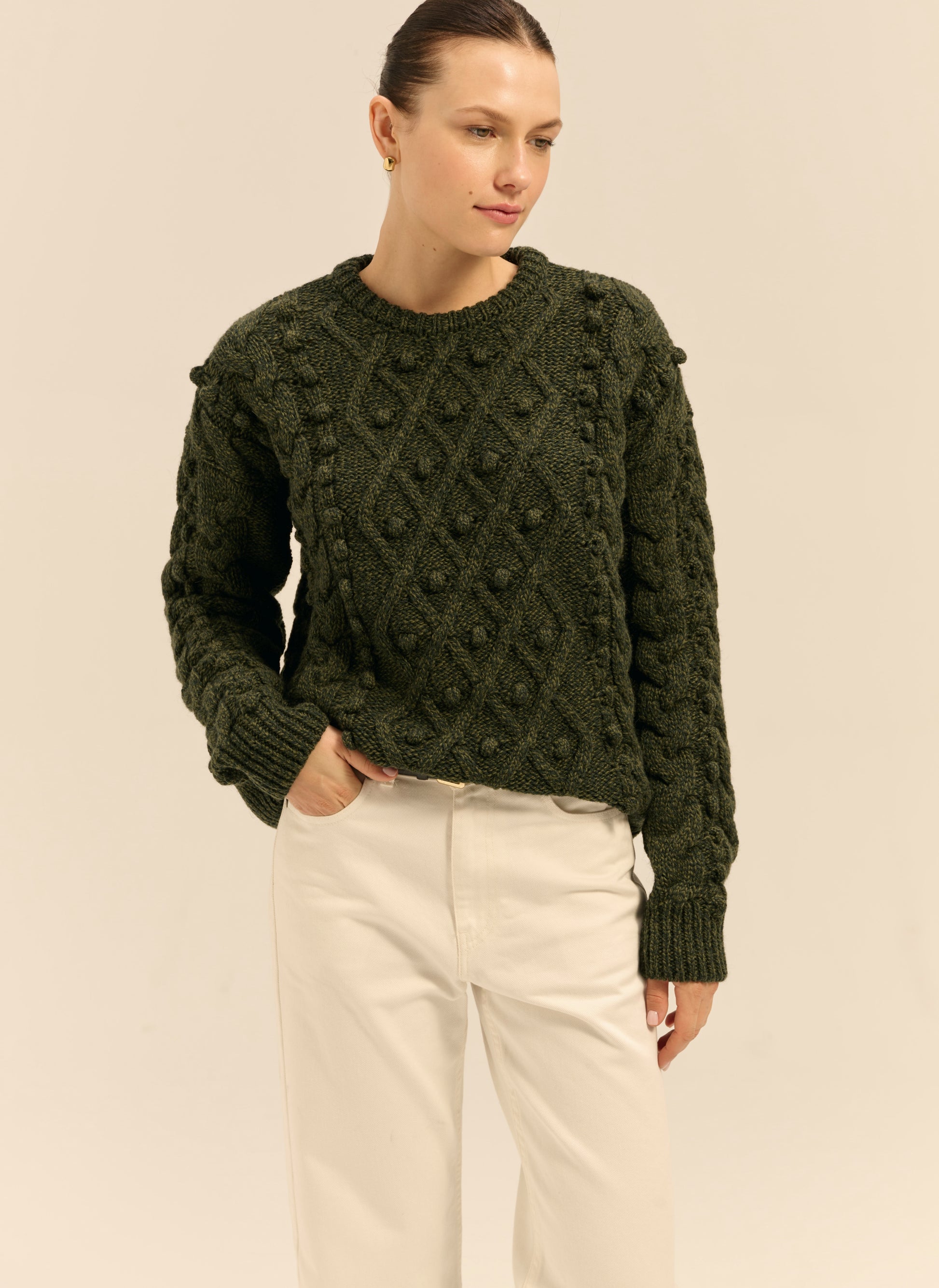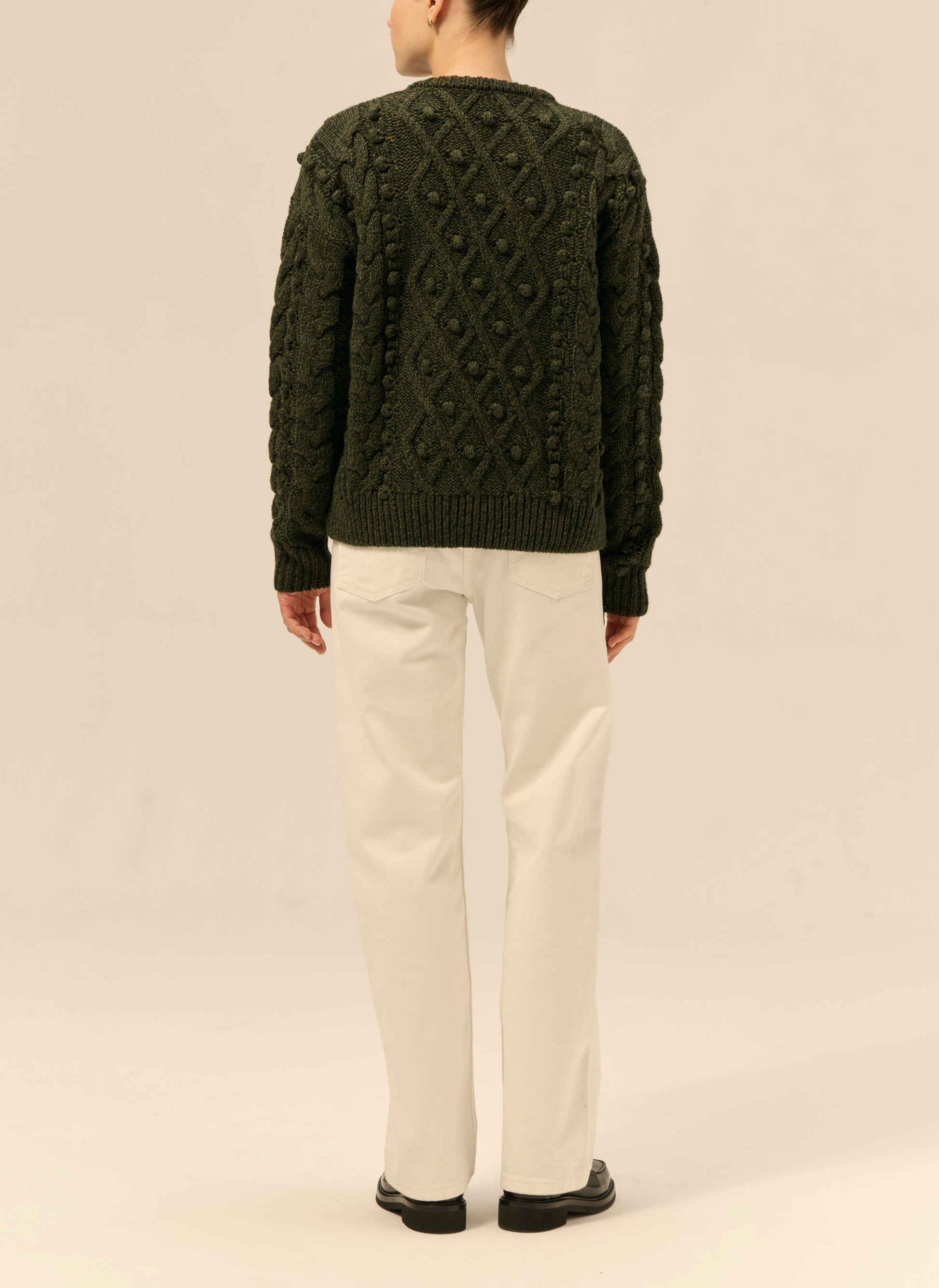 Sweter o luźnym, pudełkowym kroju wykonany w całości z miękkiej wełny w zielonym kolorze. Posiada ściągacz przy rękawach i na dole, wyraźny splot zdobiony kuleczkami oraz okrągły dekolt.