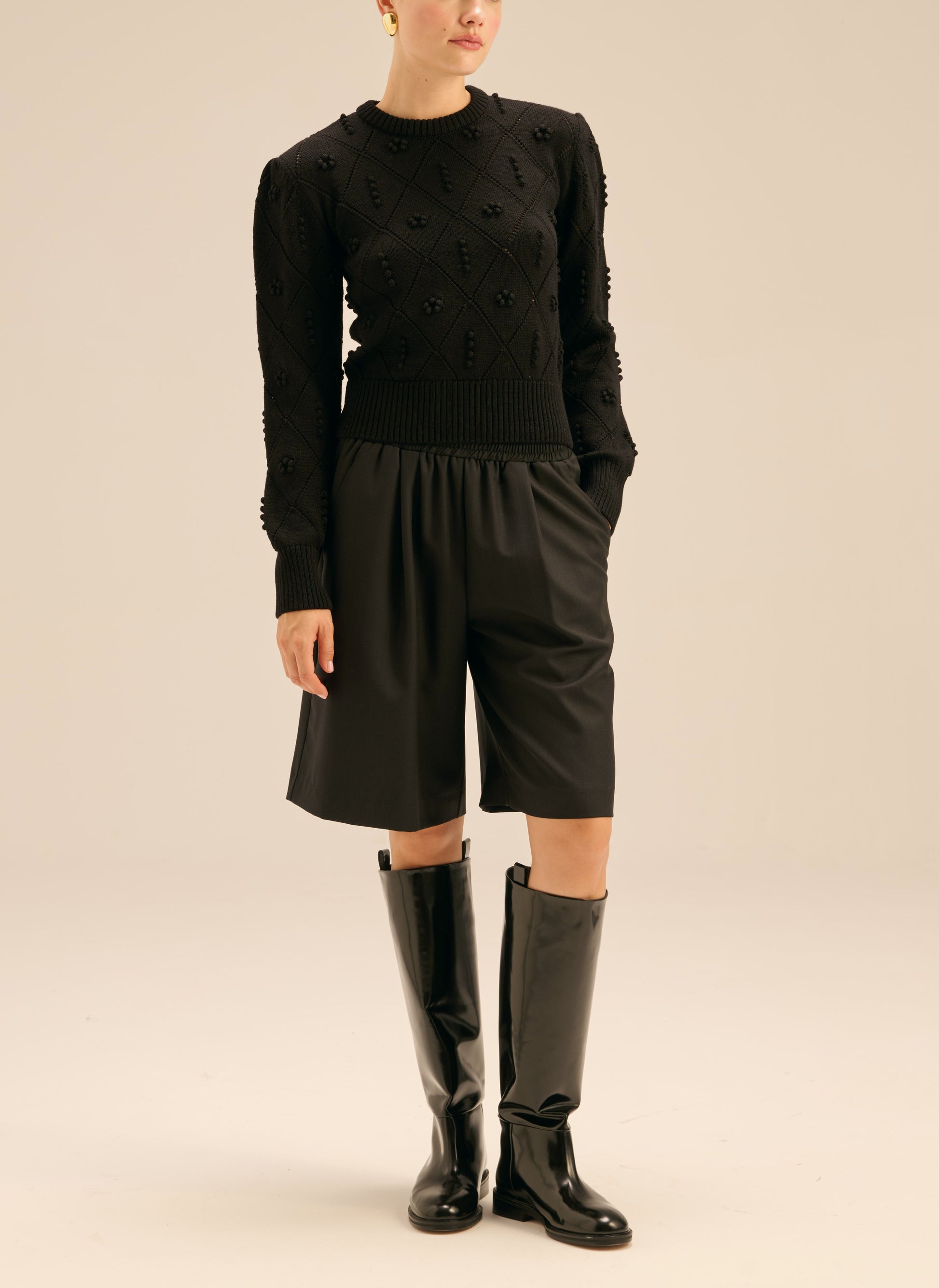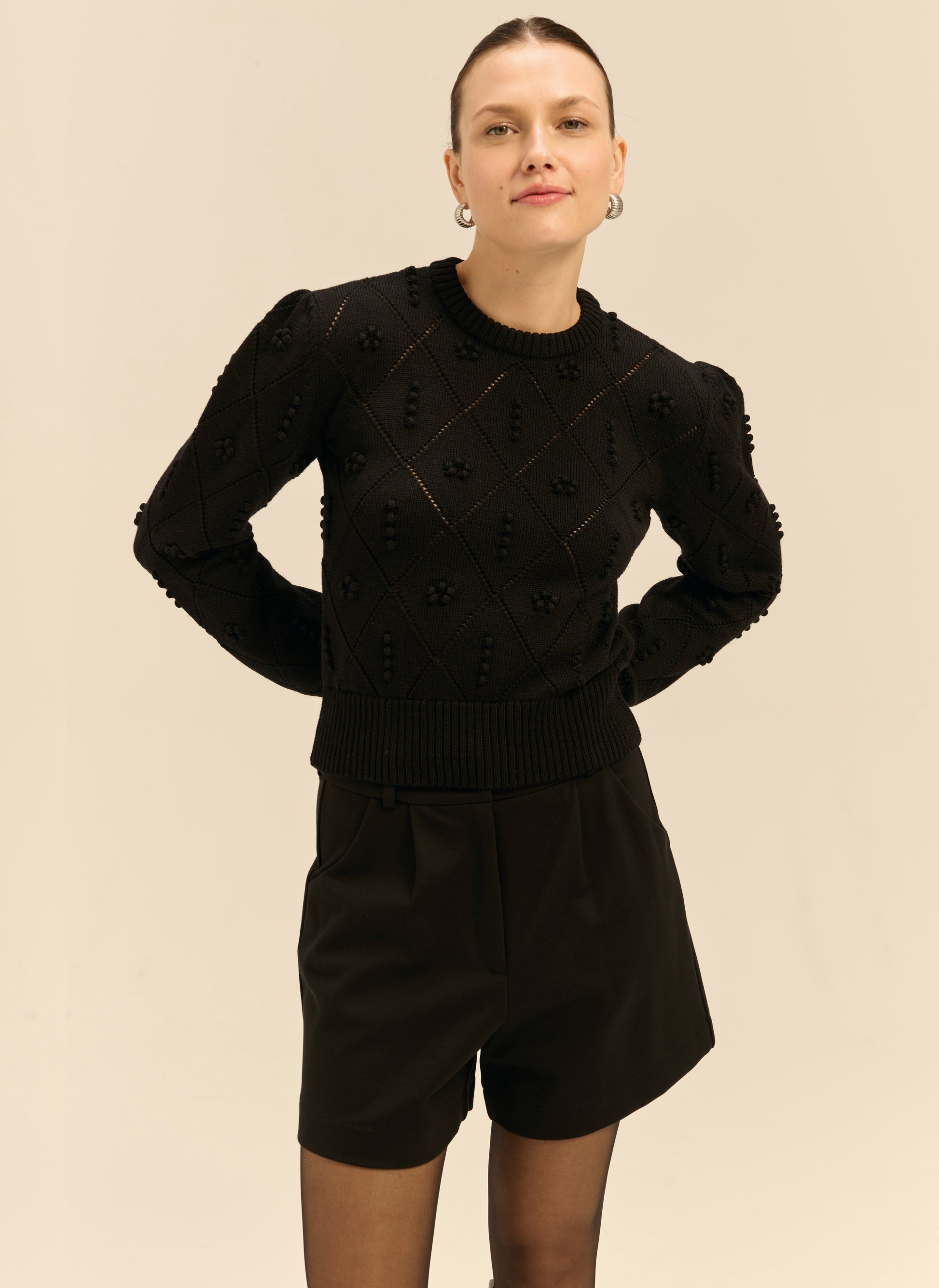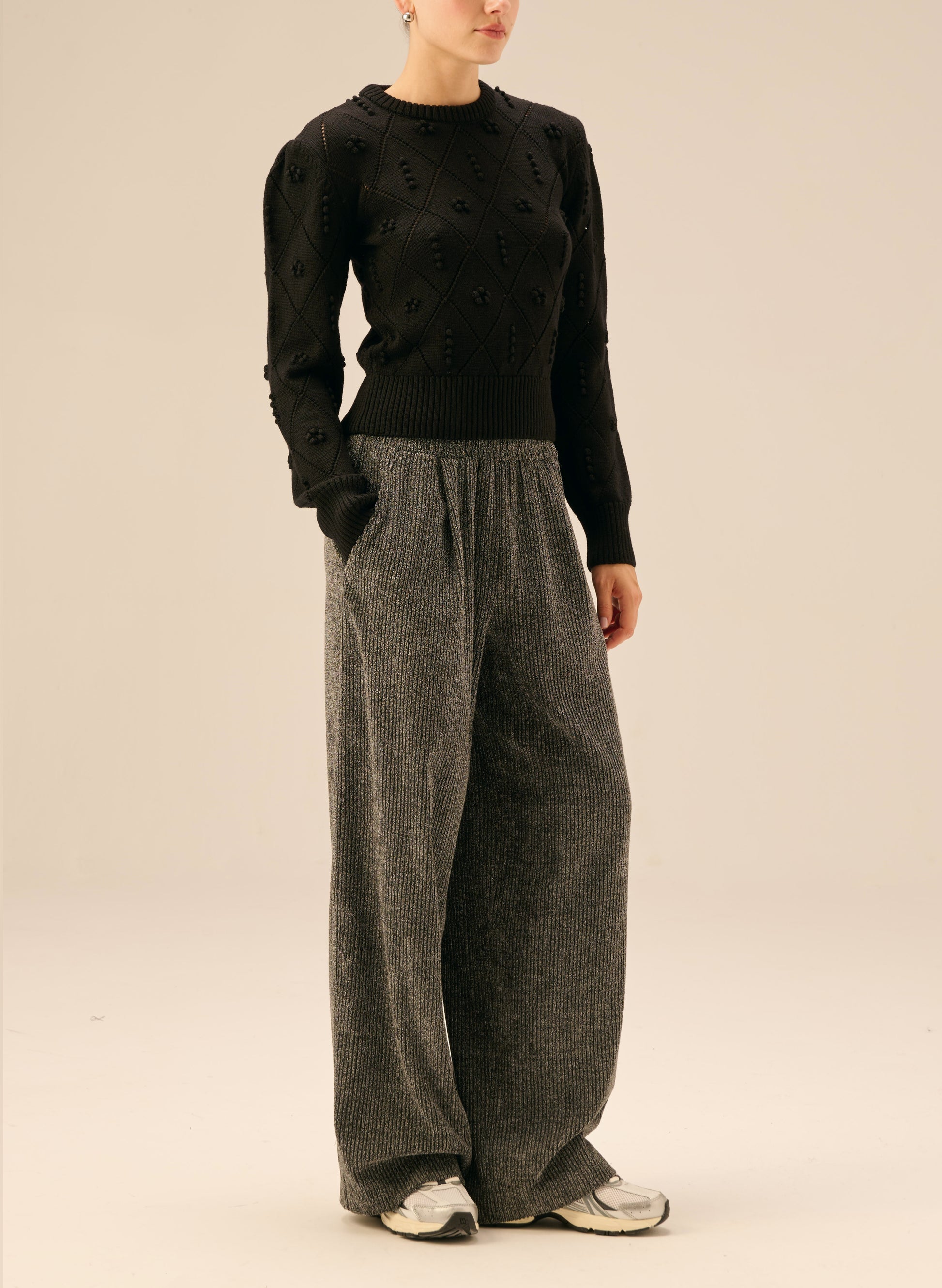 Sweter o dopasowanym kroju wykonany w całości z miękkiej wełny o wyraźnym splocie zdobionym kuleczkami oraz okrągły dekolt. Posiada okrągły dekolt oraz ściągacz przy rękawach i na dole.