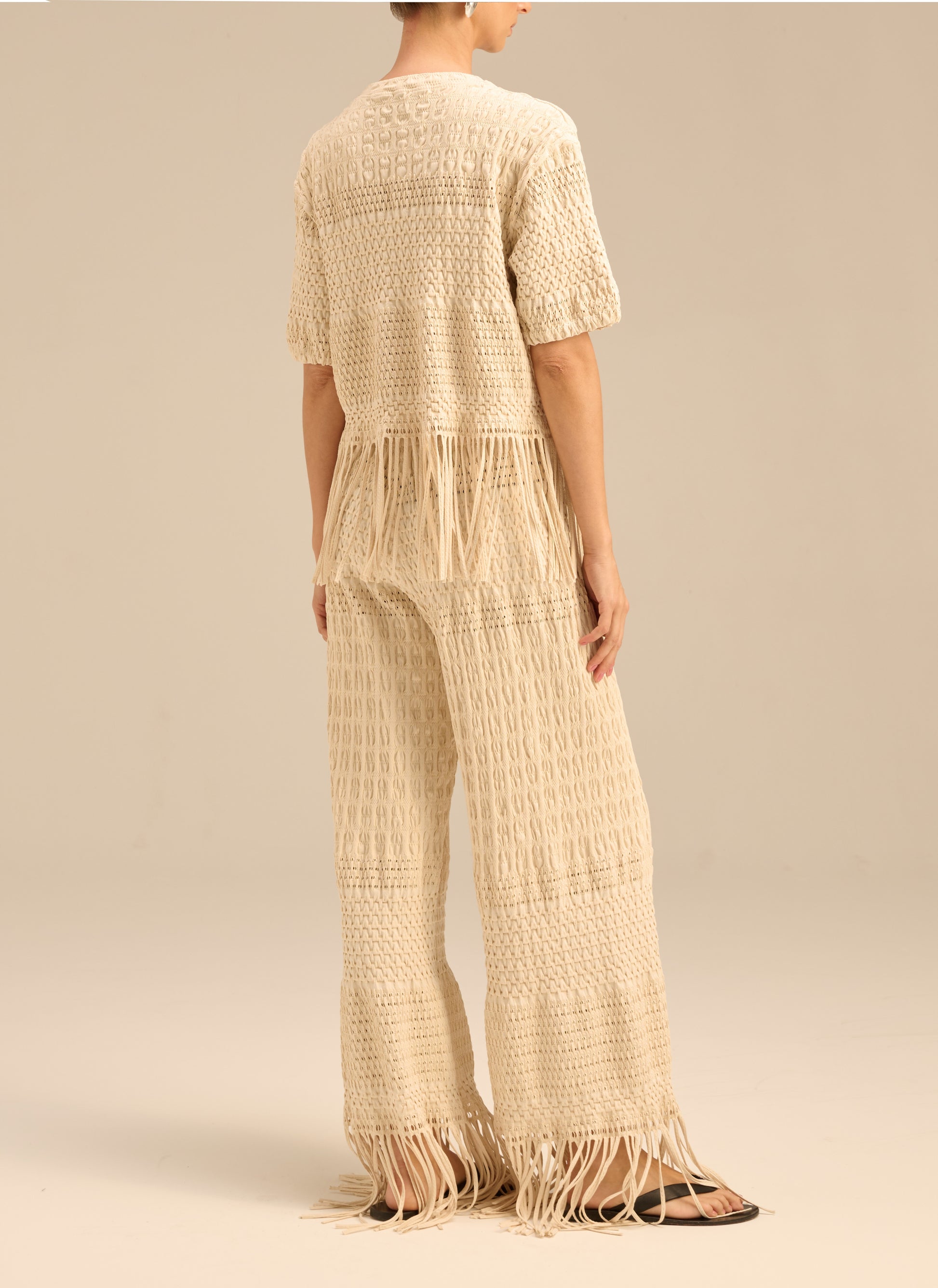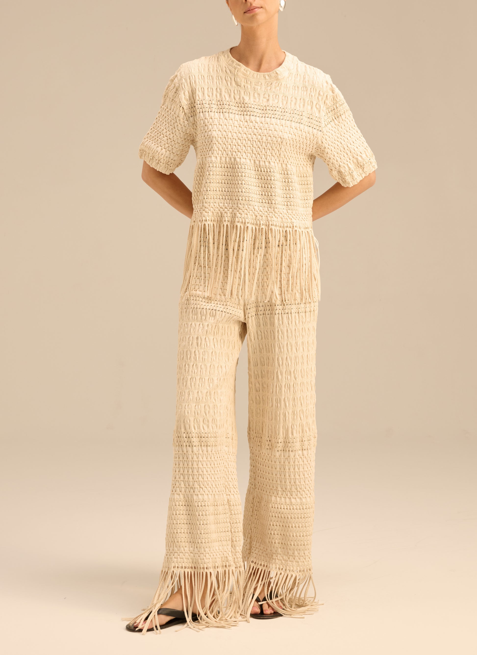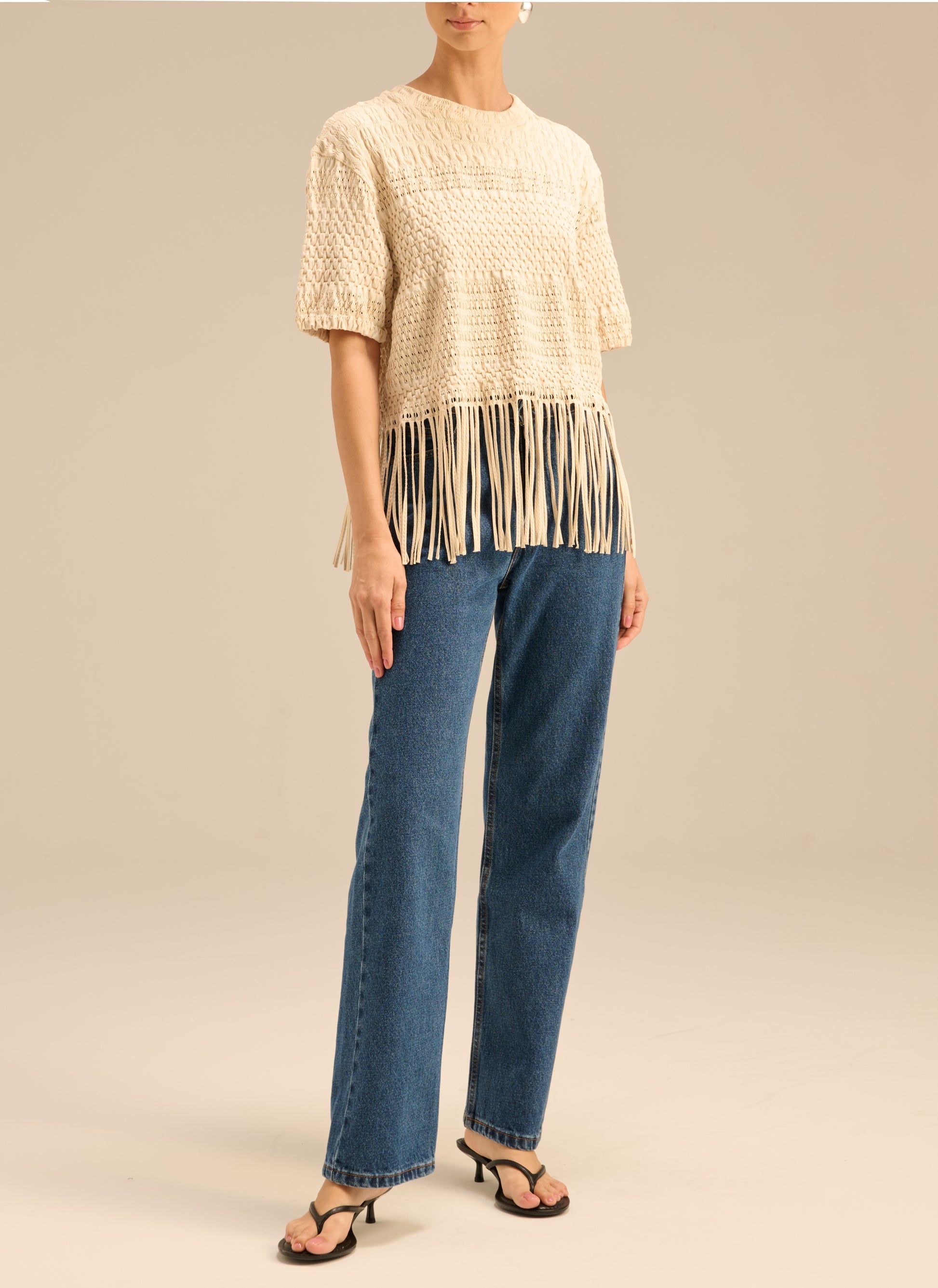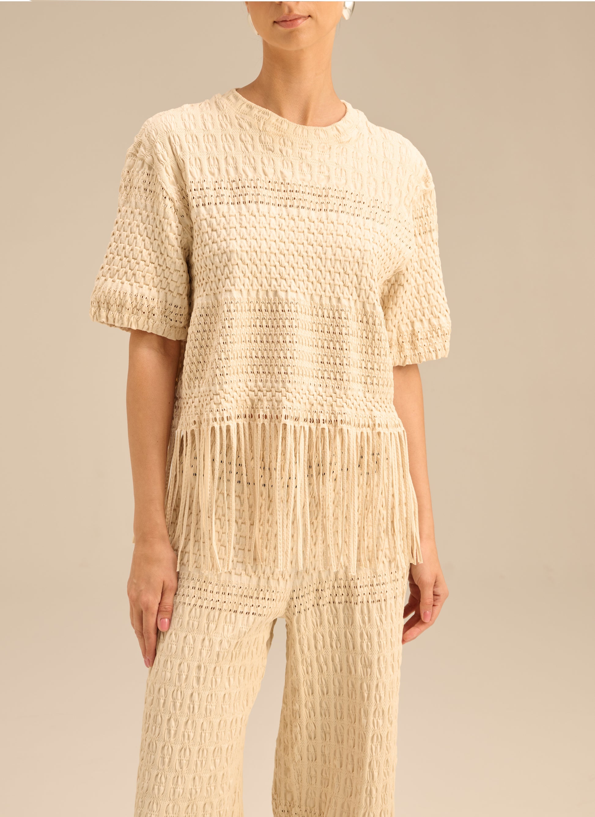 Koszulka o luźnym kroju, wykonana z elastycznego materiału o teksturze splotu w kolorze ecru. Posiada dół zakończony frędzlami, krótkie rękawy, ściągacz przy szyi oraz okrągły dekolt.