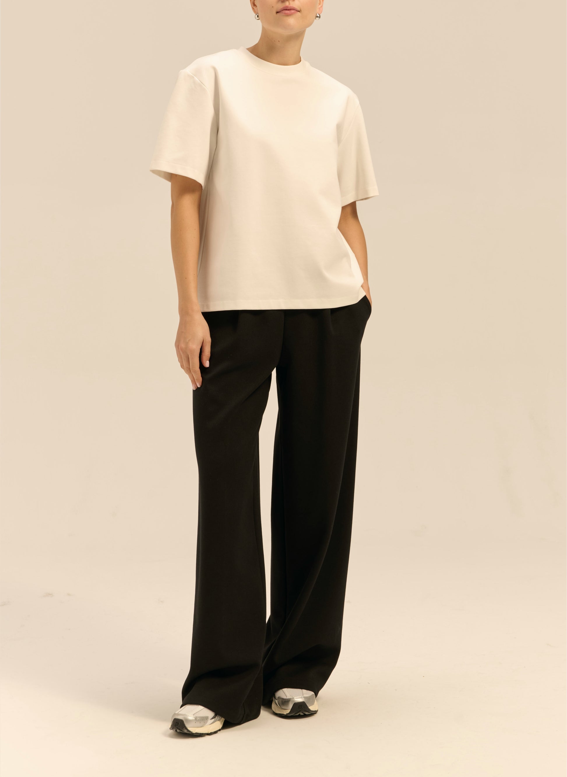 T-shirt o kroju oversize, wykonany z miękkego jerseyu. Posiada okrągły dekolt i rękawy przed łokieć.