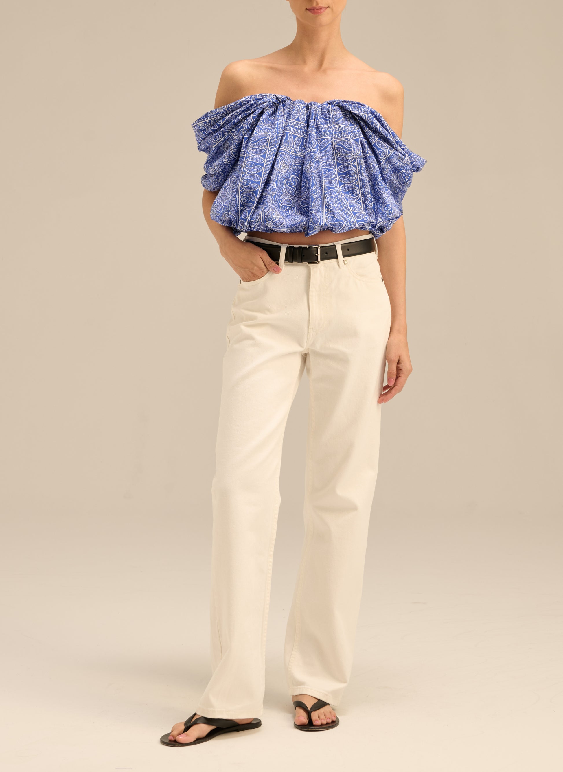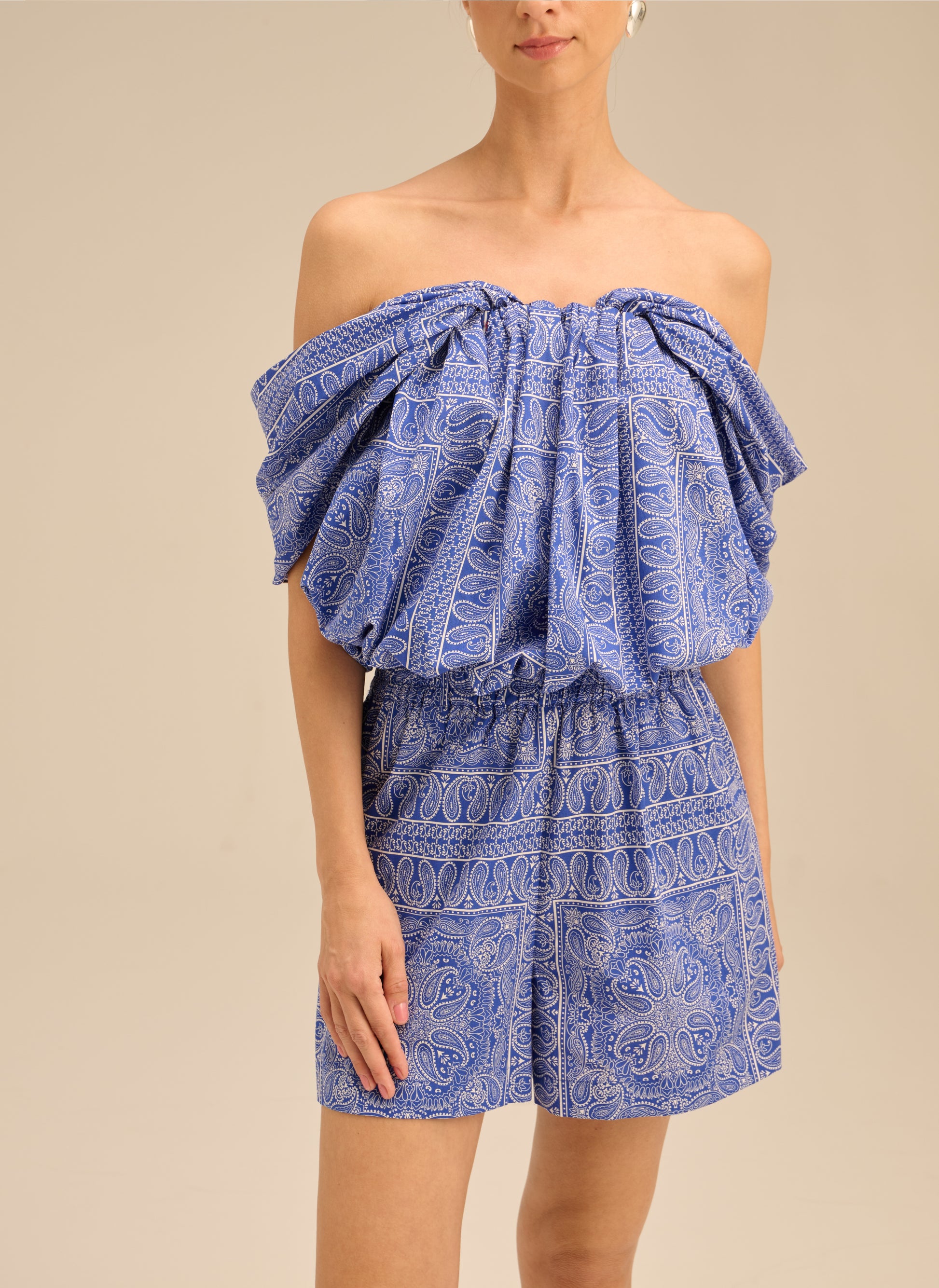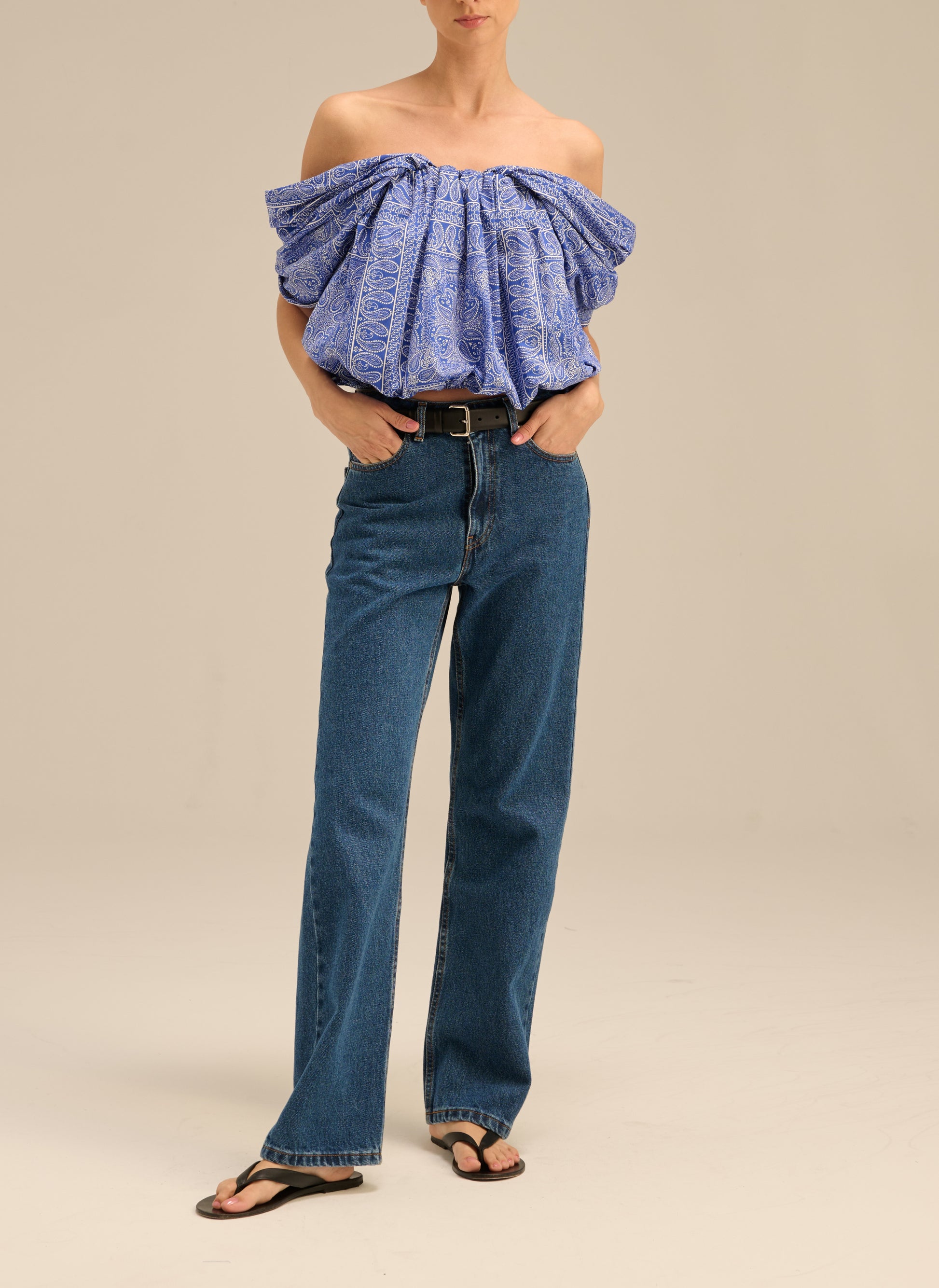 Top o kroju bombki z odsłoniętymi ramionami chabrowa z printem - Yena