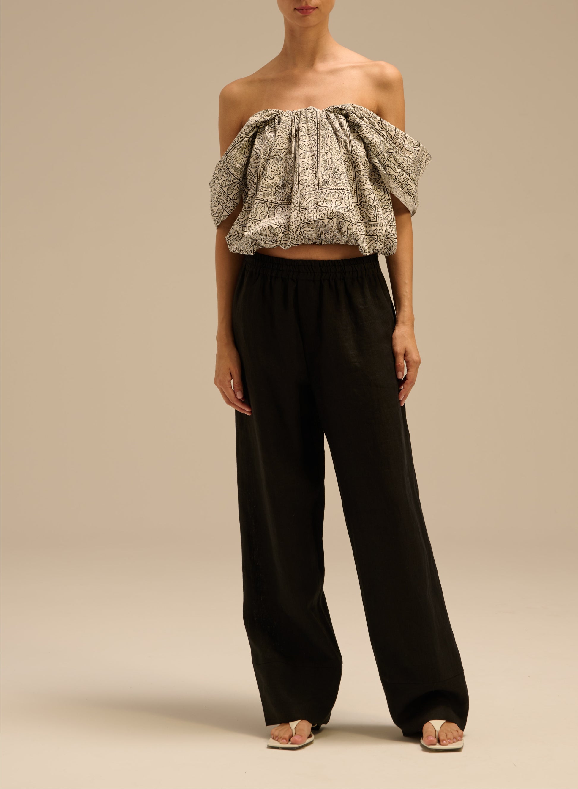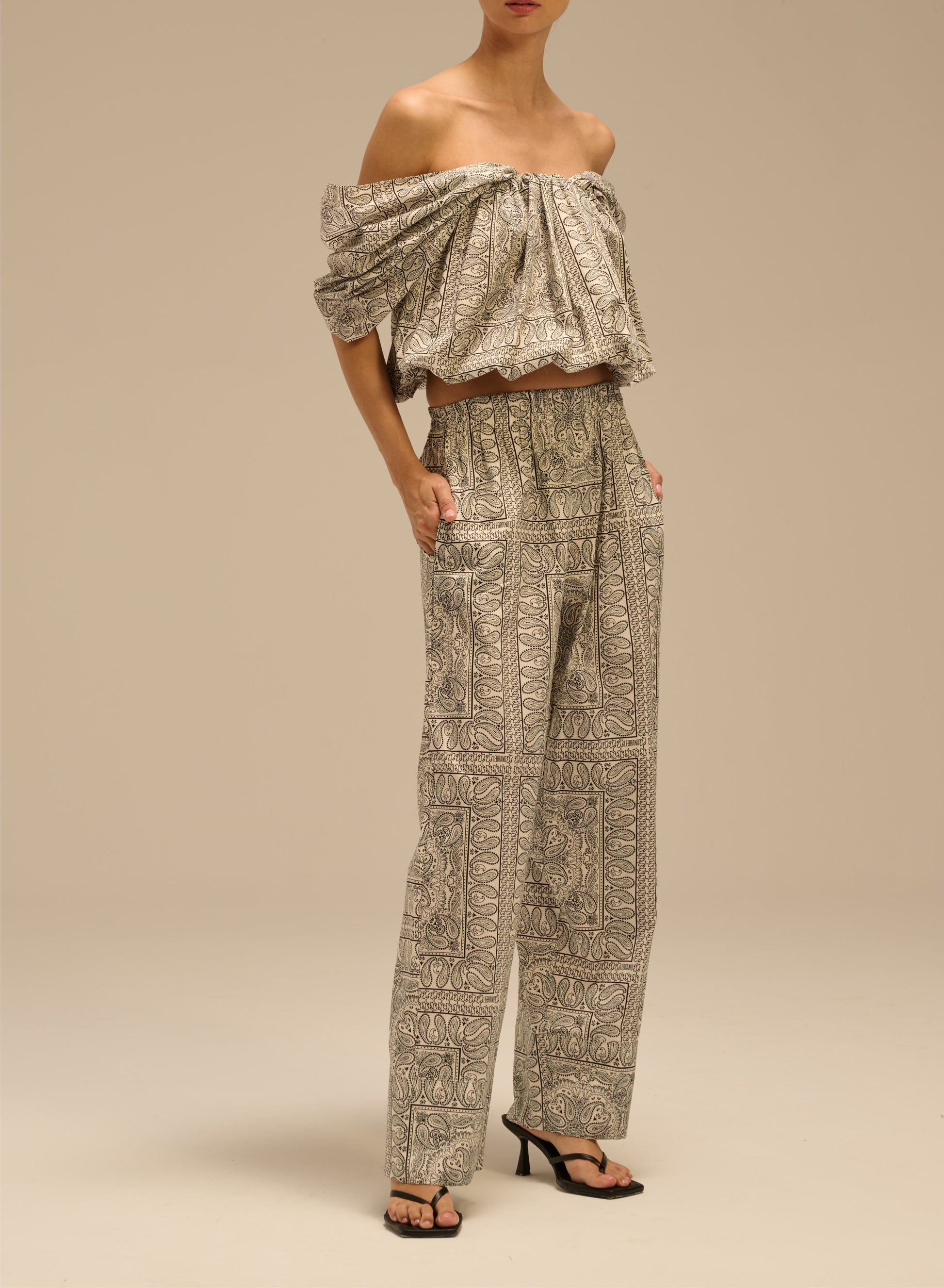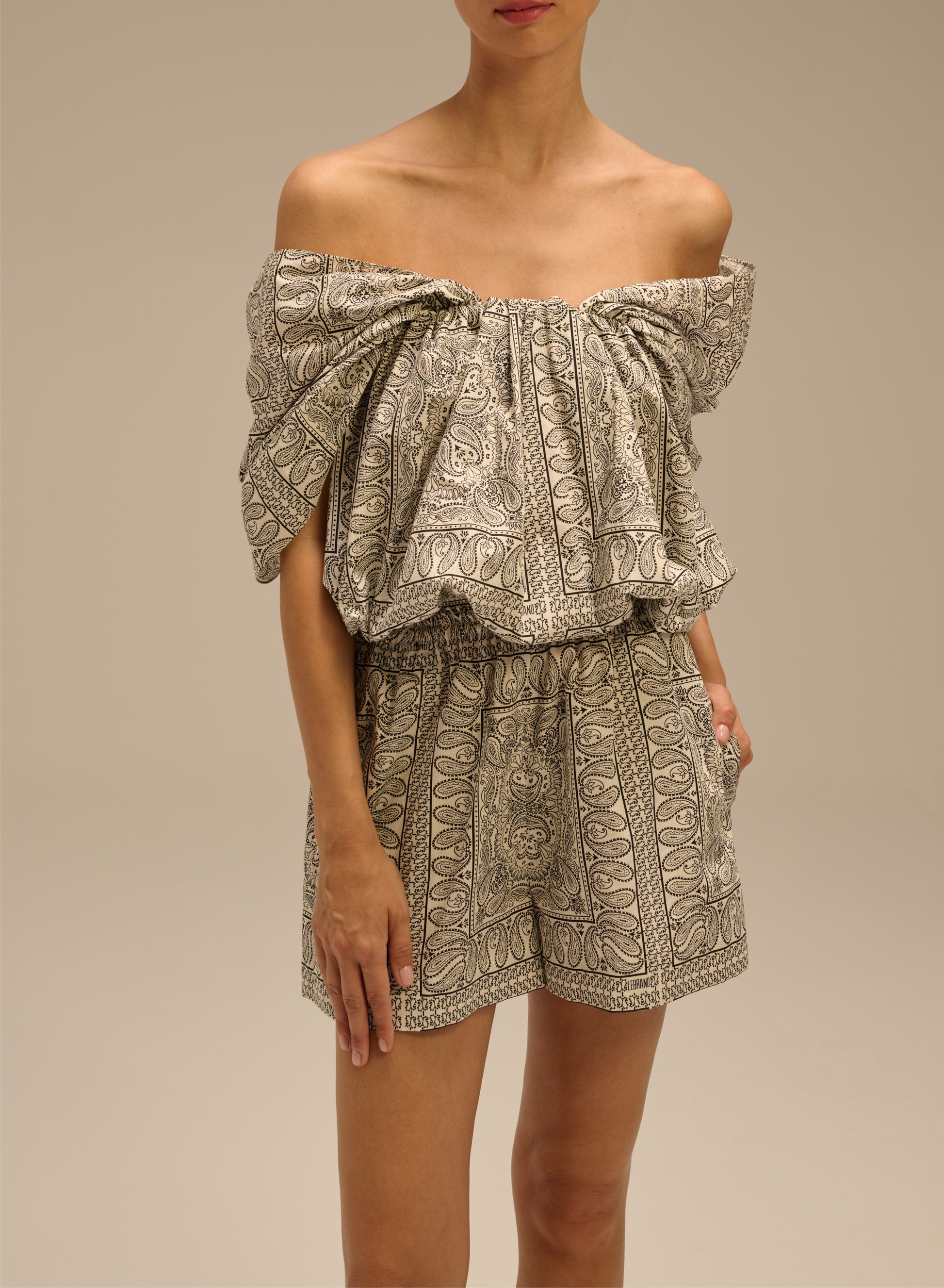 Top o kroju bombki z odsłoniętymi ramionami ecru z printem - Yena