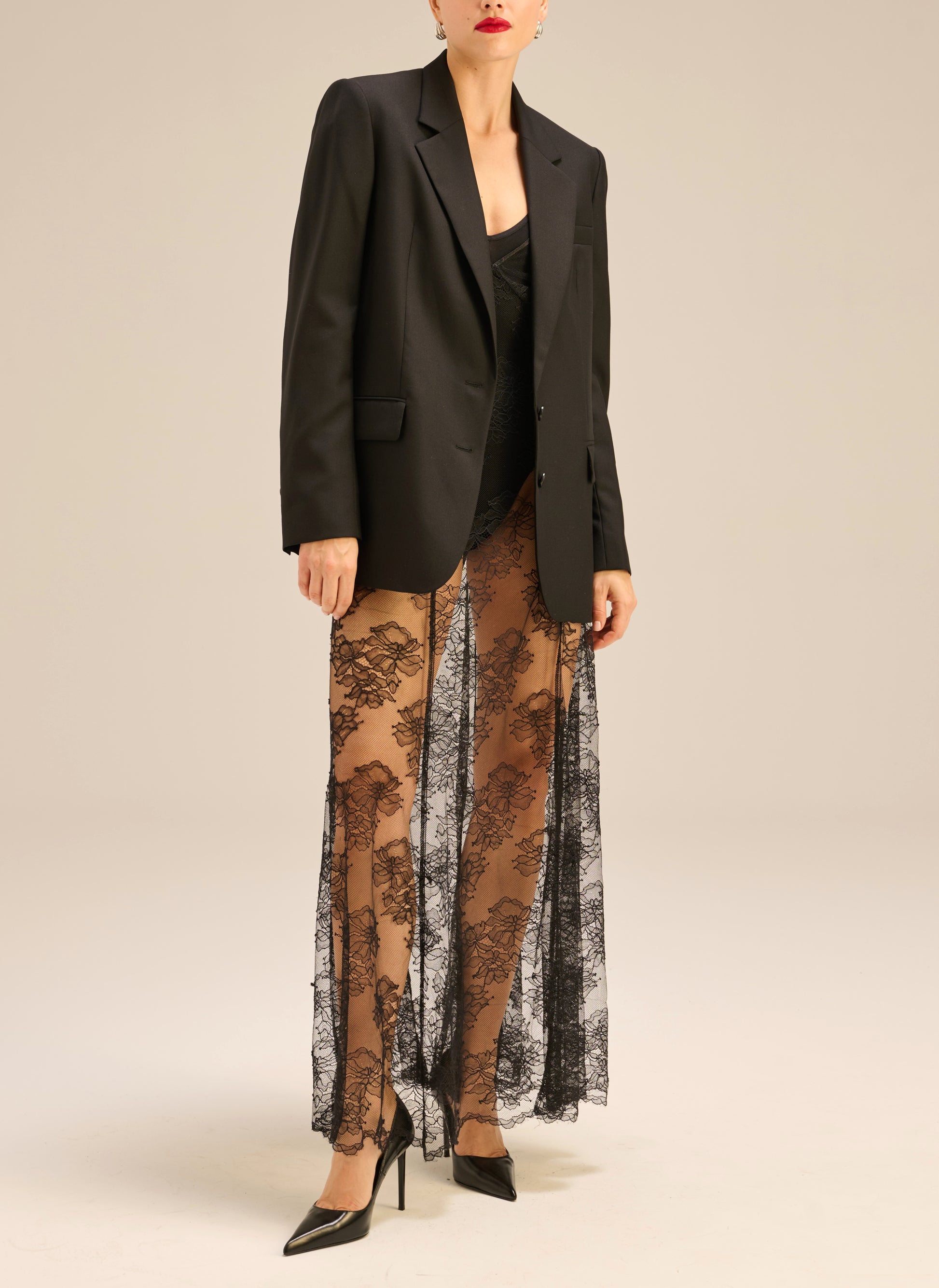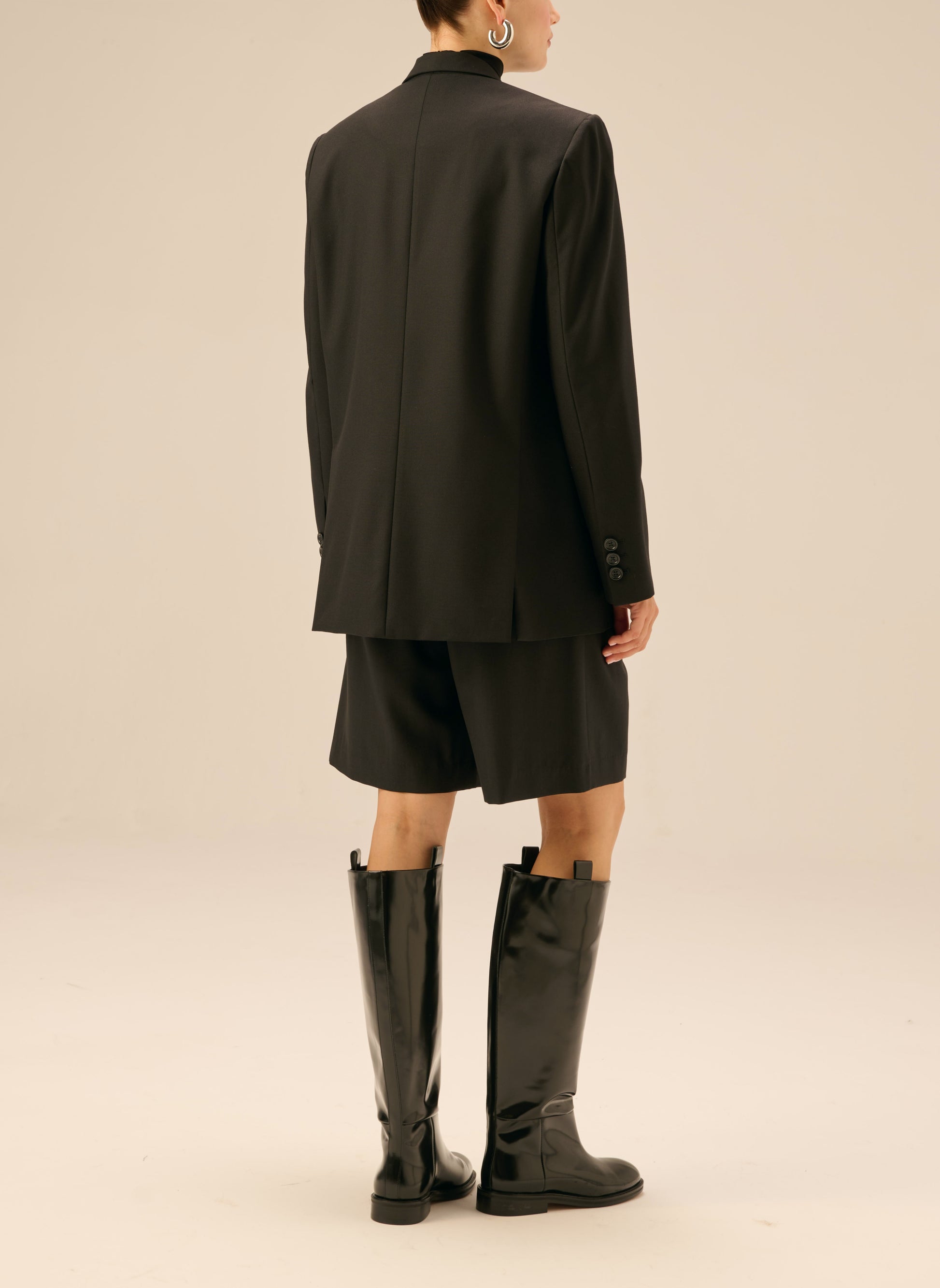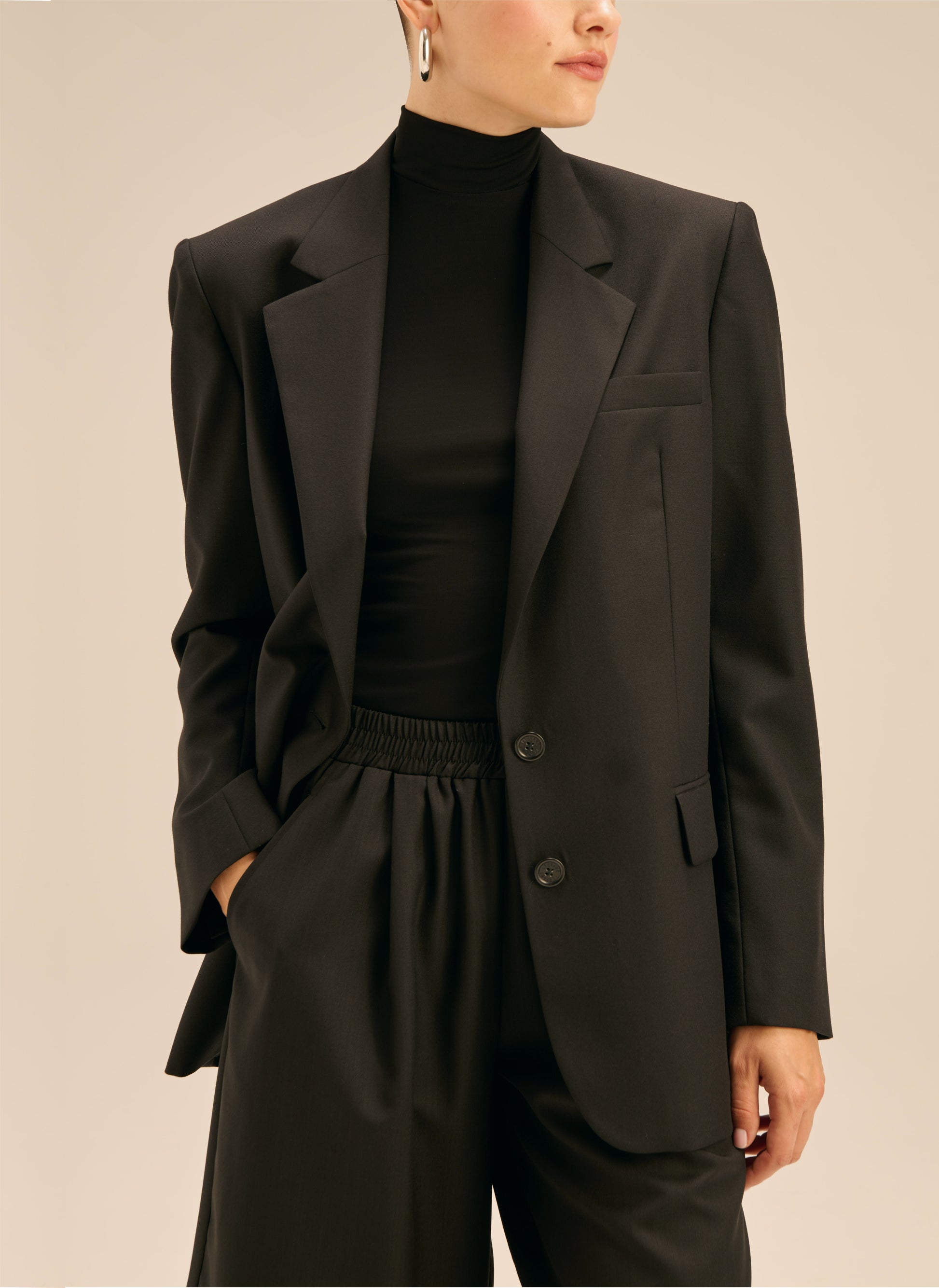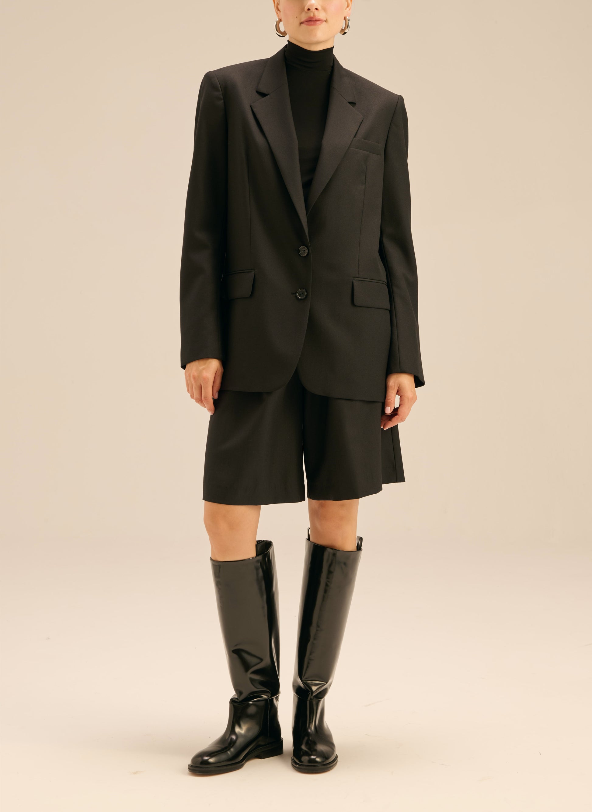 Ponadczasowy model wełnianej marynarki o luźnym kroju i szerokich ramionach, w czarnym kolorze. Zapinana na dwa guziki, posiada trójkątne klapy, kieszenie z patkami i pełną podszewkę.