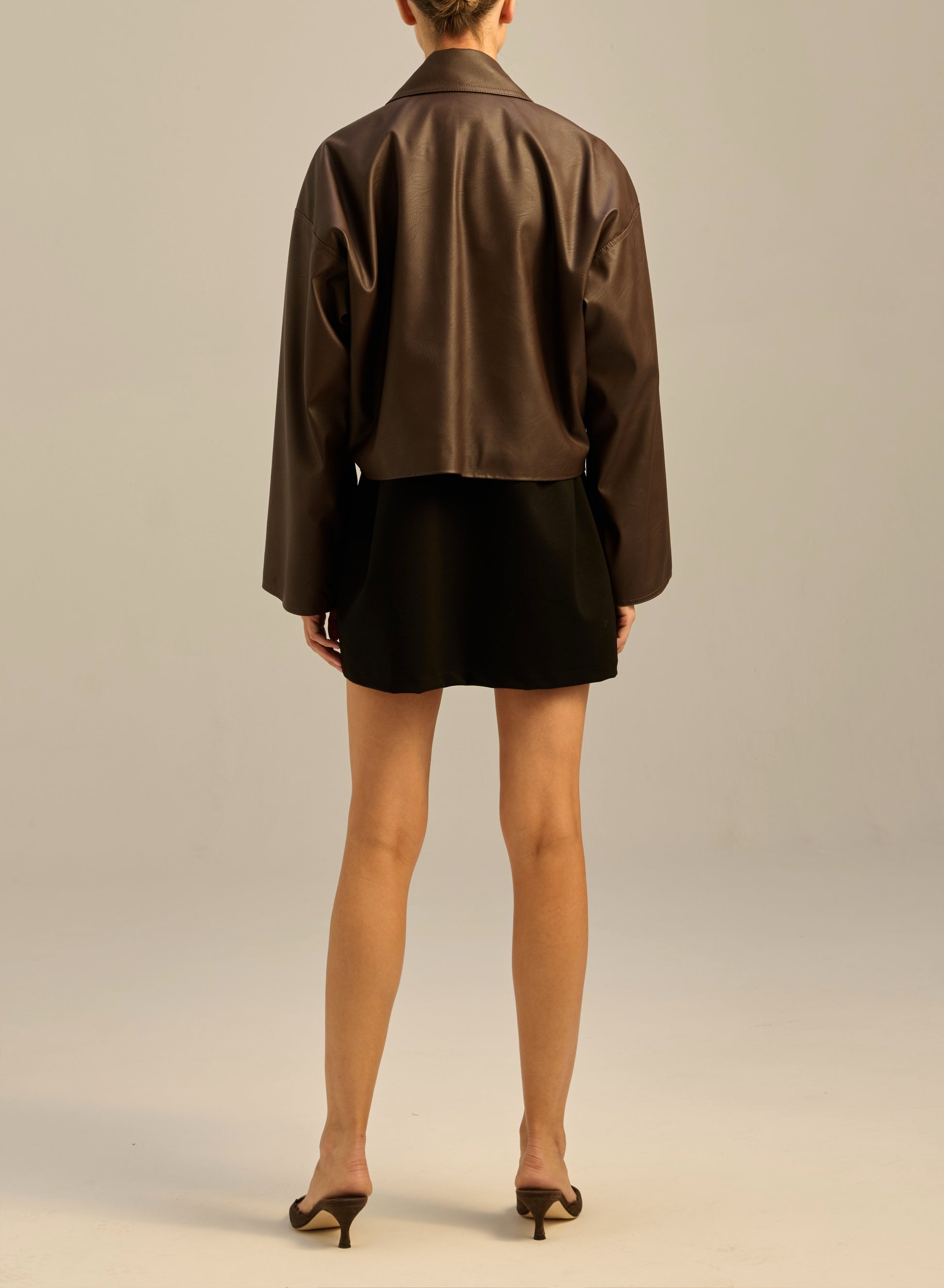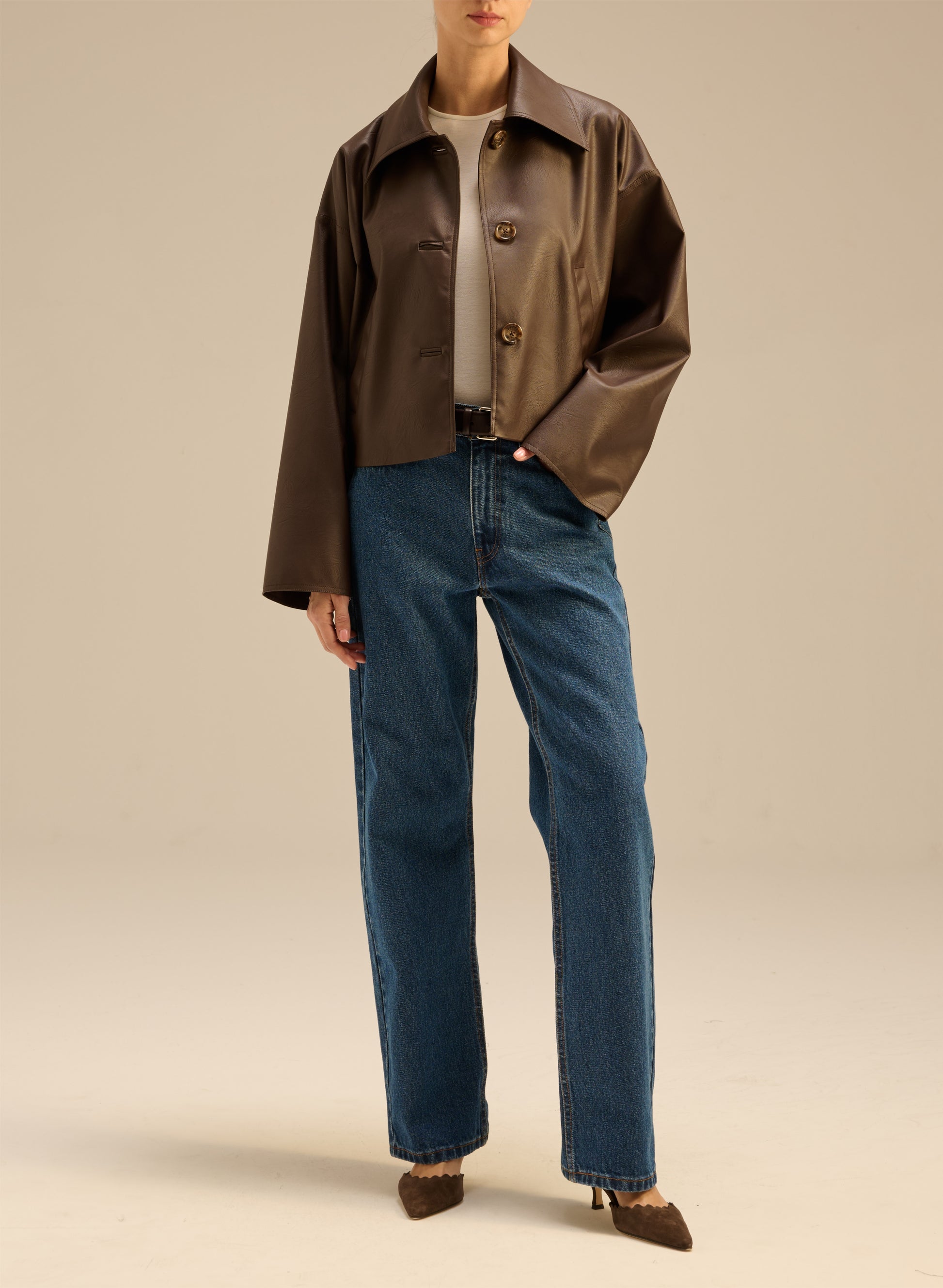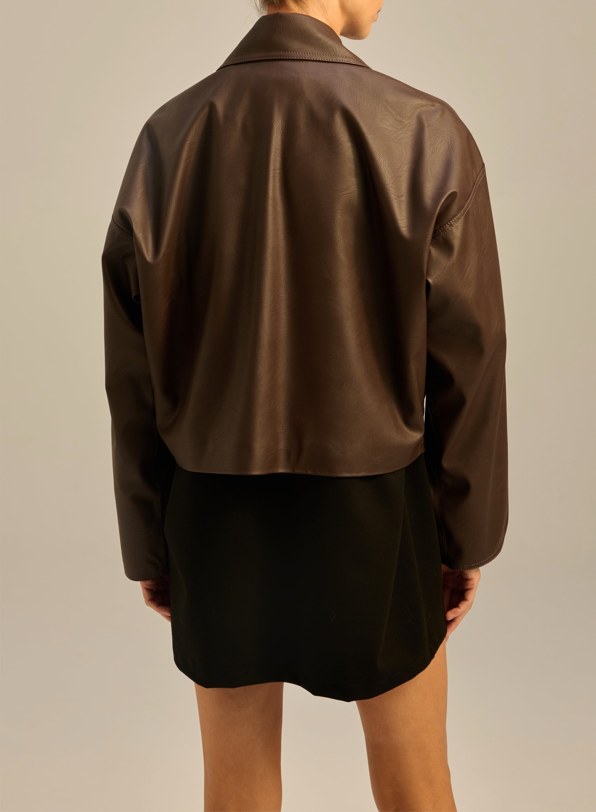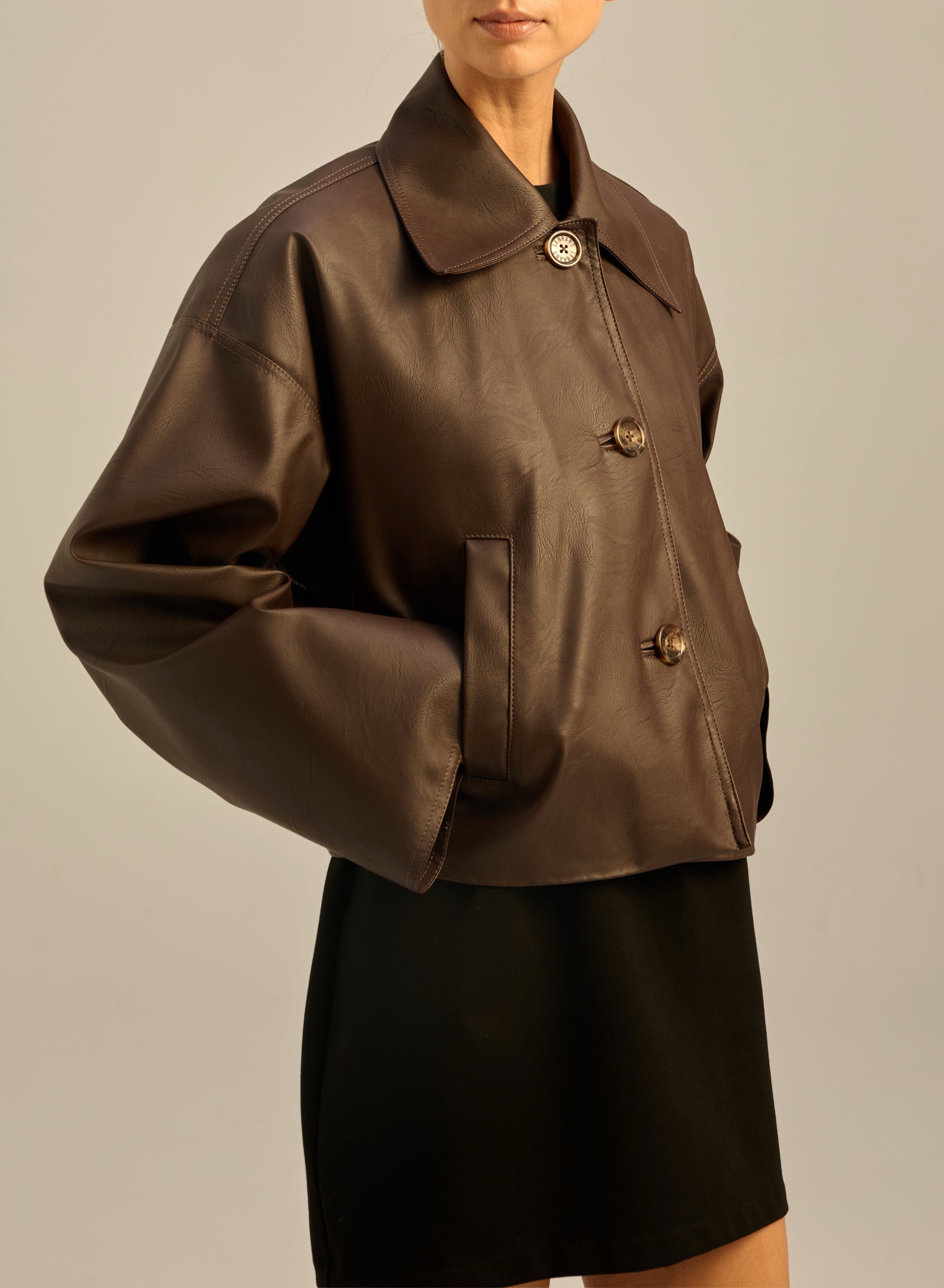Krótka kurtka o kroju pudełkowym wykonana z eko skóry w kolorze brązowym. Posiada klasyczny kołnierzyk, zapięcie na guziki, dwie wsuwane boczne kieszenie oraz pudełkowy fason i długie, szerokie rękawy.