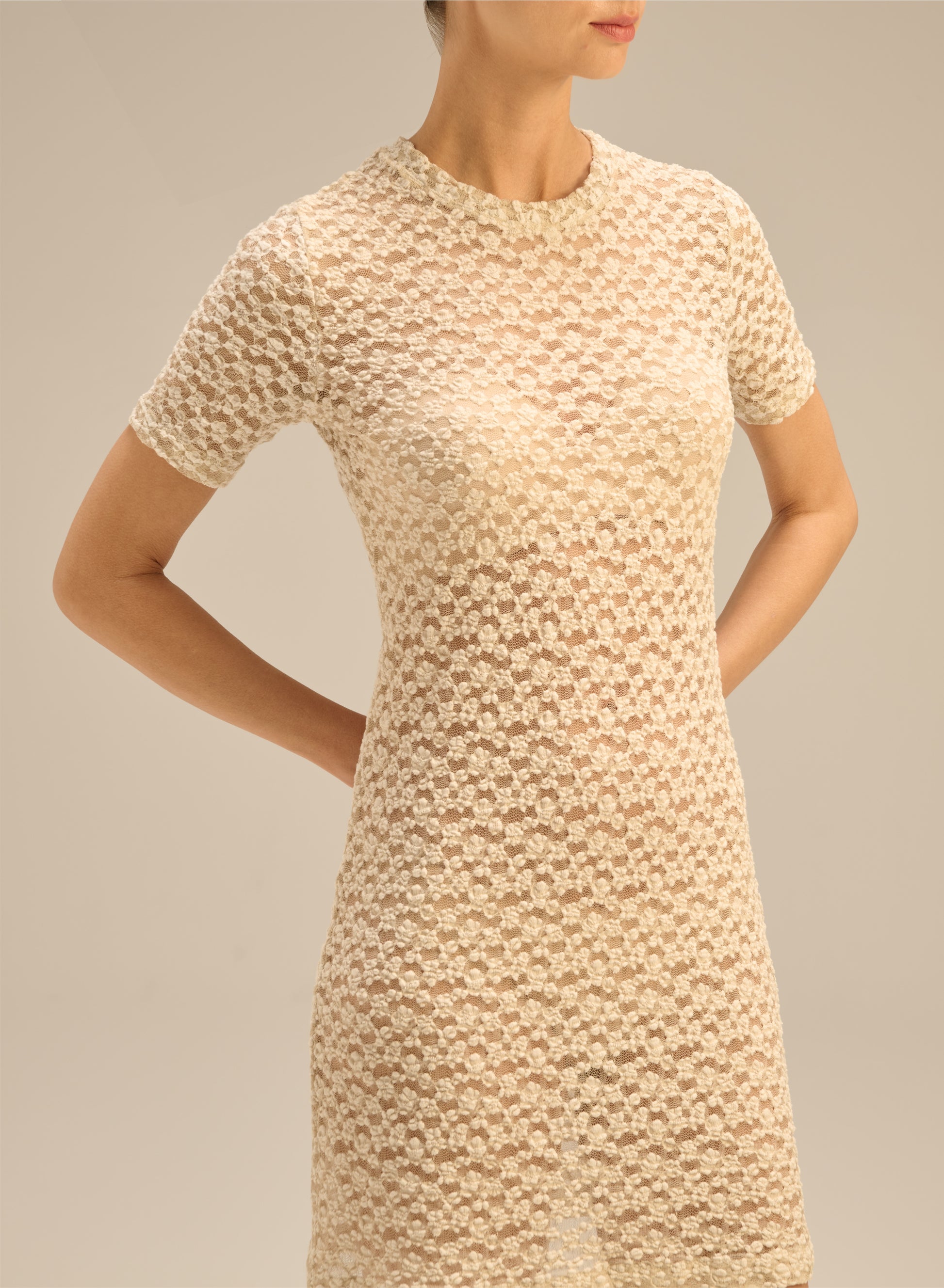 Sukienka o dopasowanym kroju i długości nad kolano. Wykonana z elastycznego, koronkowego materiału o strukturze kwiatowej w kolorze ecru. Posiada krótsze rękawy i okrągły dekolt.