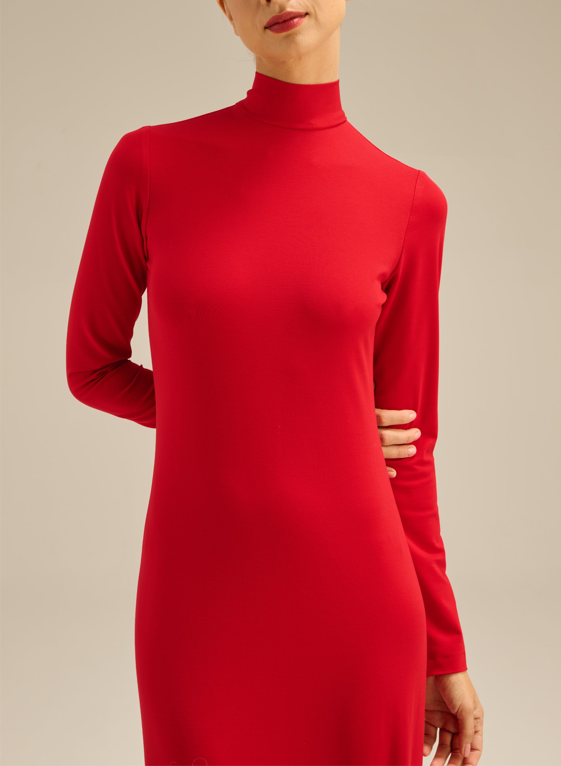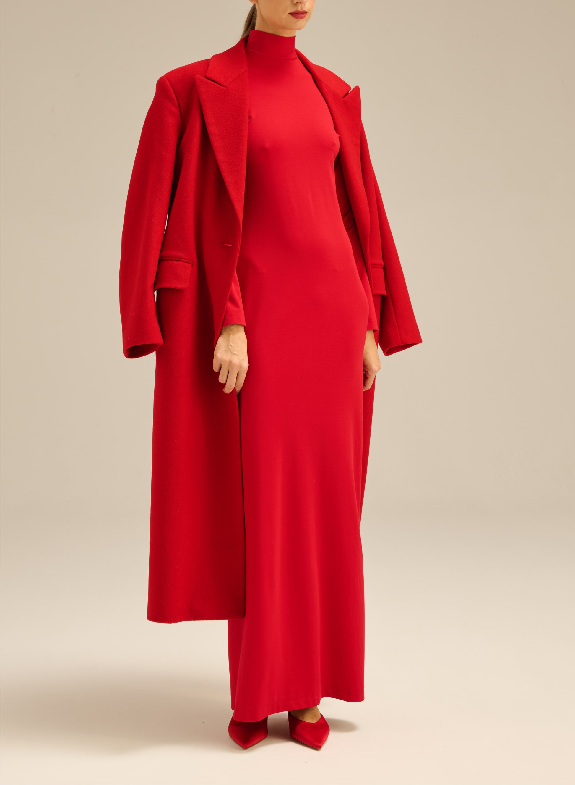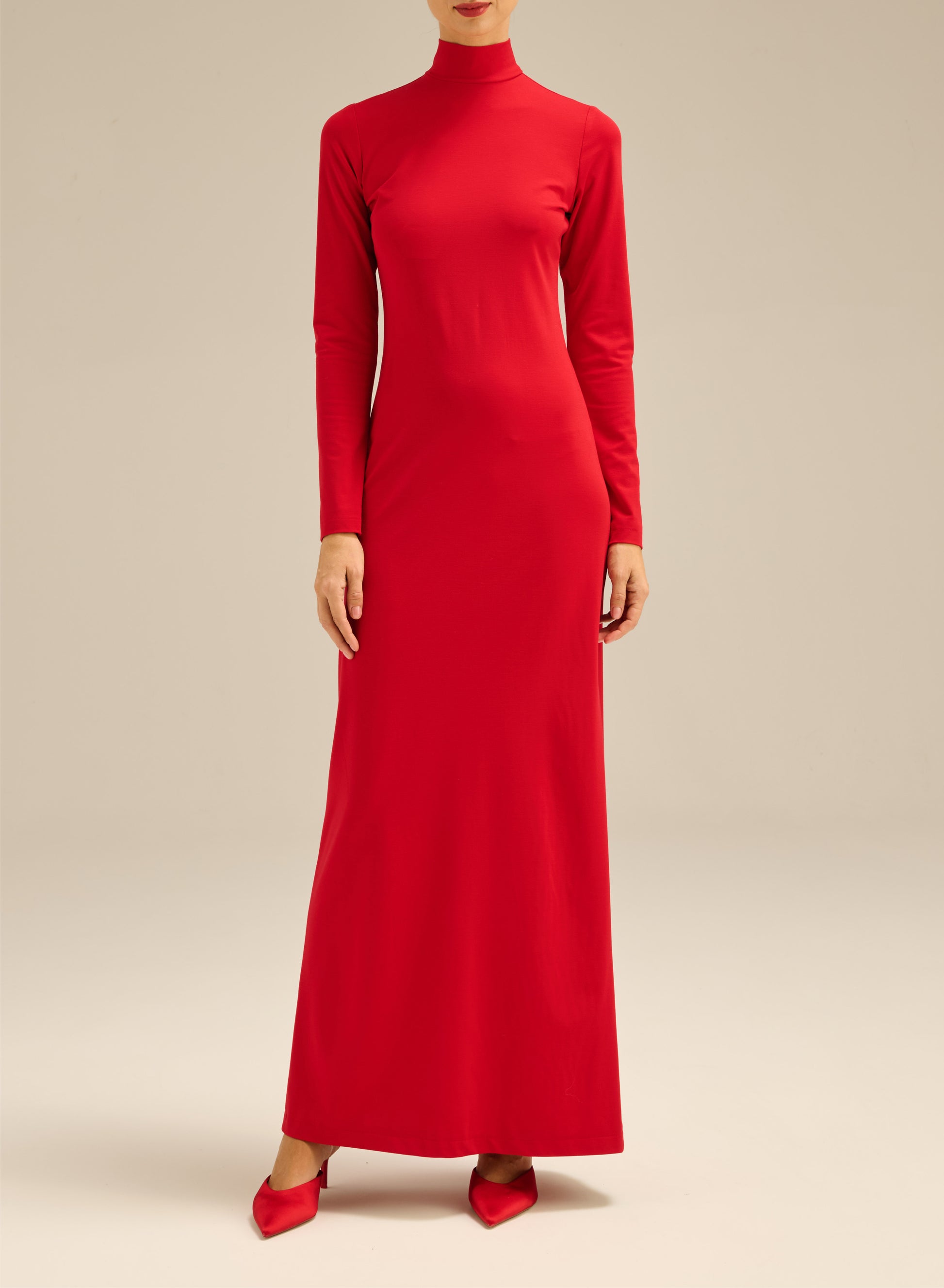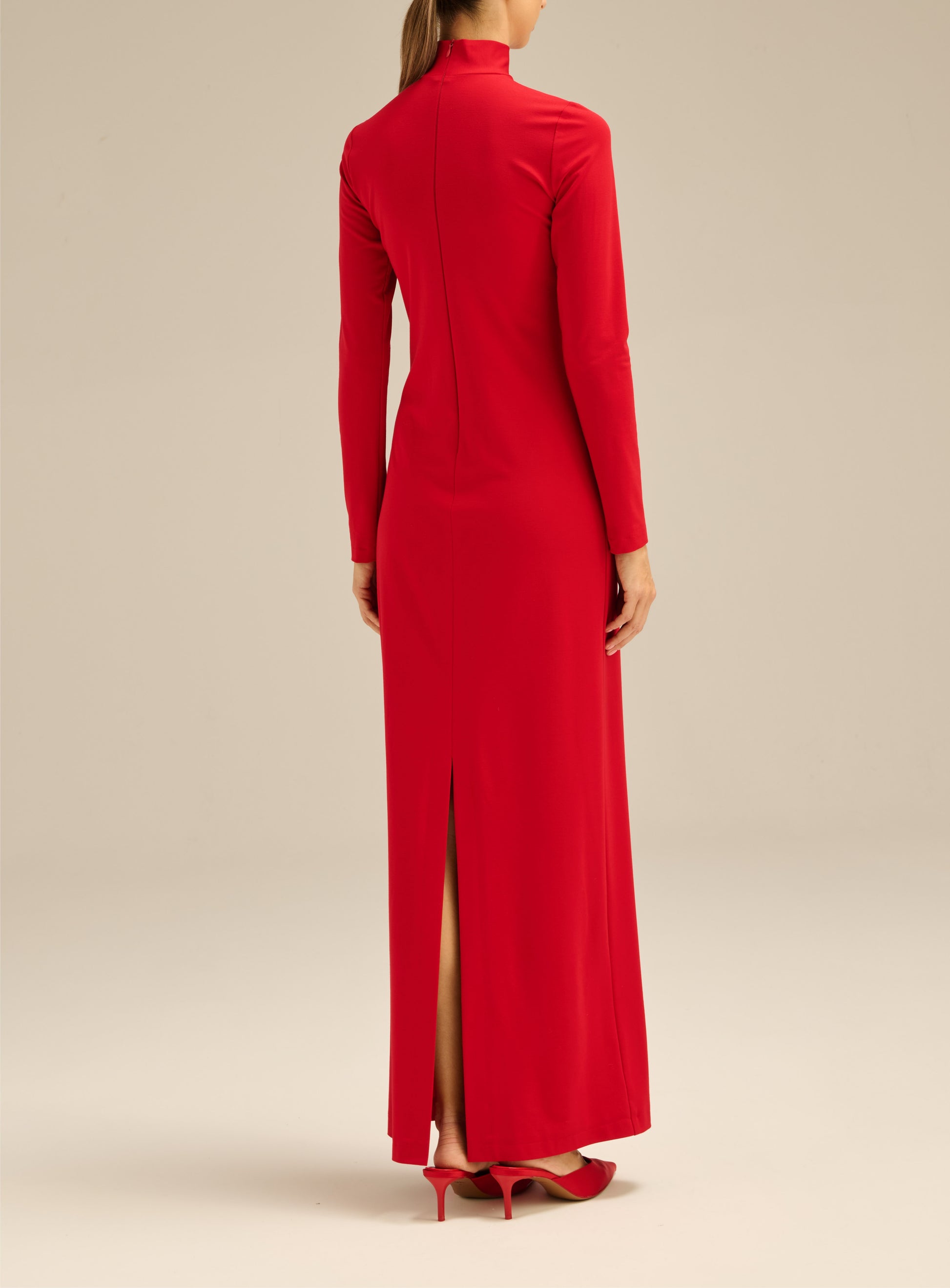 Sukienka maxi w minimalistycznym stylu, wykonana z miękkiej,elastycznej tkaniny. Posiada krótką stójkę i zapięcie na suwak z tyłu.