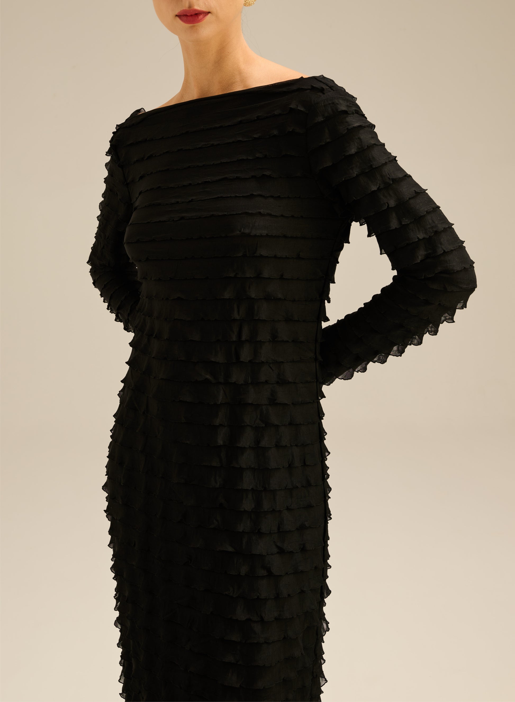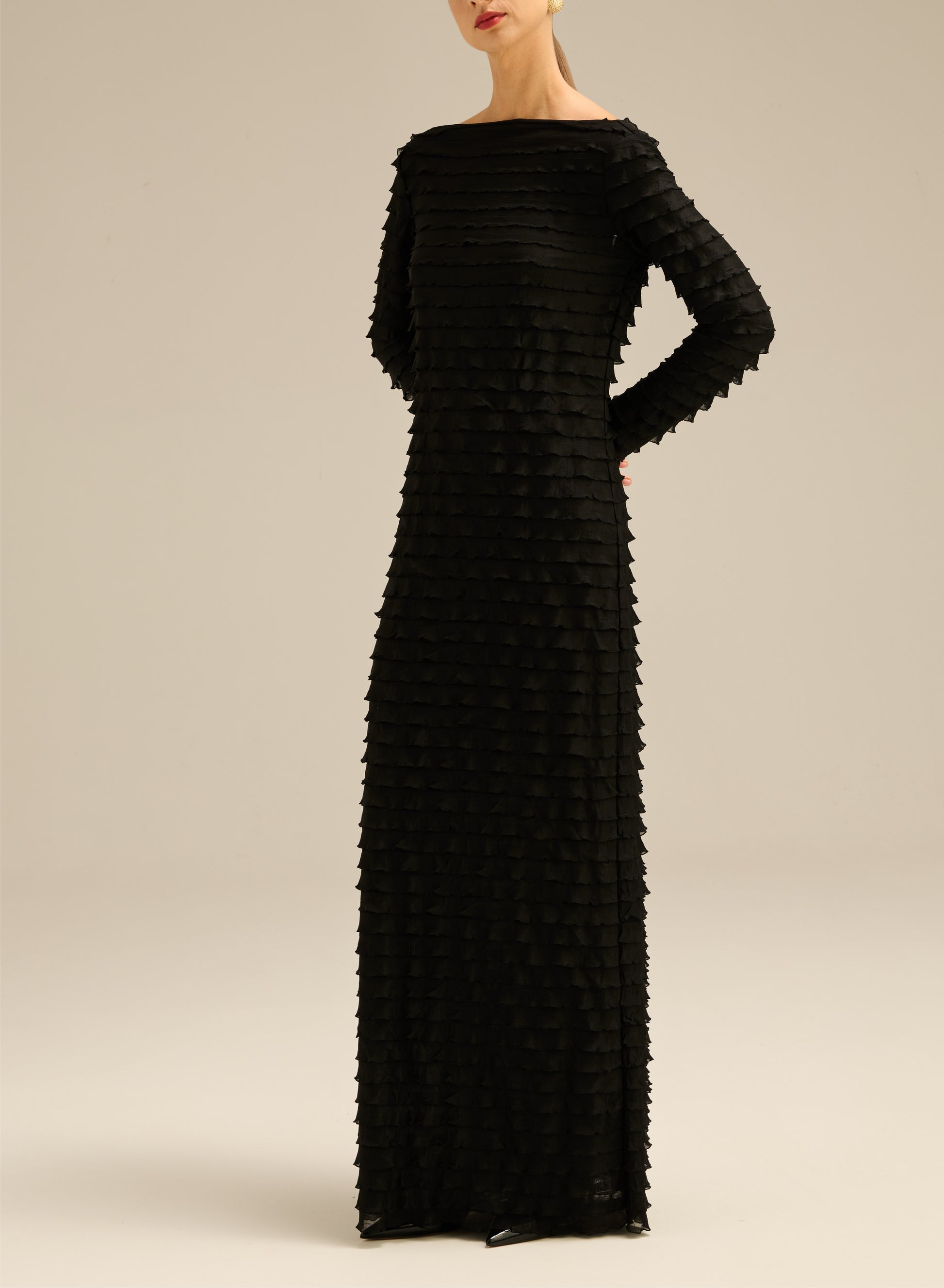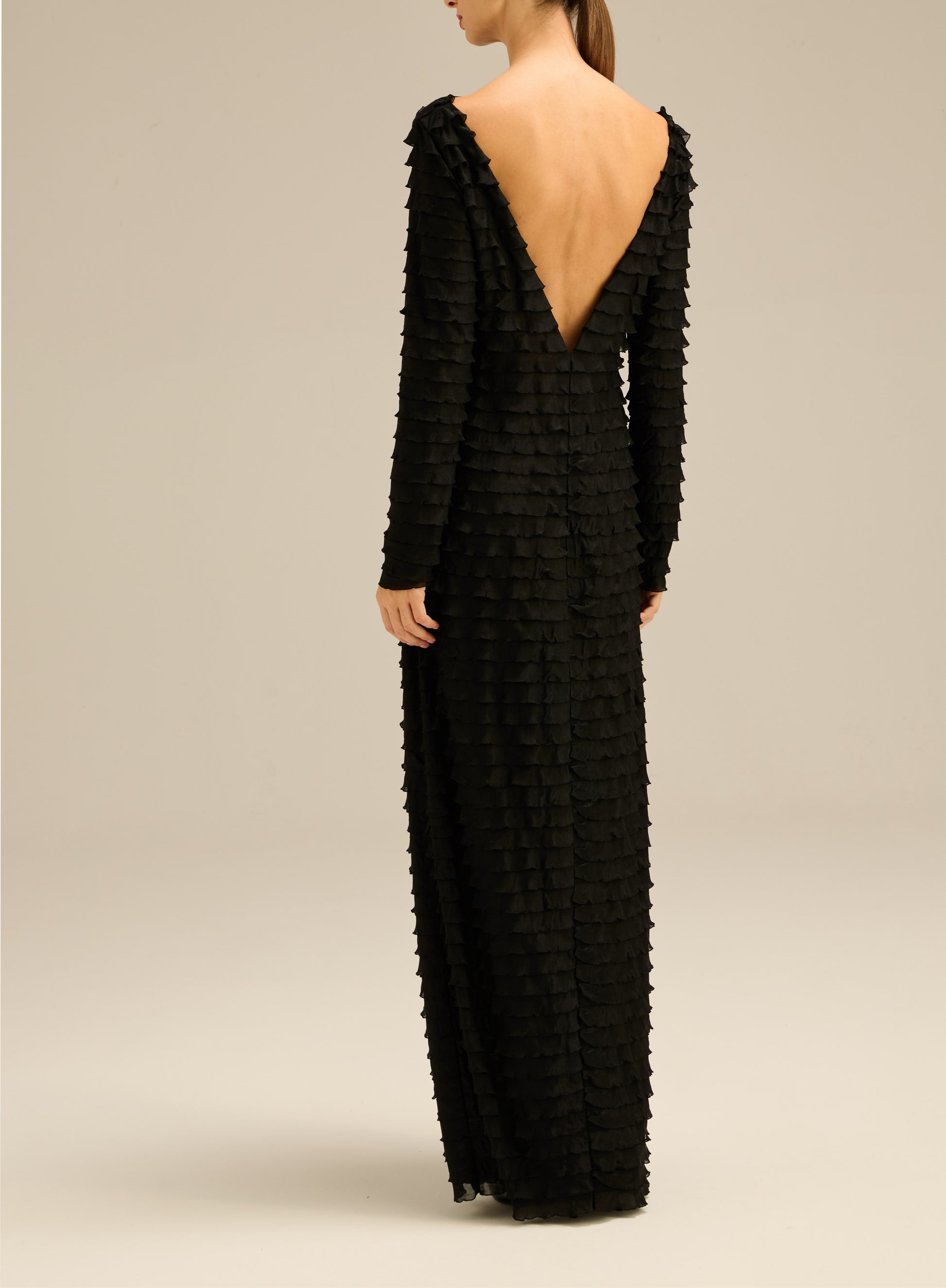 Długa sukienka wykonana z miękkiej, lekkiej tkaniny układającej się w nieregularne falbanki. Posiada długie rękawy i głęboki dekolt na plecach.
