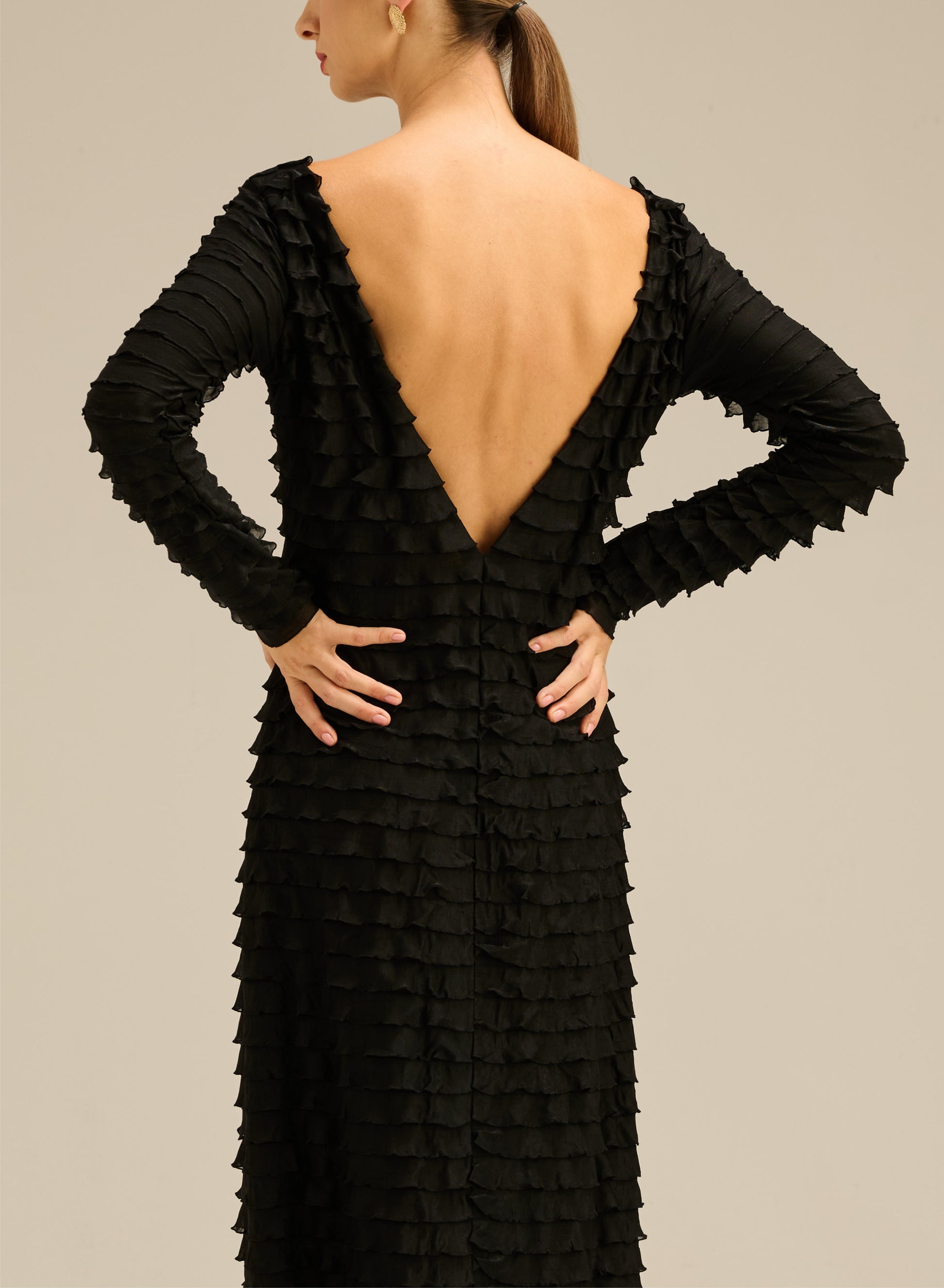 Sukienka maxi z delikatnych falbanek z wycięciem na plecach czarna - Liz