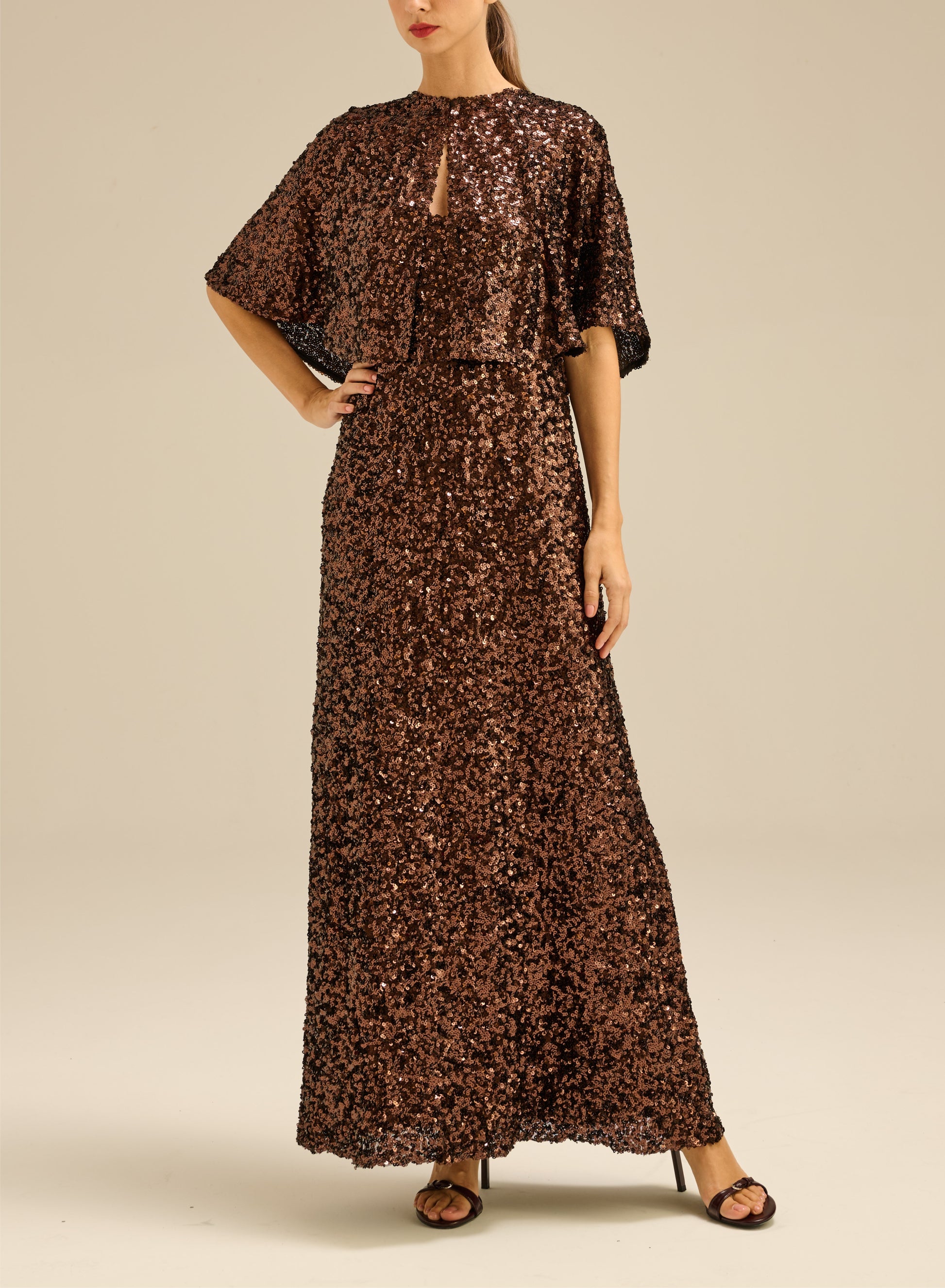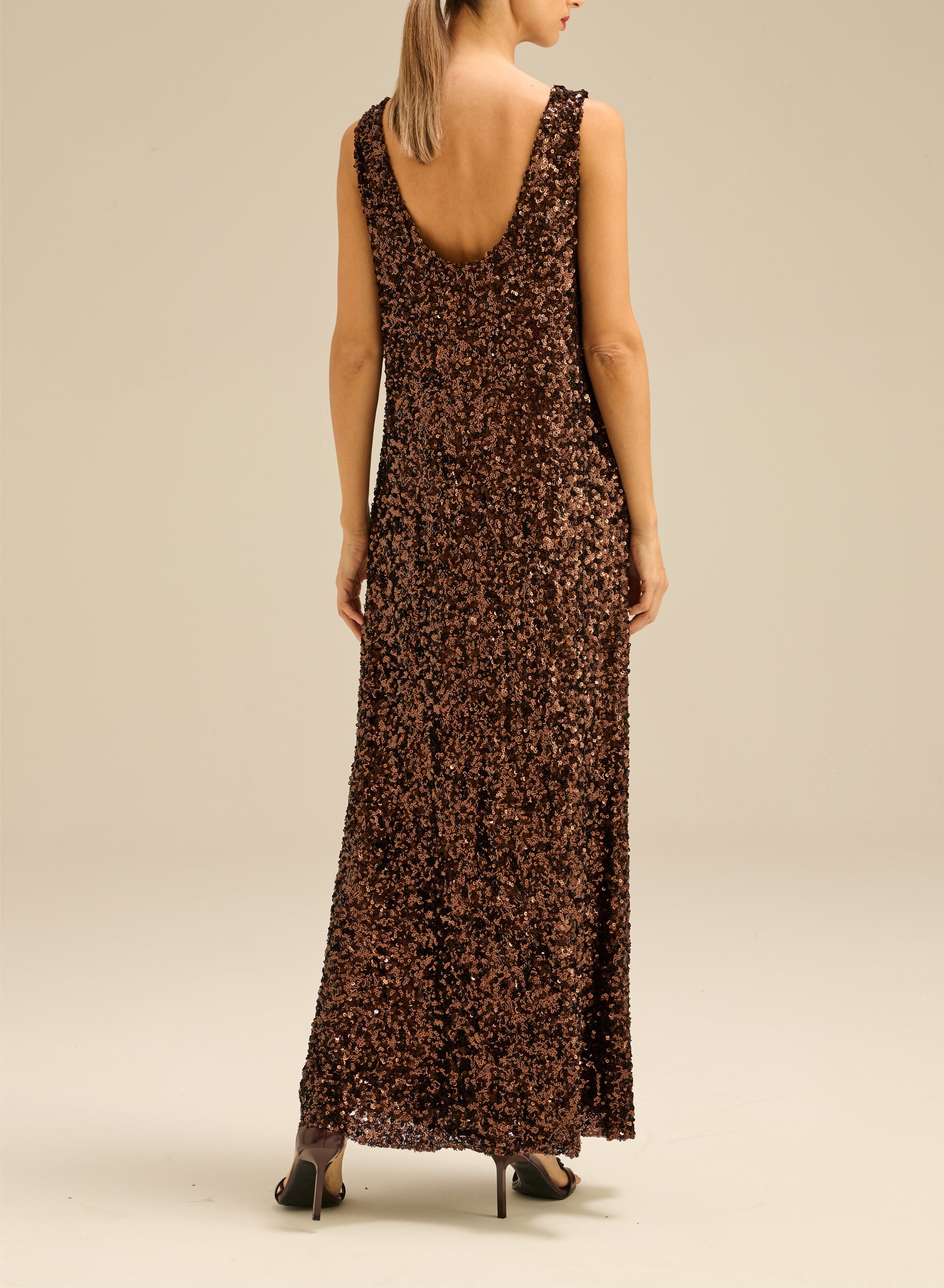 Sukienka o długości maxi i trapezowym kroju, wykonana z gęsto tkanych cekinów w brązowym kolorze.