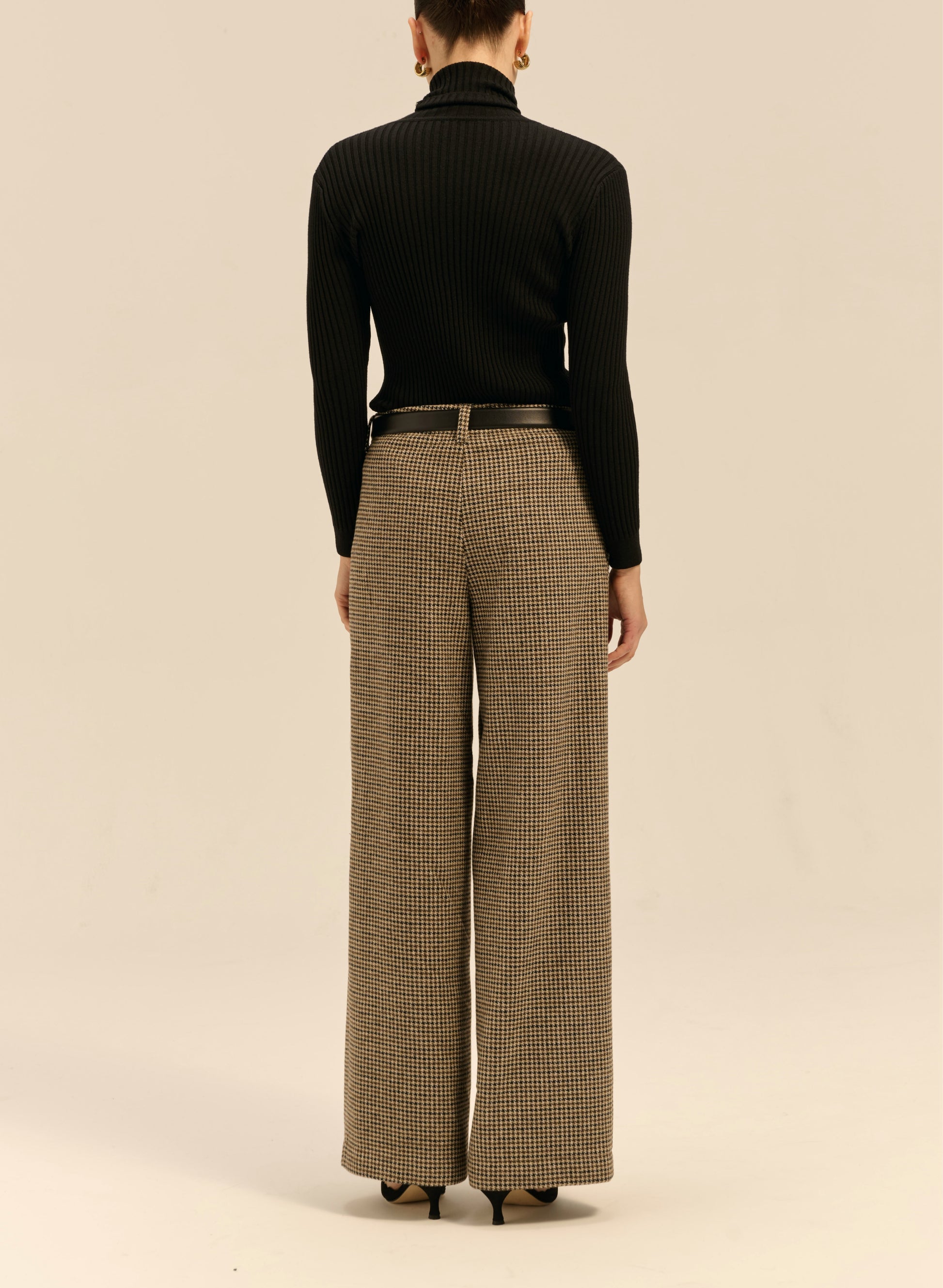 Spodnie o długich, szerokich nogawkach, wykonane z miękkiej tkaniny we wzór pepitki w kolorze beżowo-brązowym. Posiadają regularny stan, delikatne zaszewki, kryte zapięcie na guzik i zamek.