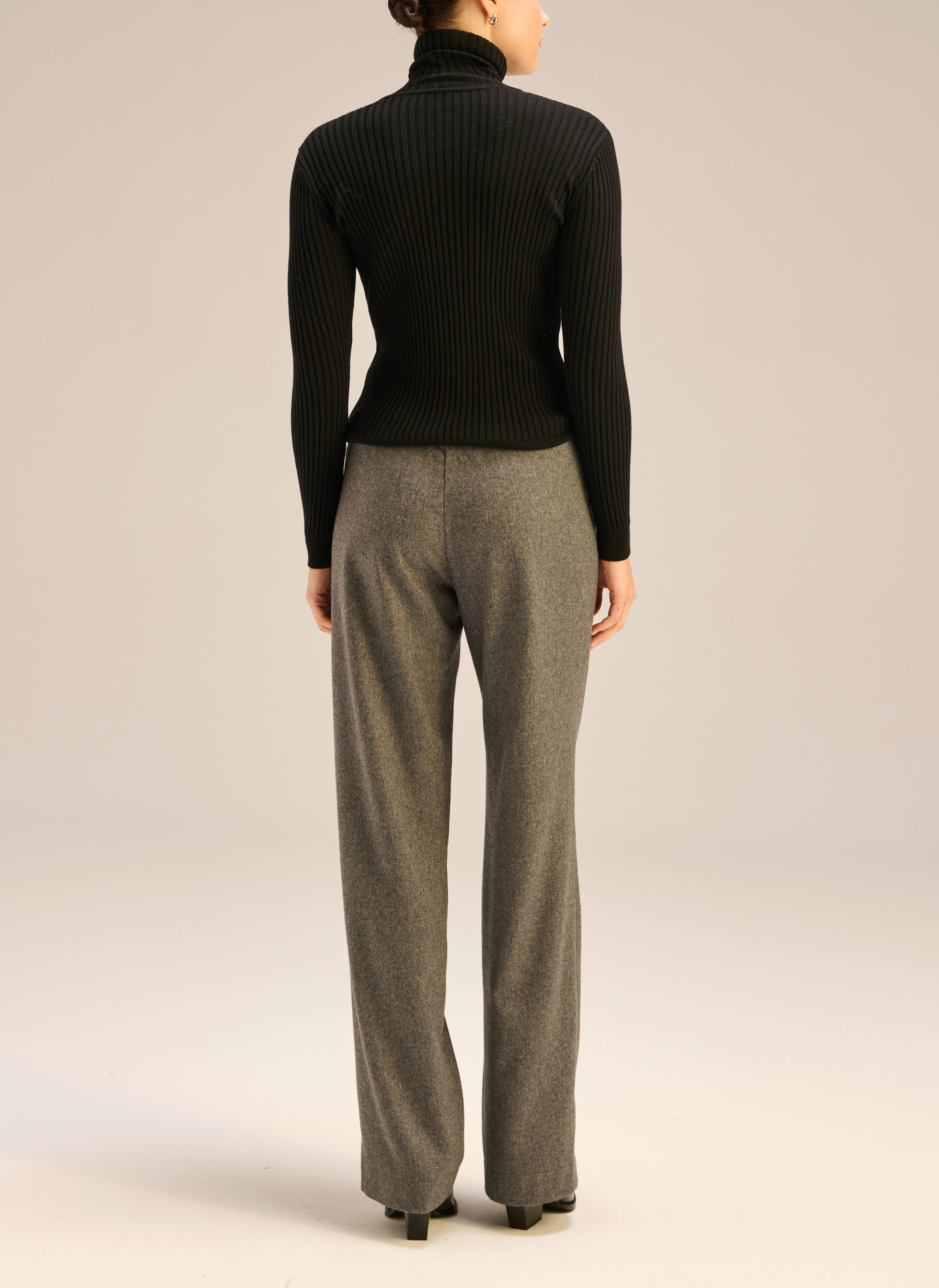Spodnie o prostej, długiej nogawce. Wykonane z miękkiej tkaniny w szarym kolorze. Posiadają podwyższony stan z elastycznym pasem oraz dwie kieszenie.