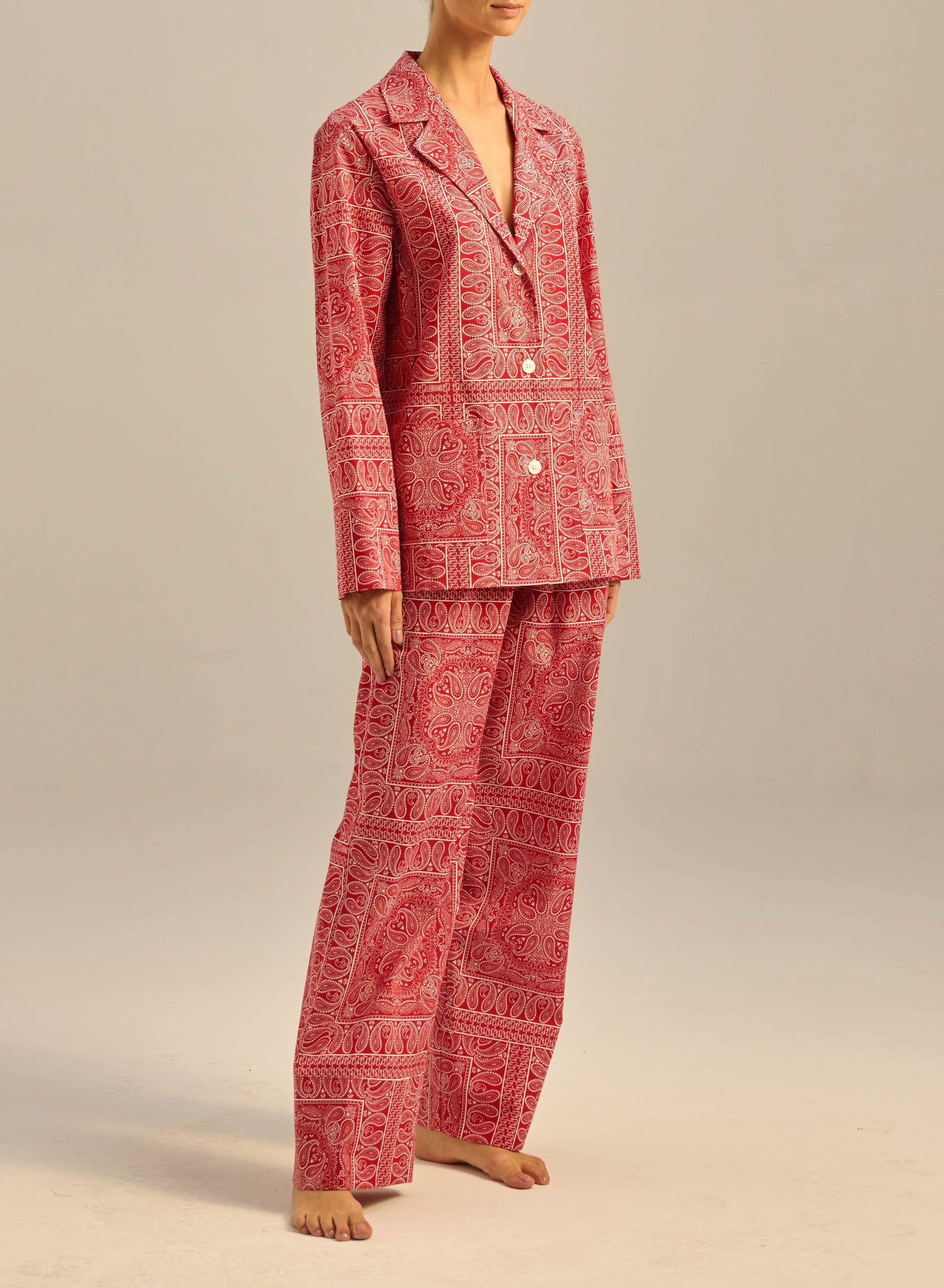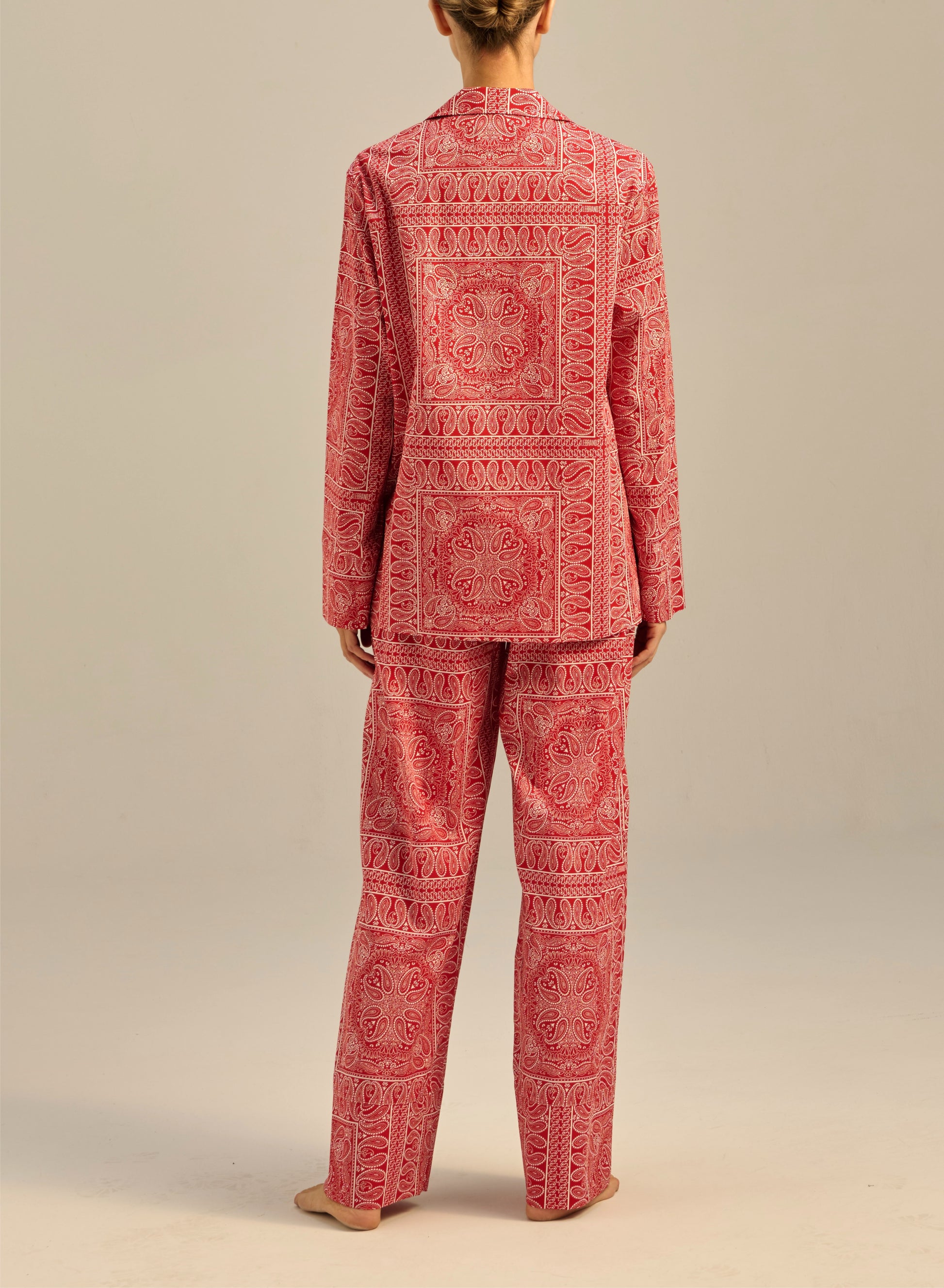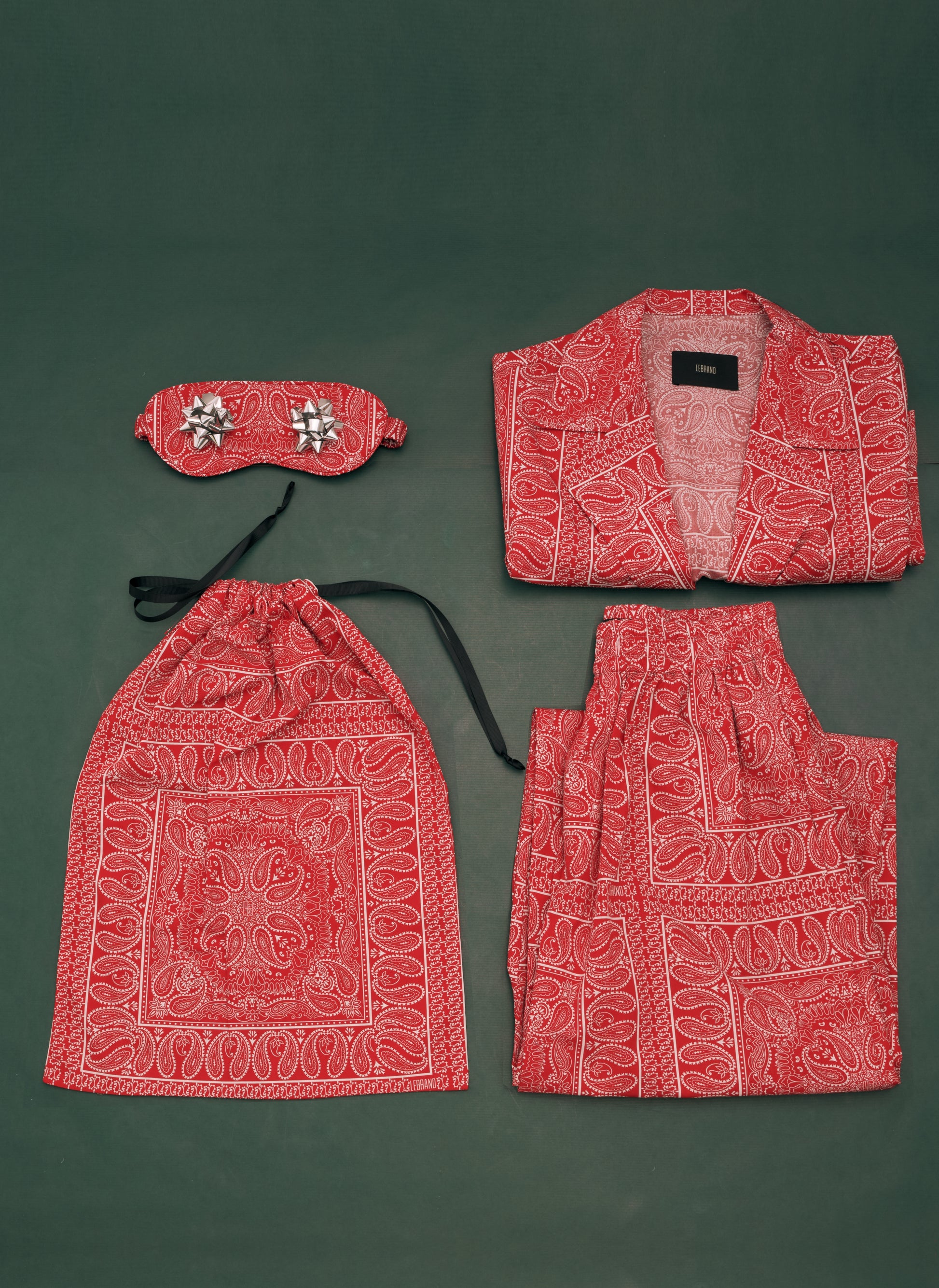 Zestaw składający się z koszuli Julien i spodni Roy, opaski na oczy i woreczka. Wykonany z bawełny drukowanej w rozpoznawalny wzór bandany. Koszula ma krój oversize, spodnie posiadają elastyczny pas i szerokie nogawki. W przypadku ewentualnego zwrotu zestaw musi zostać zwrócony w całości.