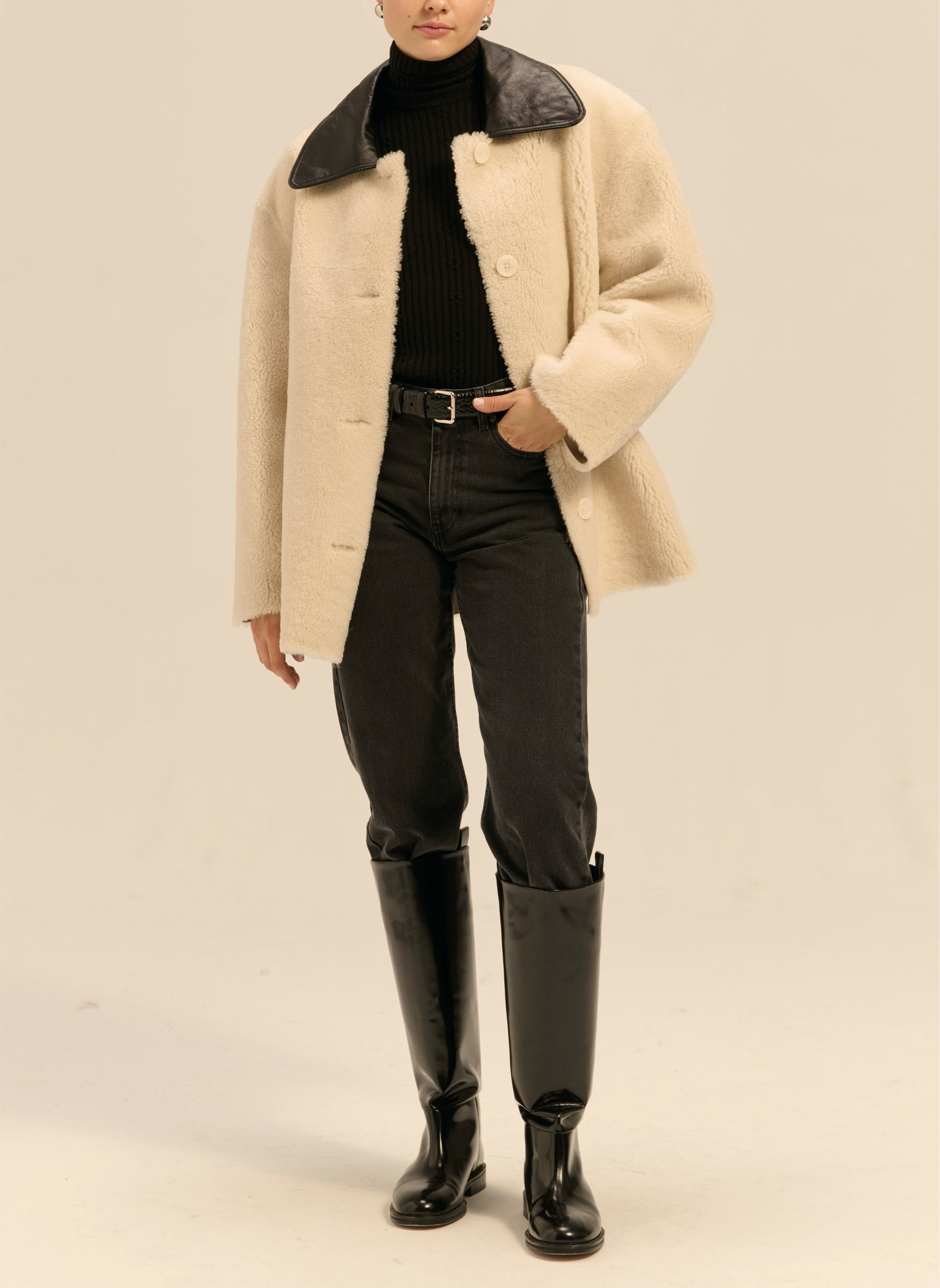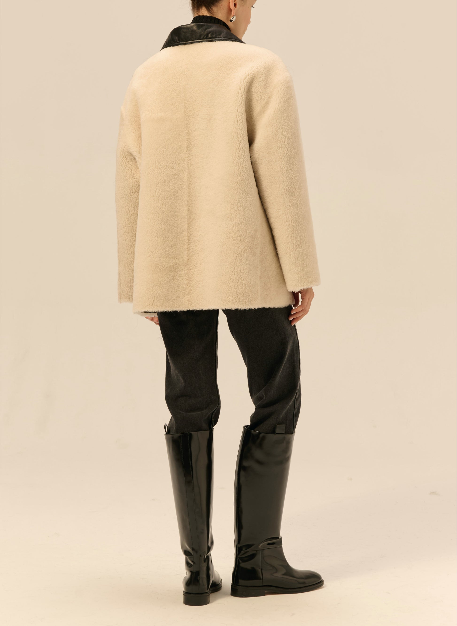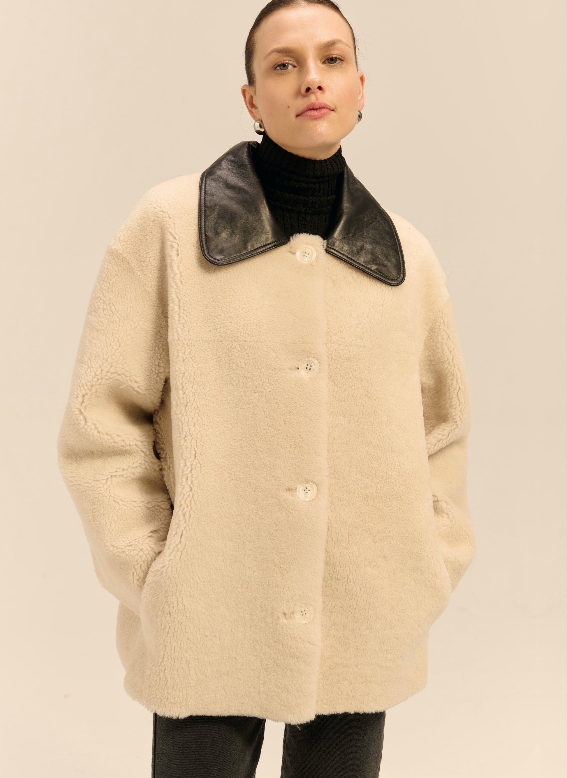 Krótki kożuch o pudełkowym kroju wykonany z miękkiej owczej wełny. Posiada szeroki kołnierz w kontrastującym kolorze, jednorzędowe zapięcie na guziki oraz dwie kieszenie boczne.