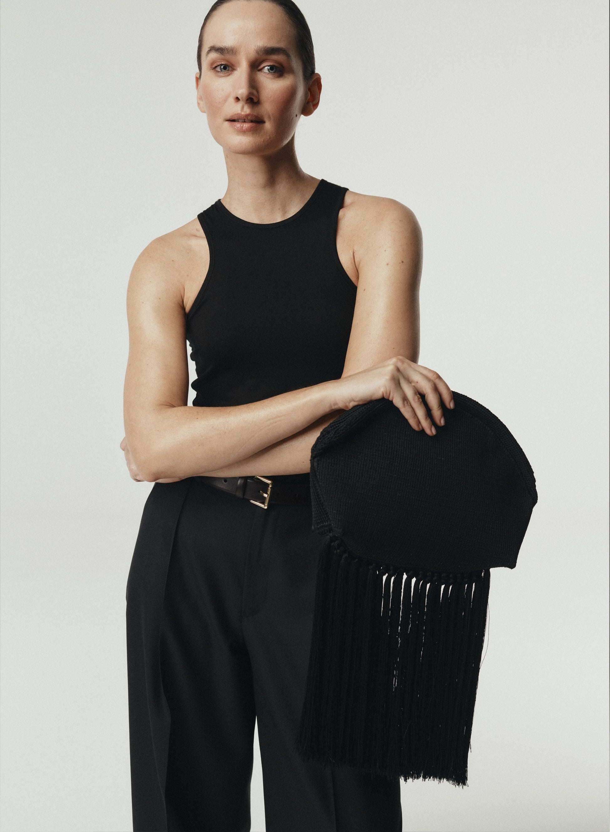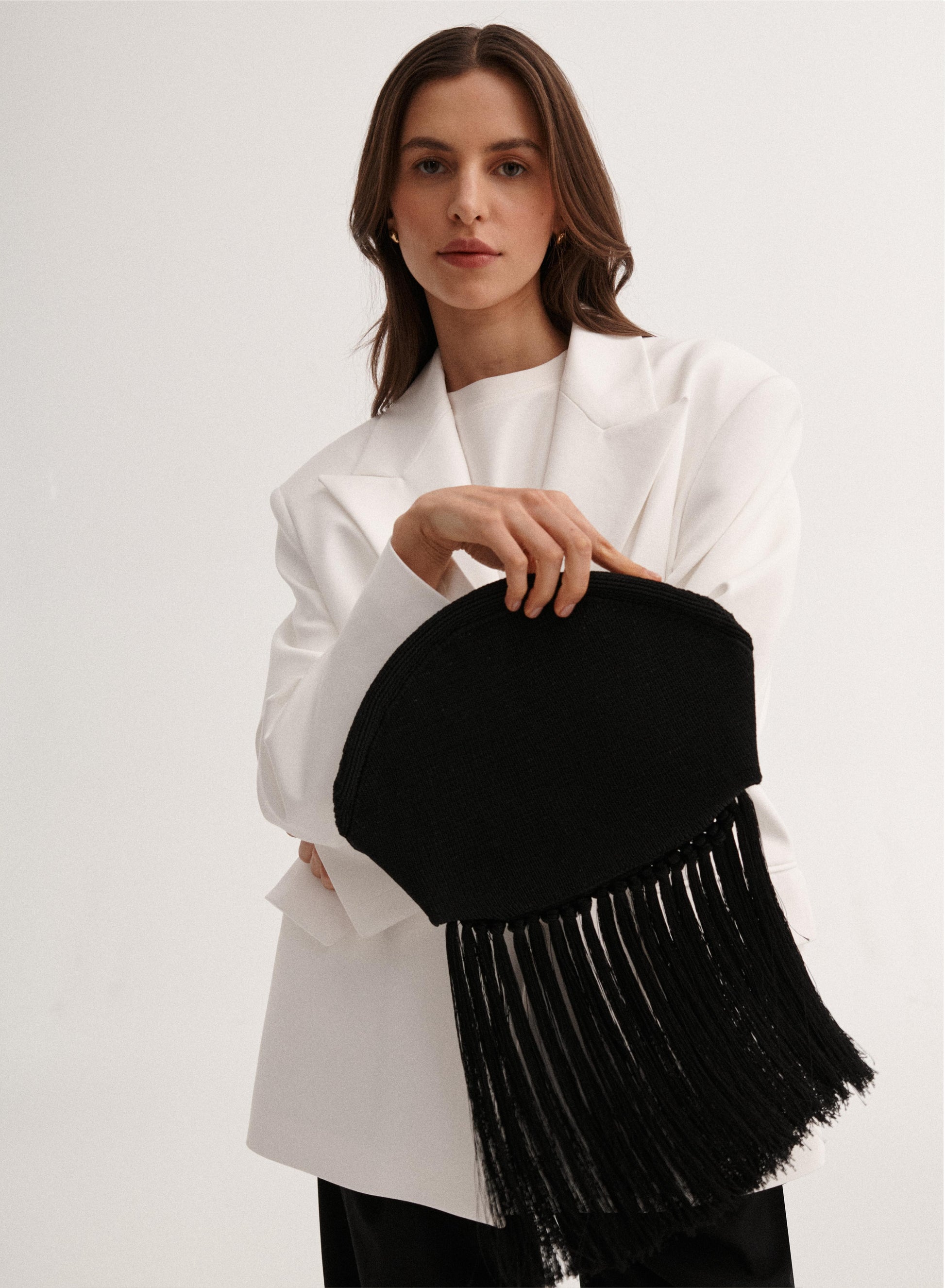 Kopertówka do ręki wykonana z przyjemnego w dotyku plecionego materiału w kolorze czarnym. Posiada zdobienia gęstymi frędzlami, półokrągły kształt i zapięcia z magnesami od środka.