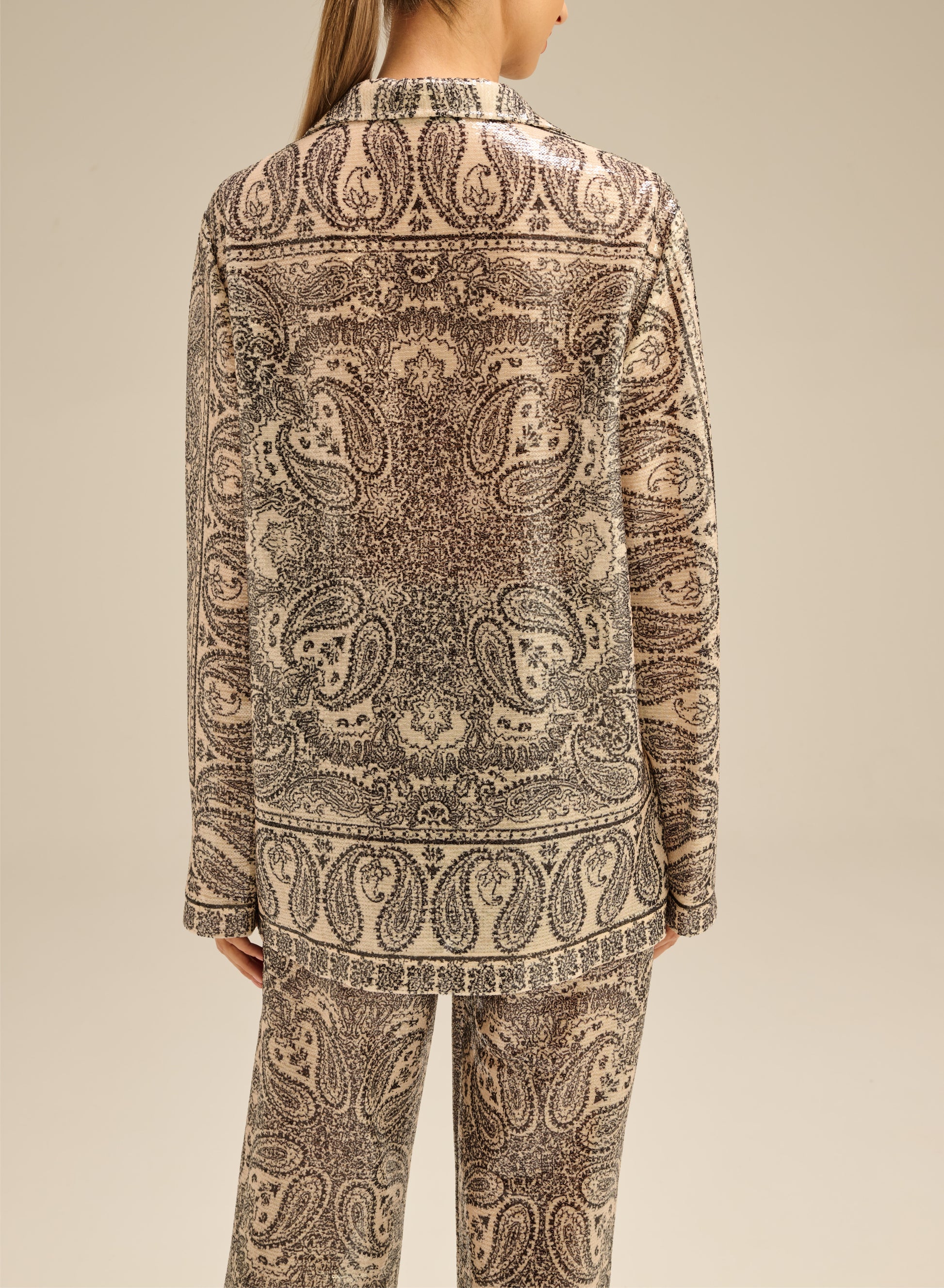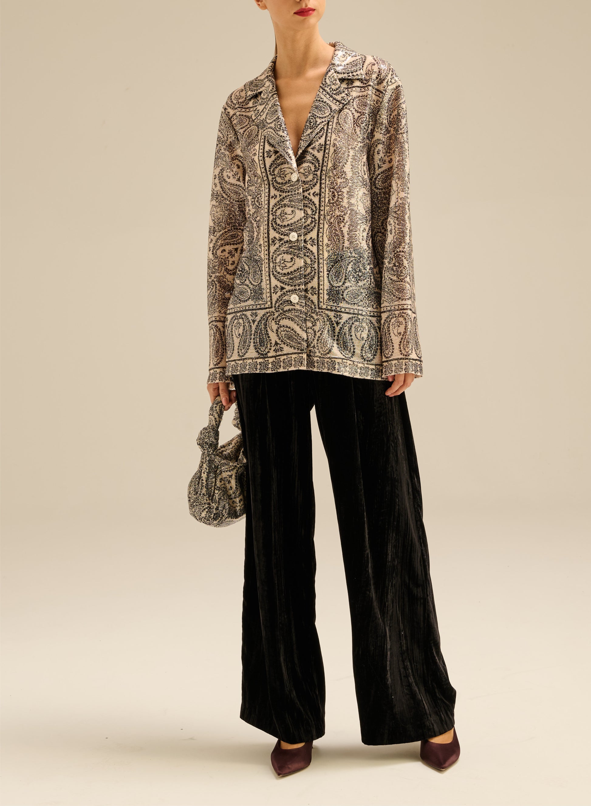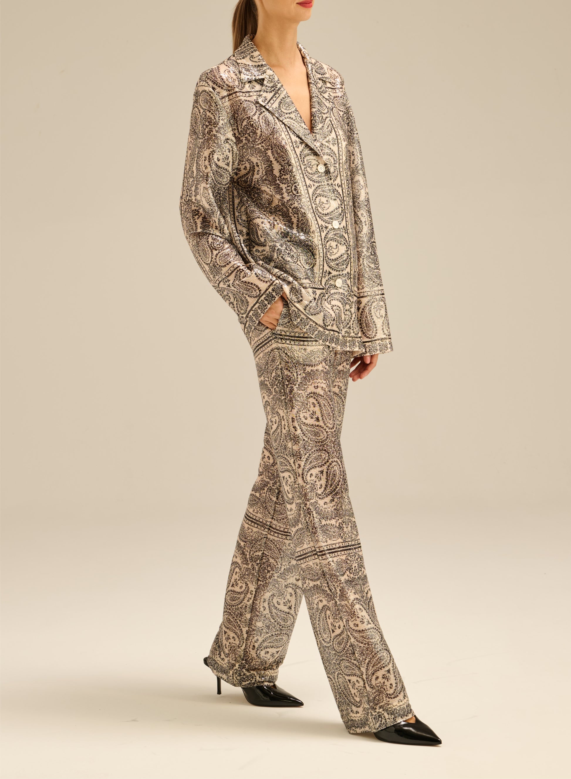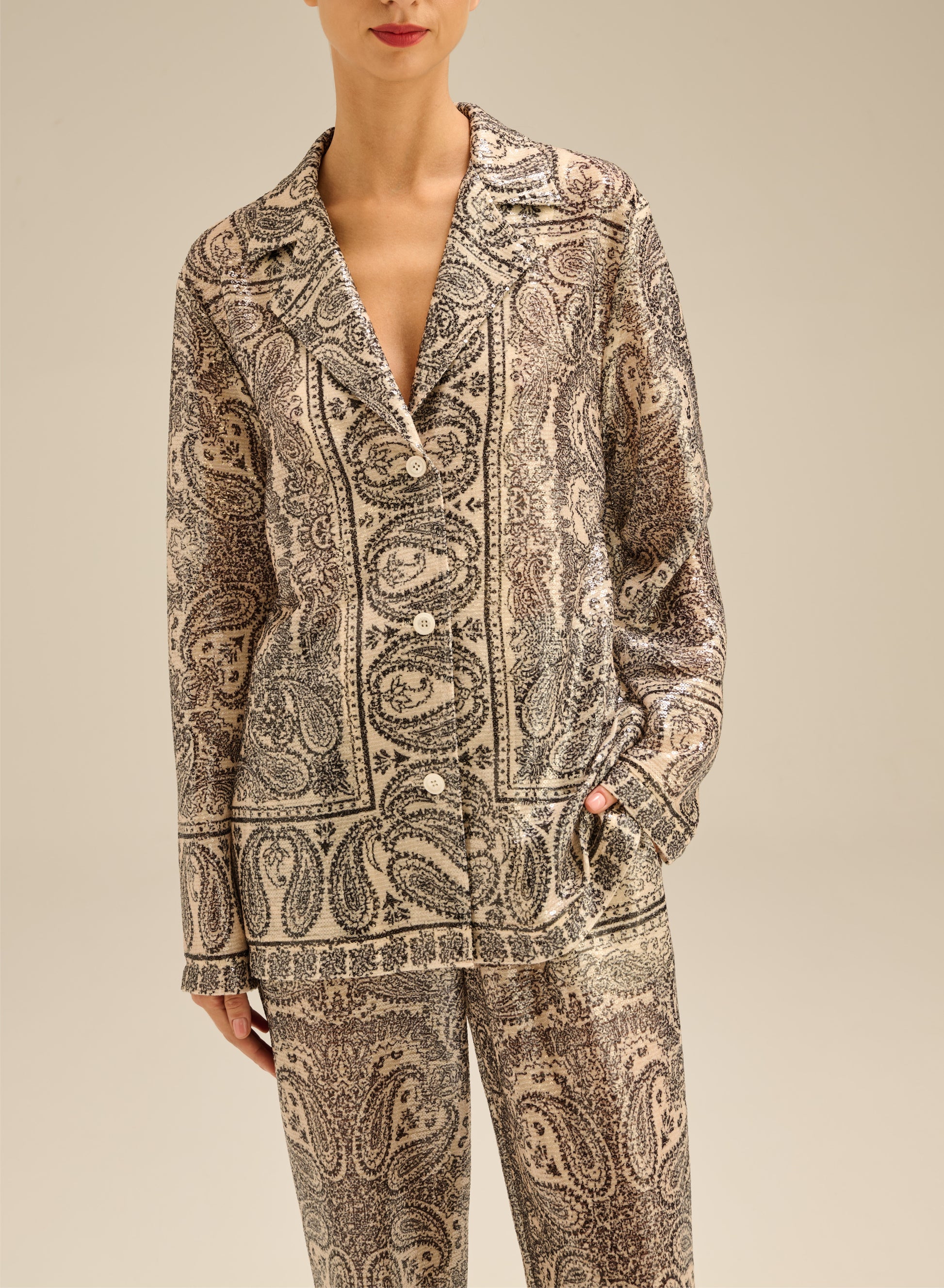 Koszula w piżamowym stylu, wykonana z lekkiej, połyskującej tkaniny układającej się w charakterystyczny wzór bandany. Posiada krótki kołnierzyk i długie, lekko rozszerzane rękawy.