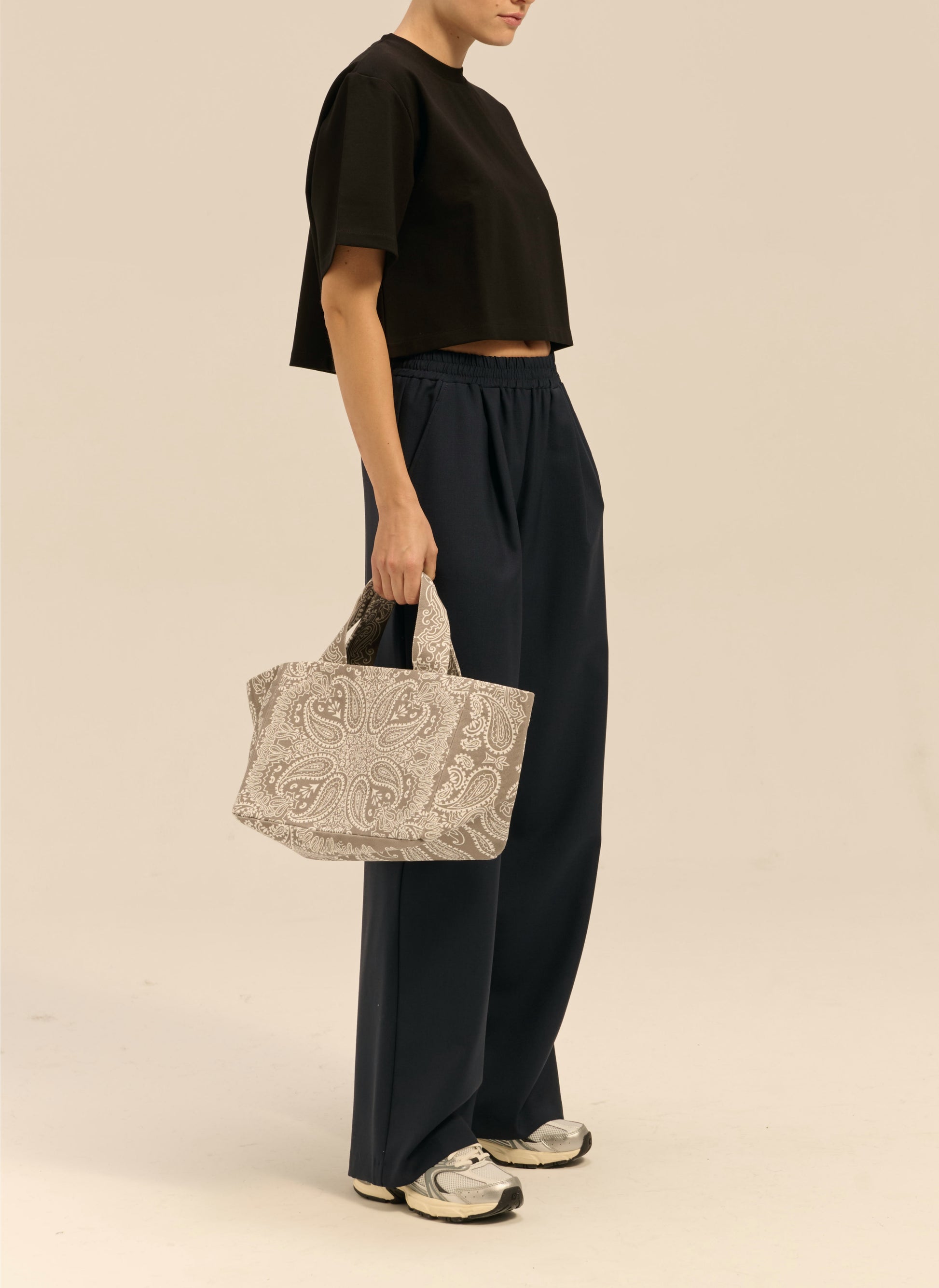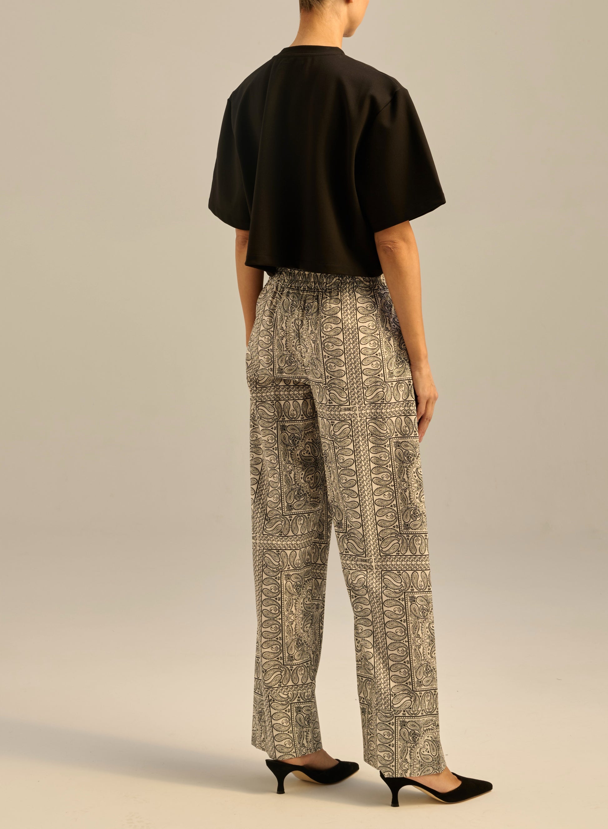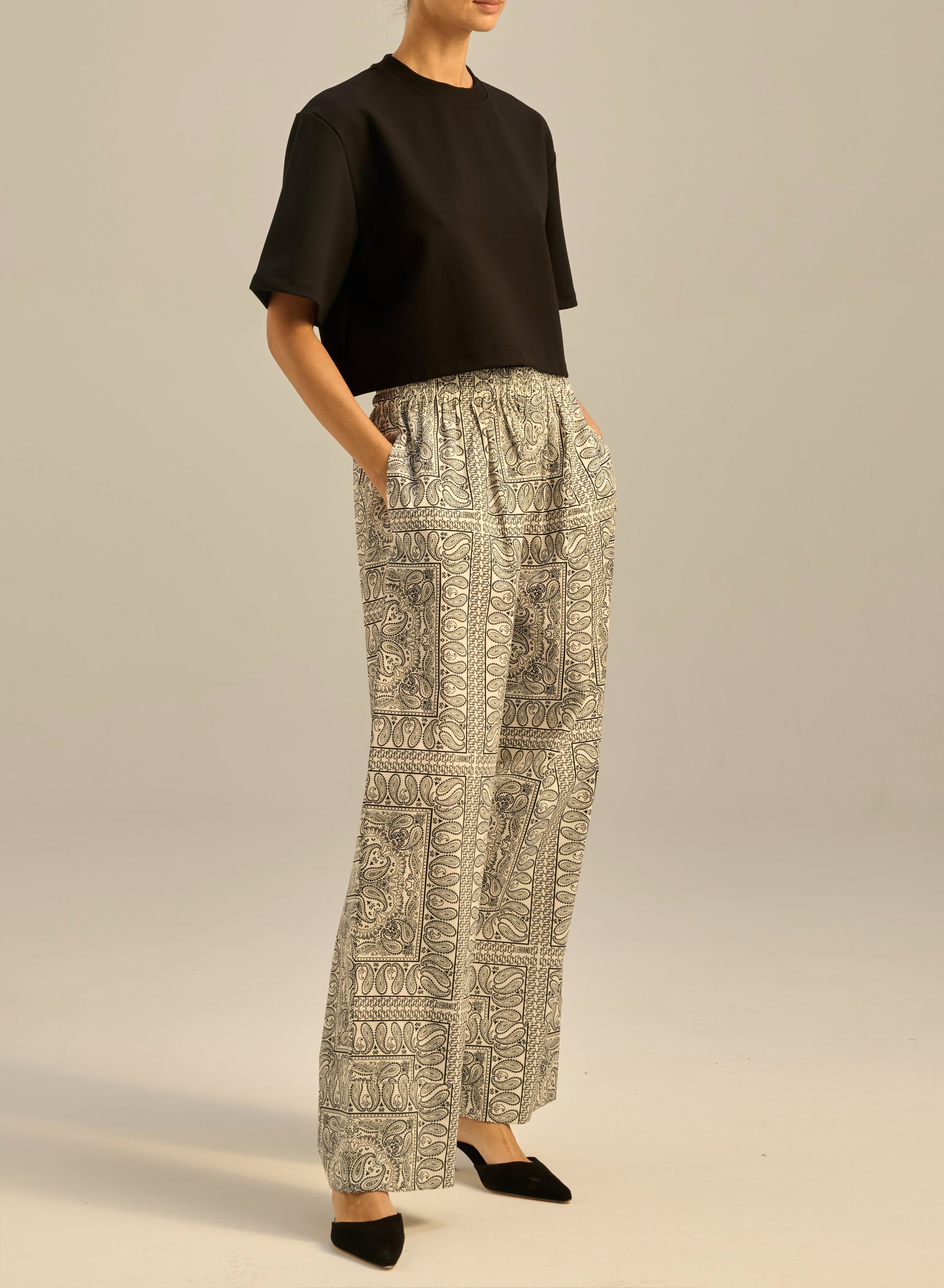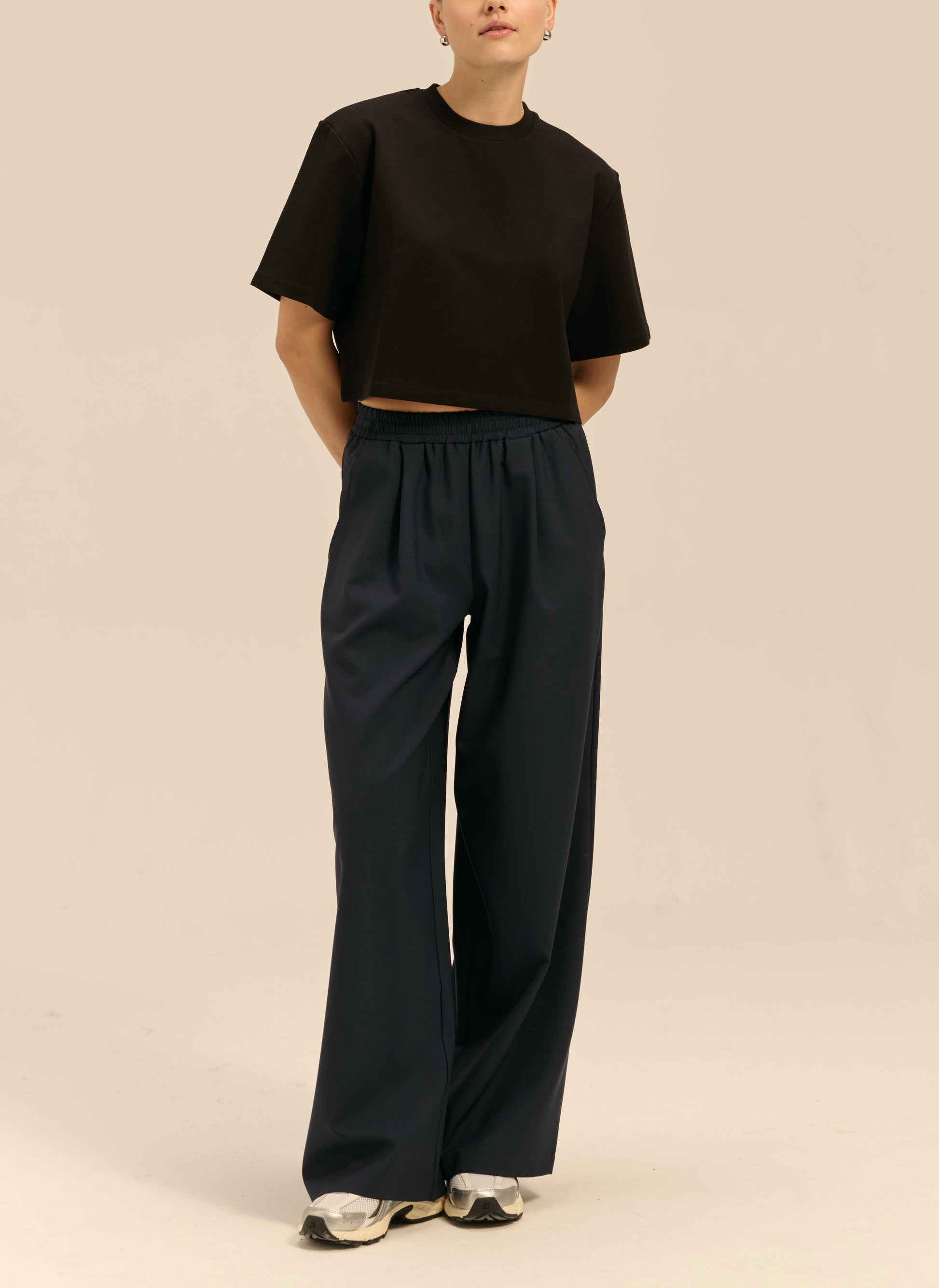 Krótki t-shirt o kroju oversize, wykonany z miękkego jerseyu. Posiada okrągły dekolt i rękawy przed łokieć.