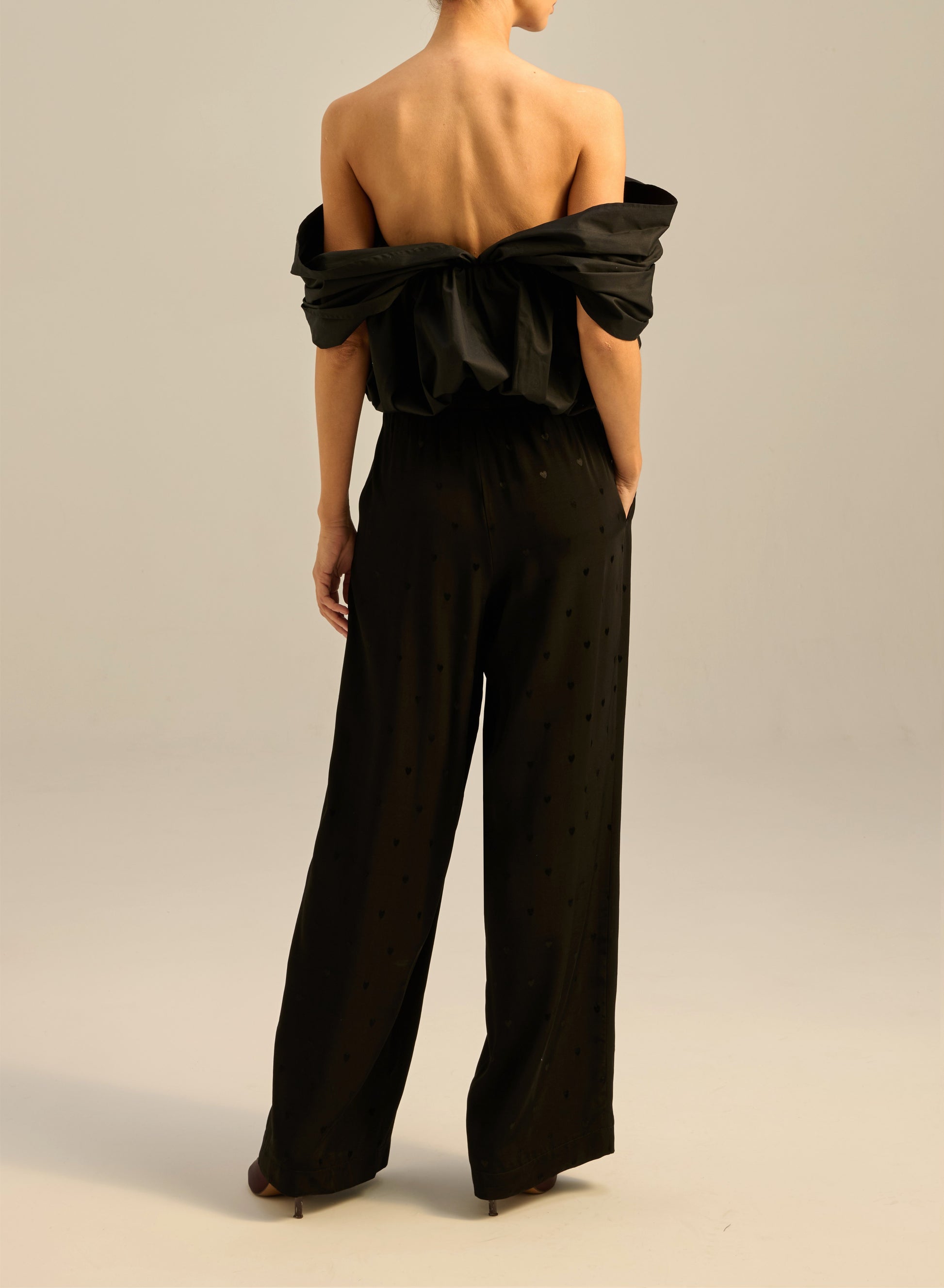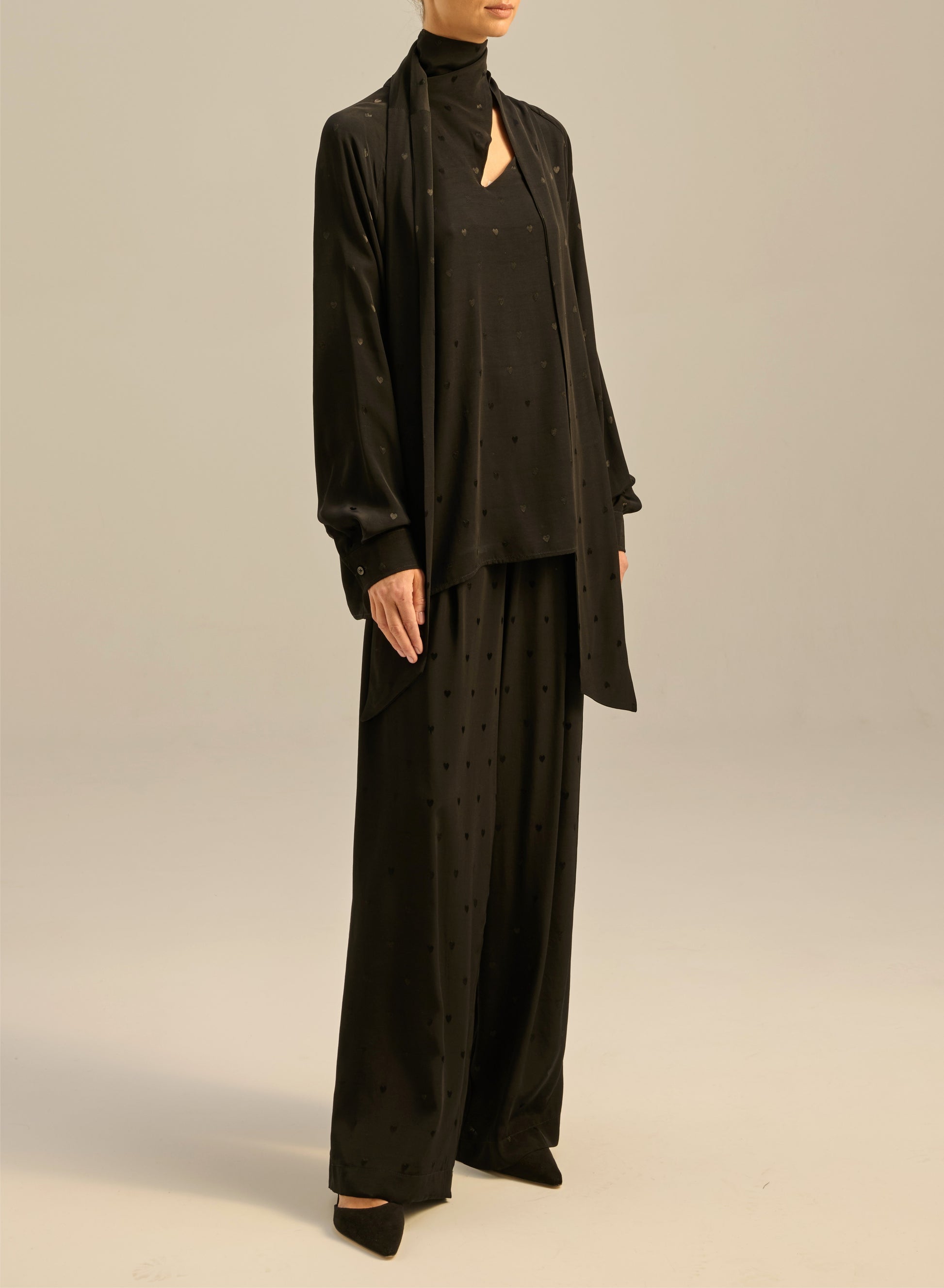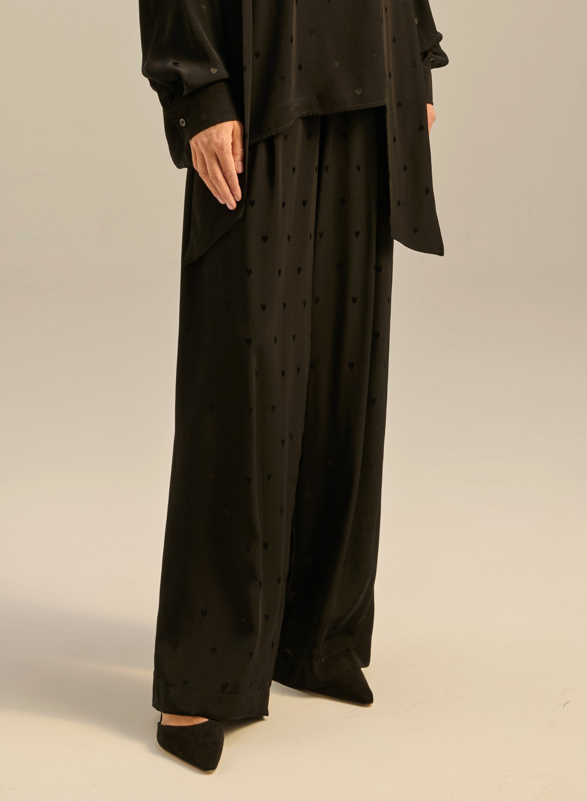 Spodnie o długich, szerokich nogawkach, wykonane z lekkiej tkaniny z haftem w kszatłcie serc. Posiadają regularny stan, delikatne zaszewki, elastyczną talią.