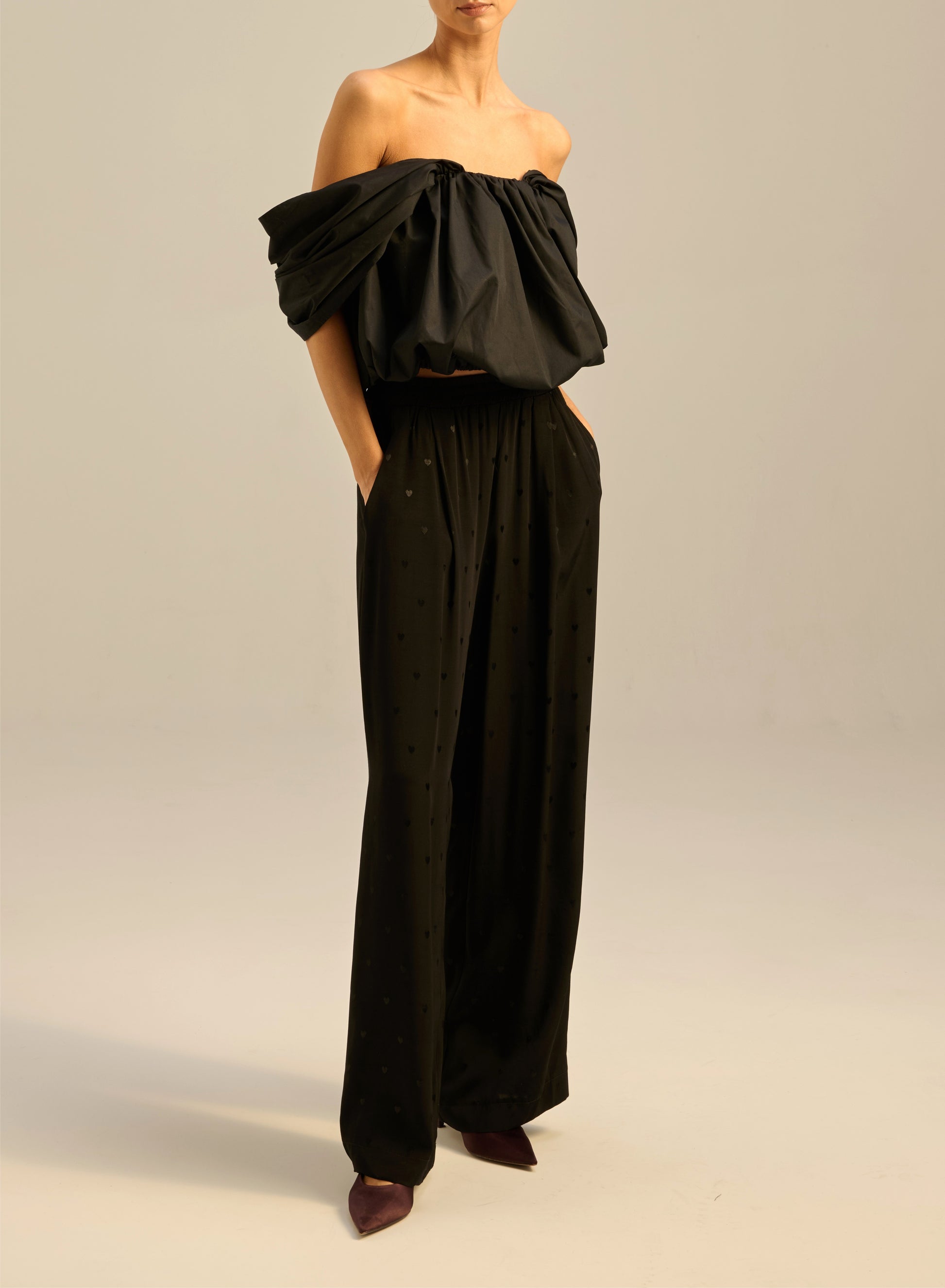 Spodnie z haftem w serca z szeroką nogawką - Franco