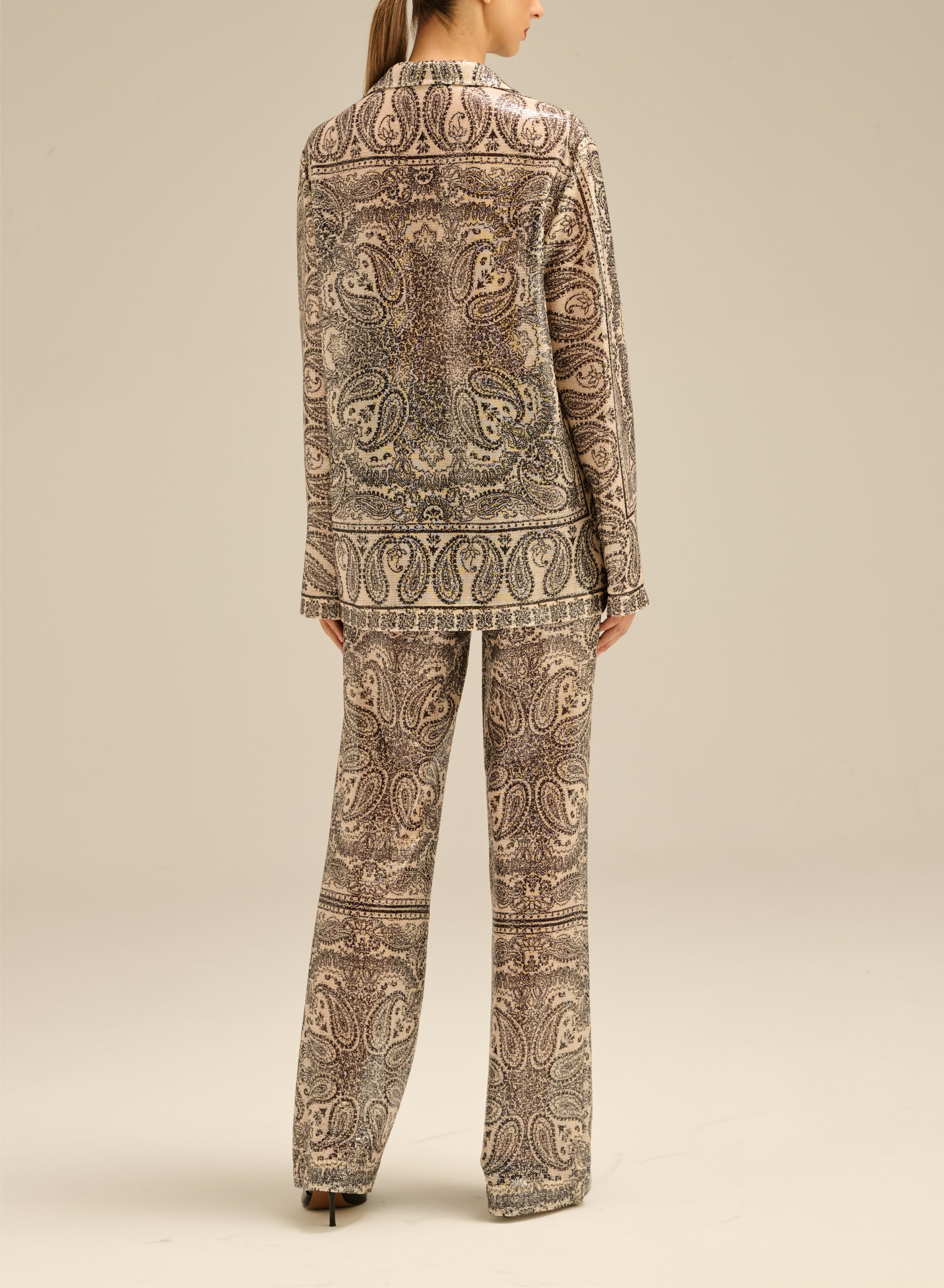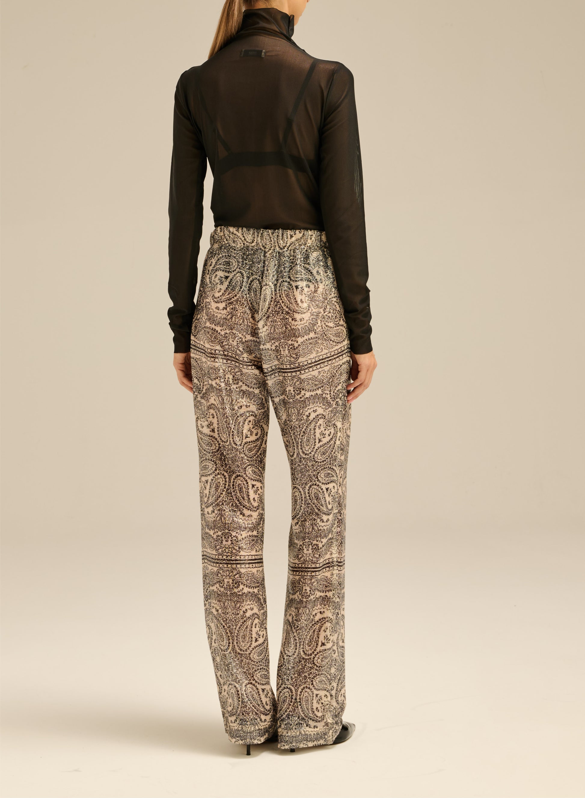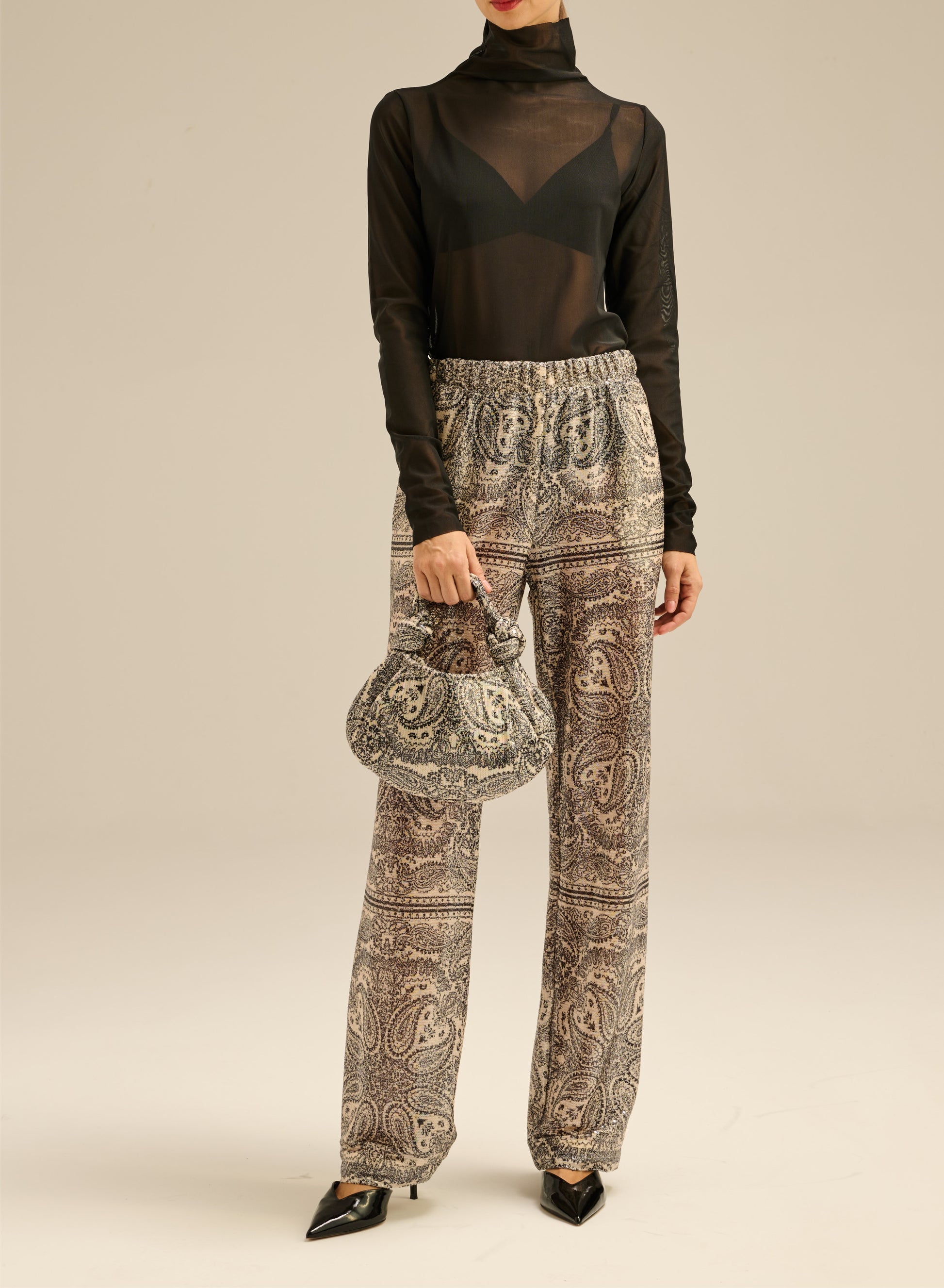Szerokie spodnie z długimi nogawkami, wykonane z połyskującej tkaniny układającej się w charakterystyczny wzór. Posiadają elastyczny pas oraz dwie boczne kieszenie.