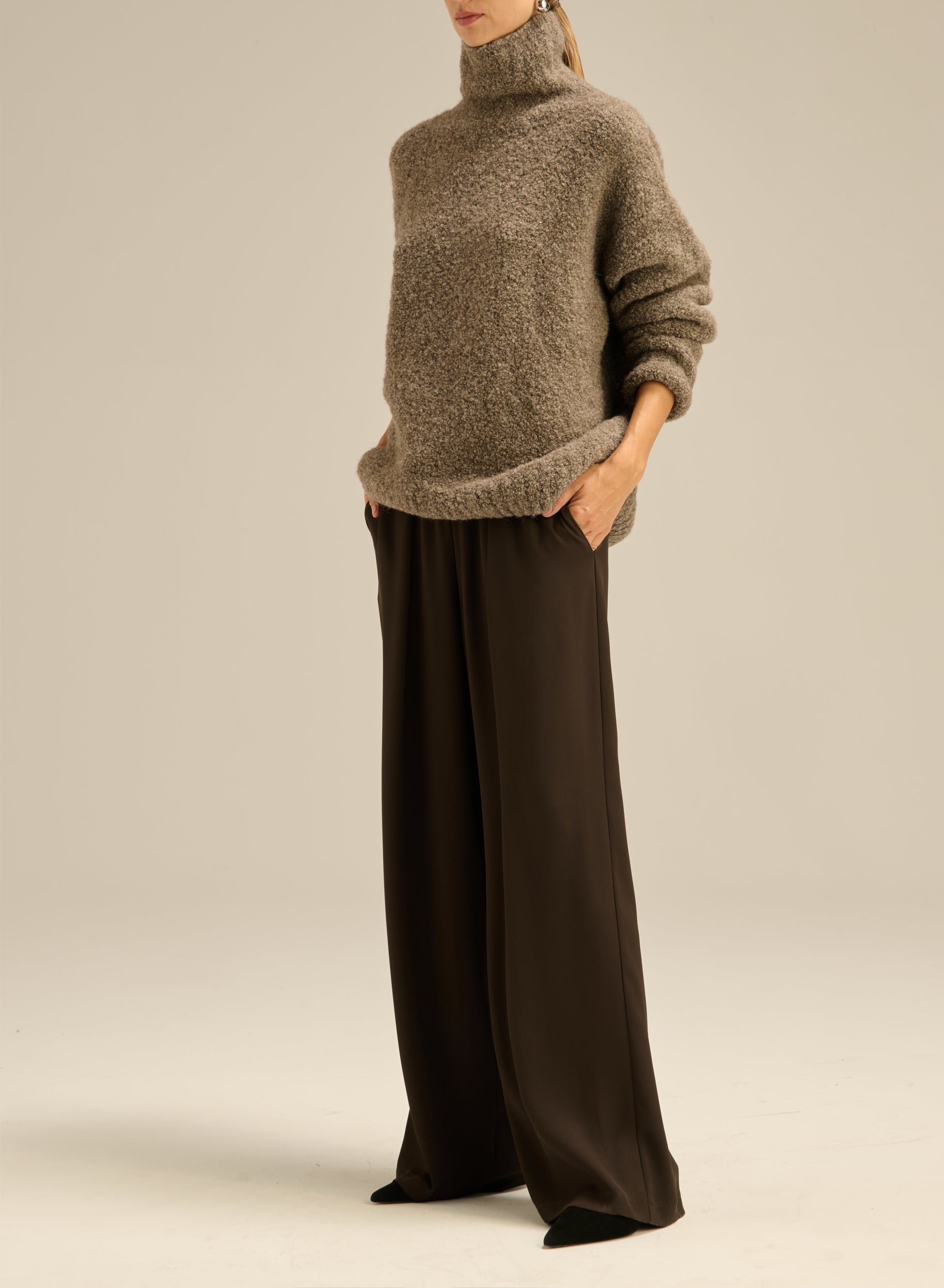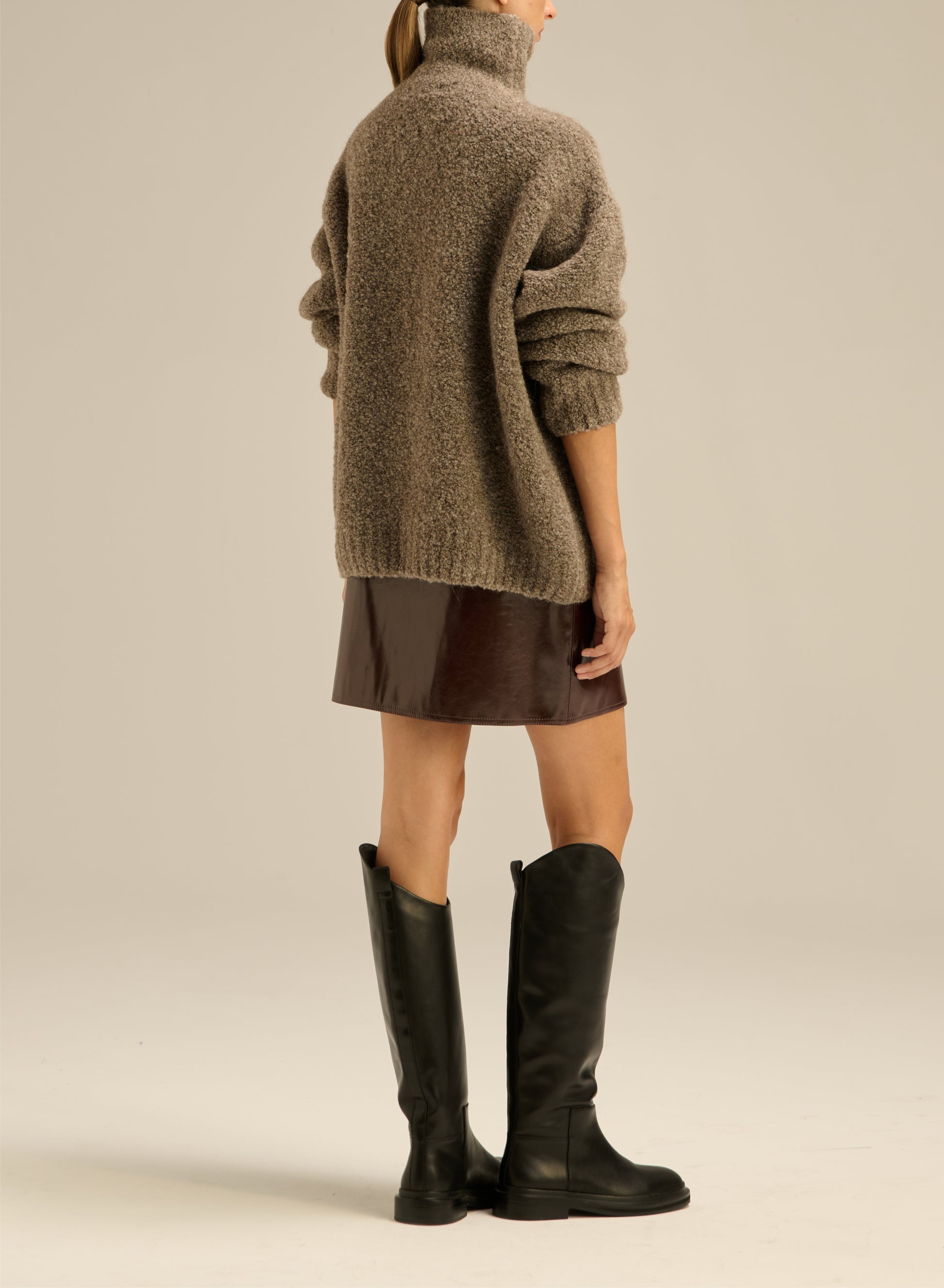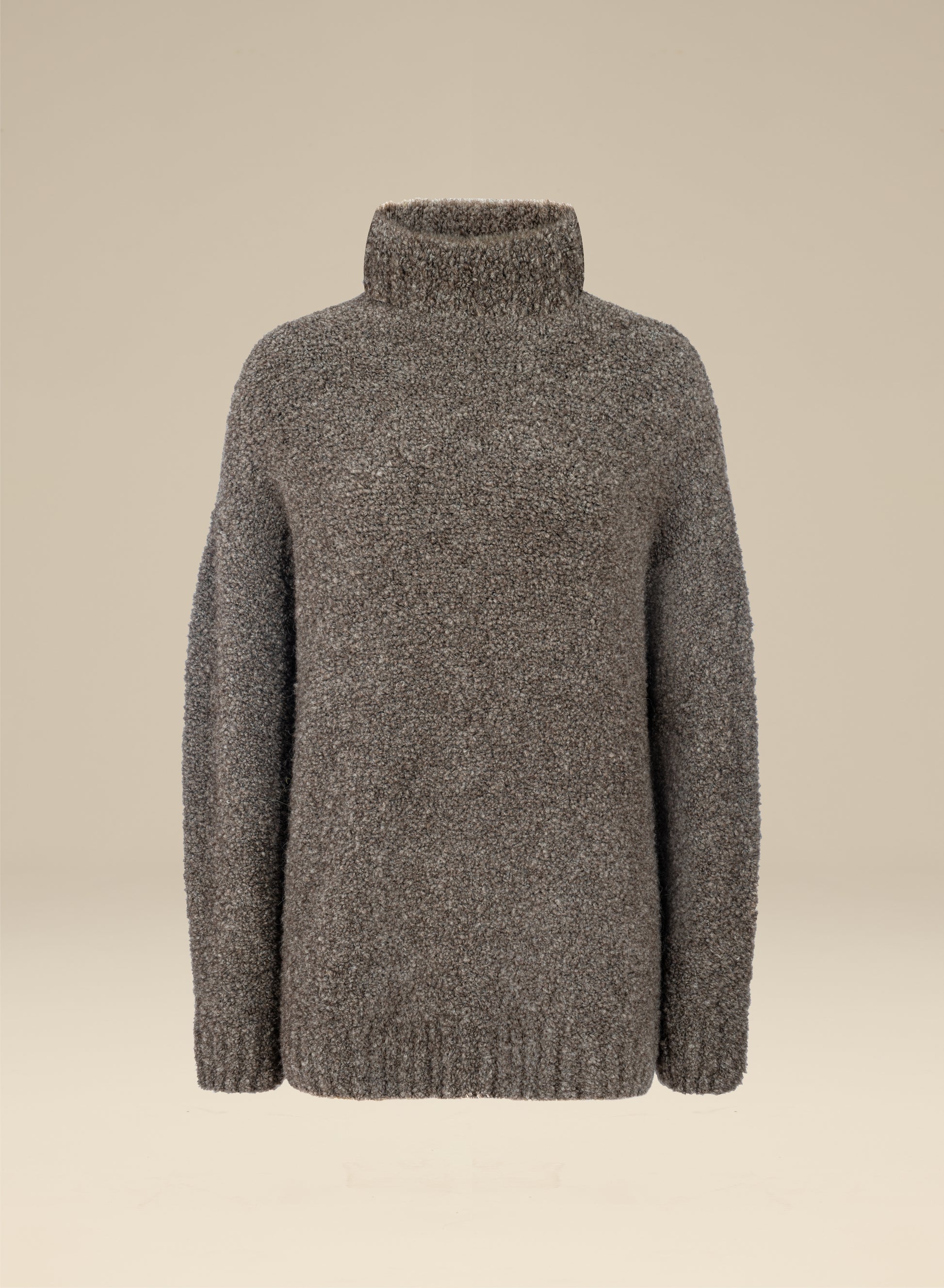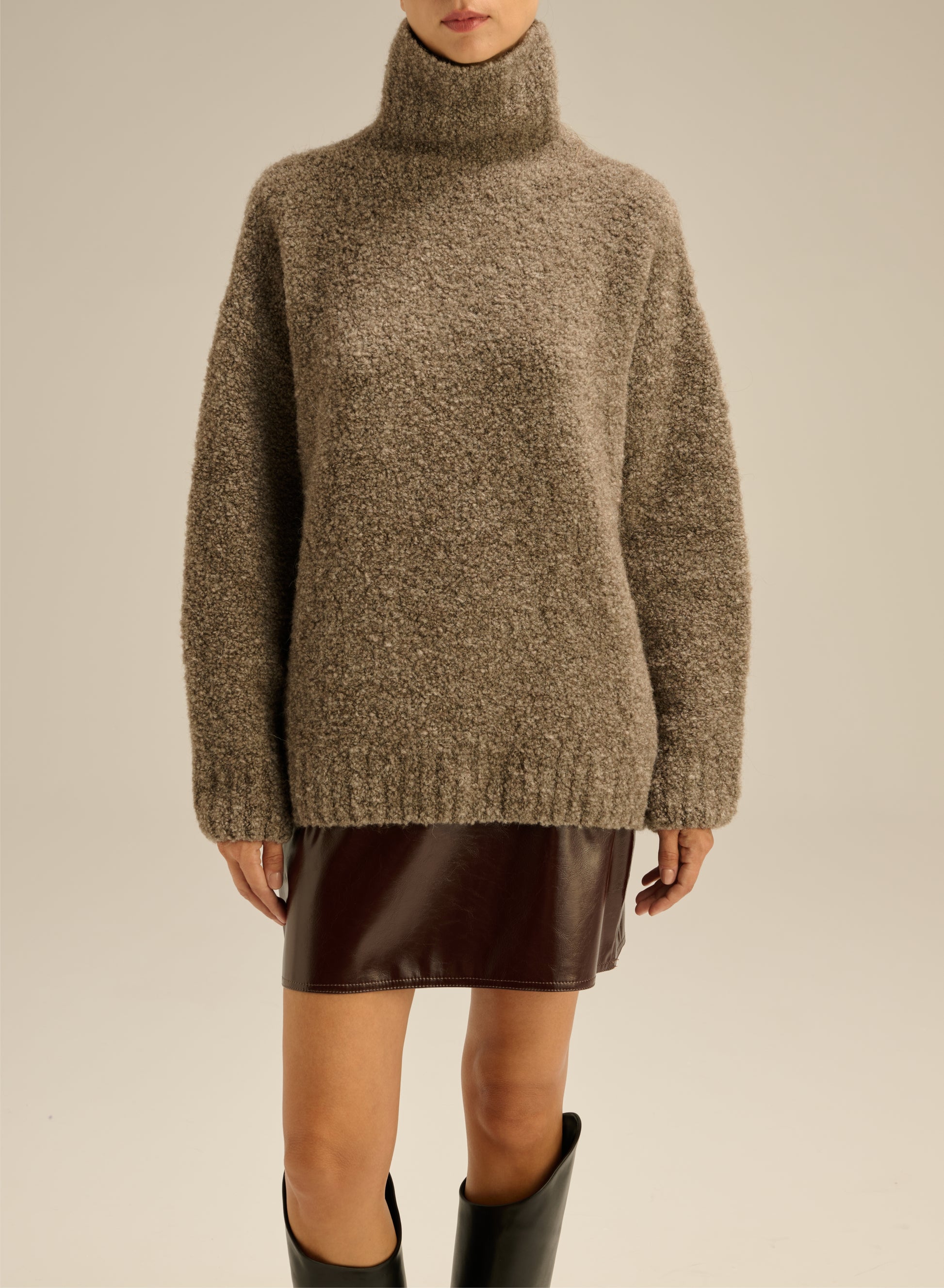 Luźny sweter z wysokim golfem, wykonany z miękkiej dzianiny. Posiada delikaty ściągacz na dole i przy rękawach.