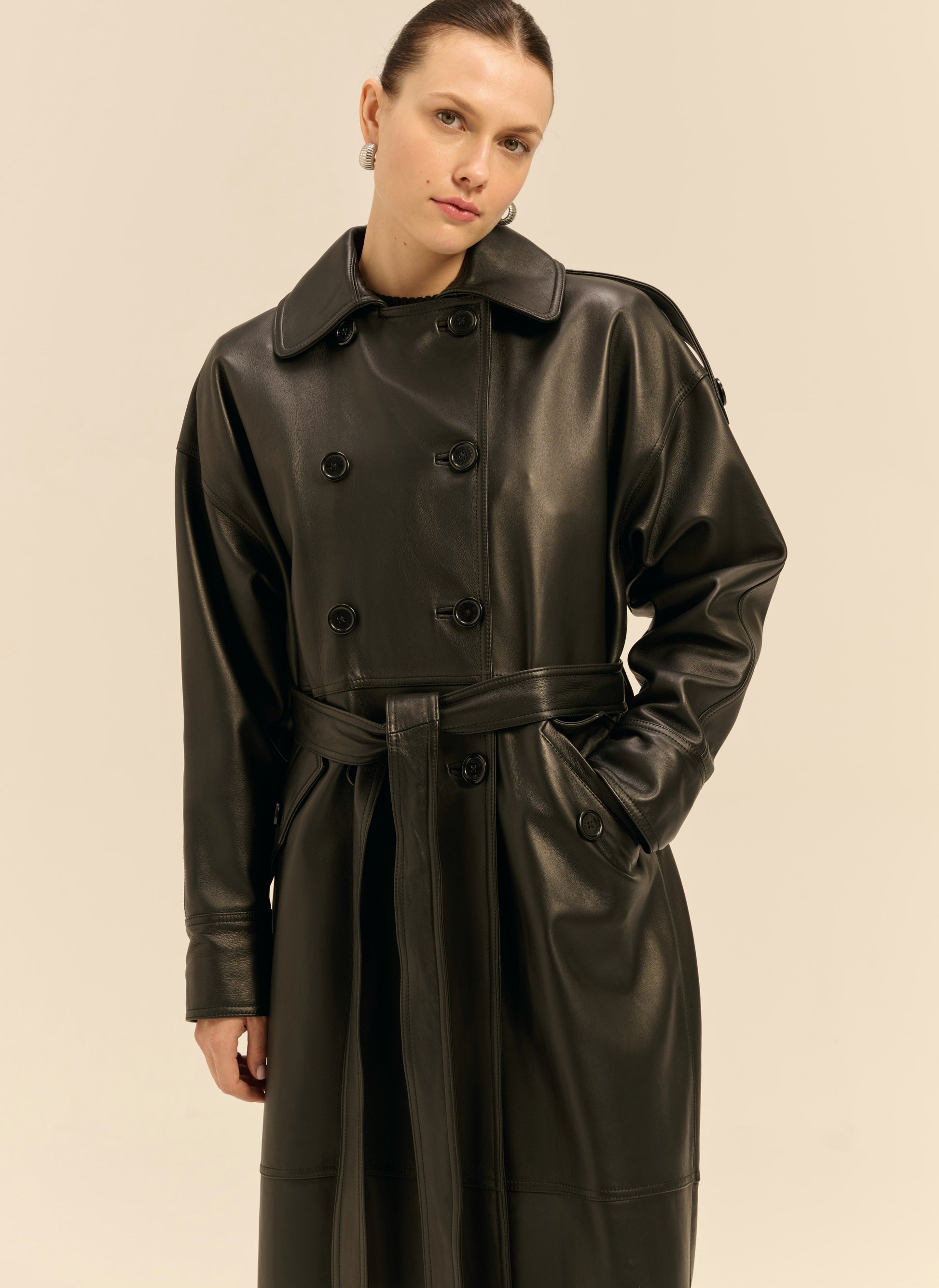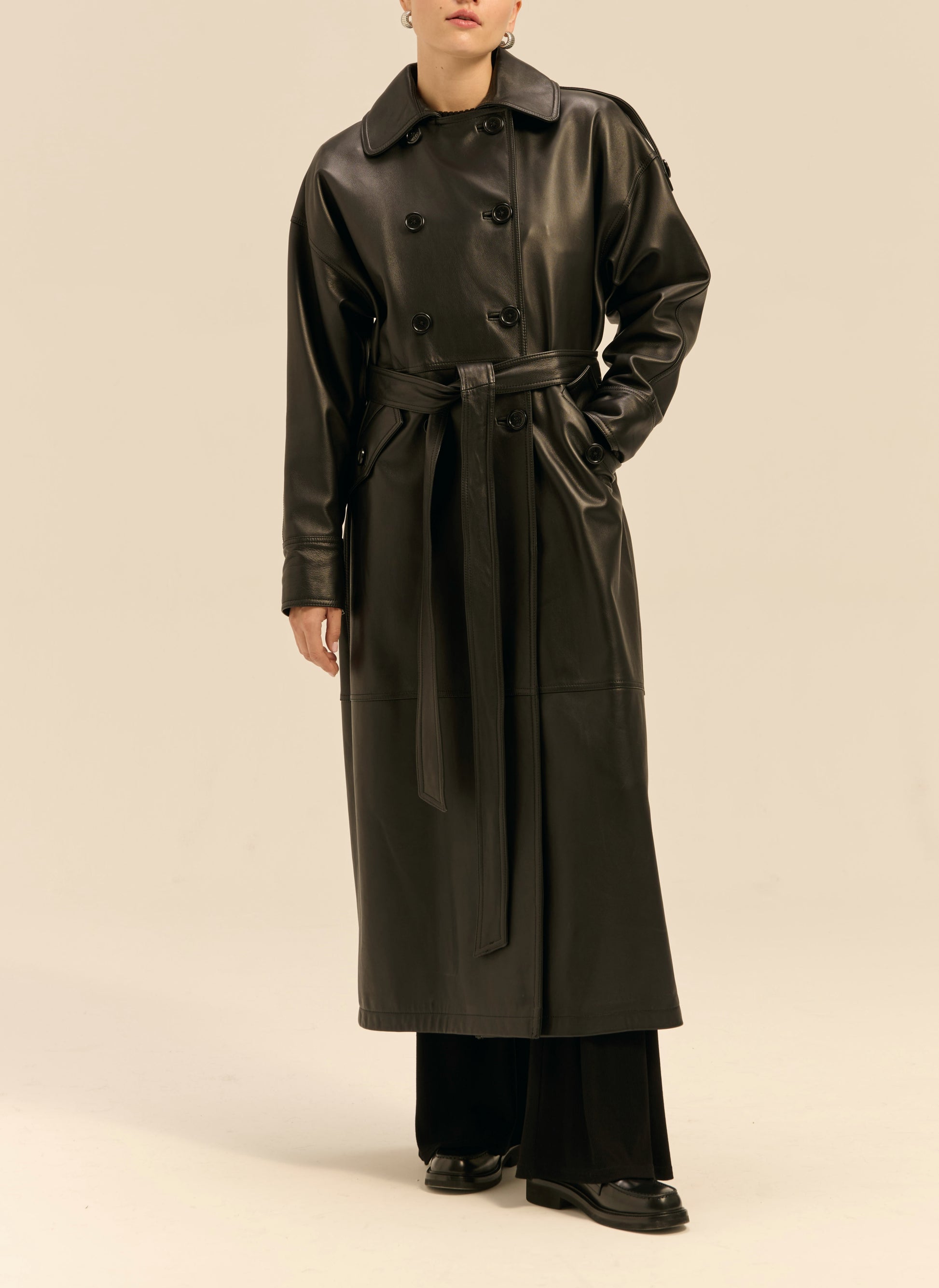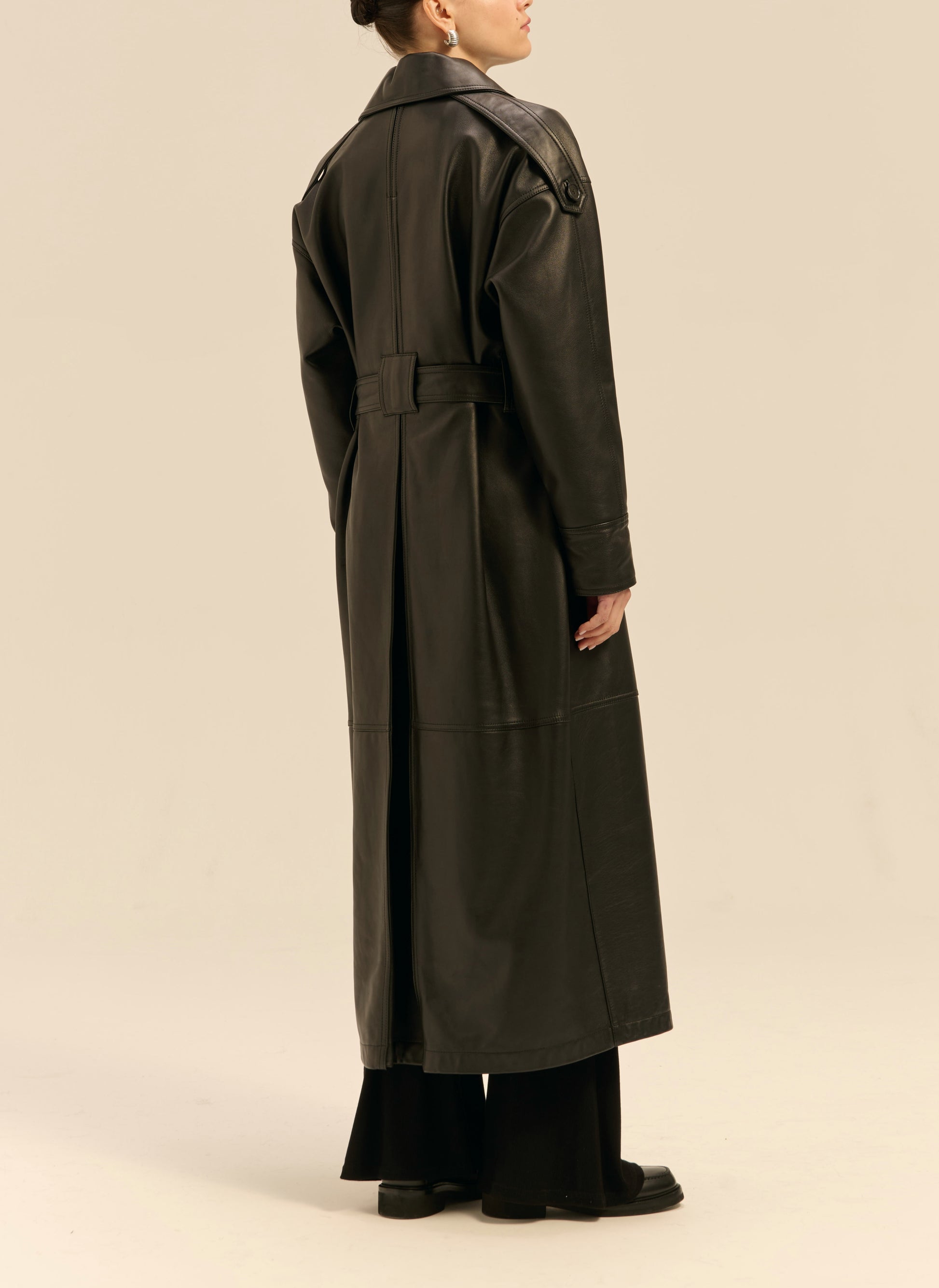 Klasyczny, długi trencz o kroju oversize wykonany ze skóry naturalnej w kolorze czarnym. Posiada dwurzędowe zapięcie na guziki, szerokie rękawy zbierane w nadgarstkach, pagony na ramionach oraz długi pasek wiązany w talii. Tył płaszcza dekorowany plisą. Produkt dostępny na zamówienie, czas realizacji wynosi około 7 dni roboczych