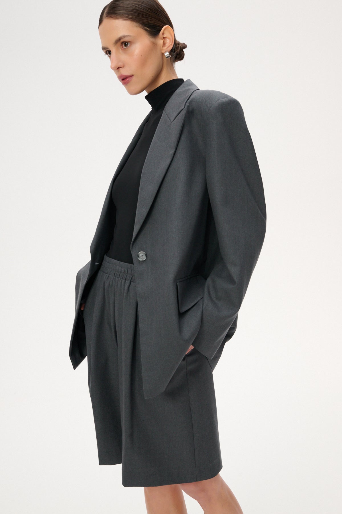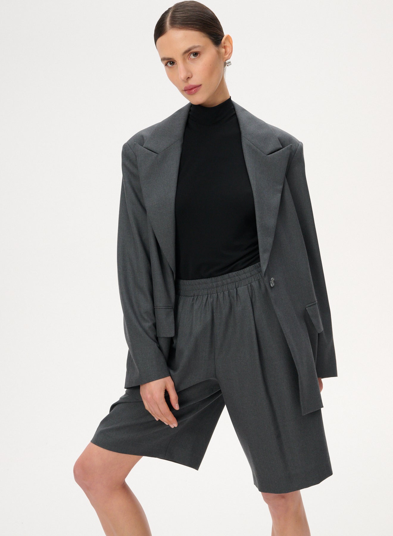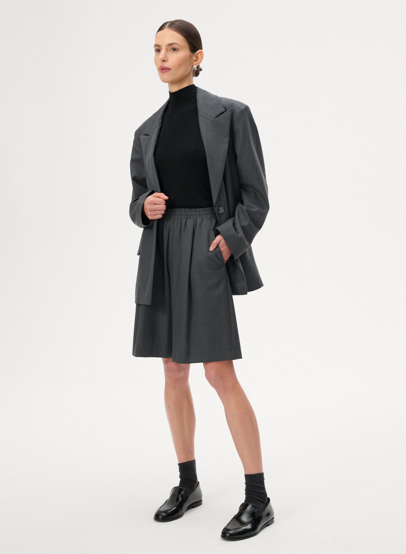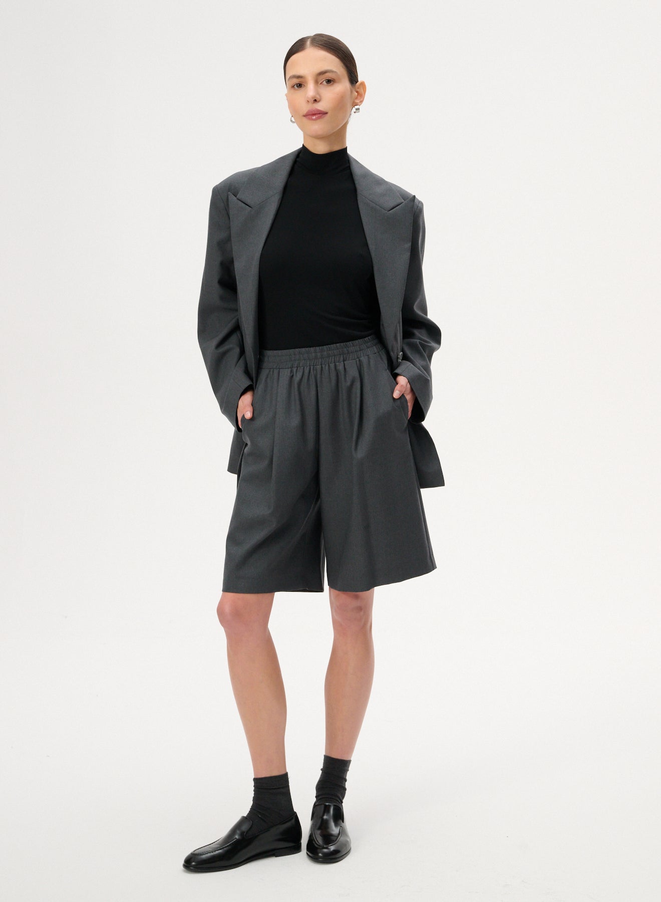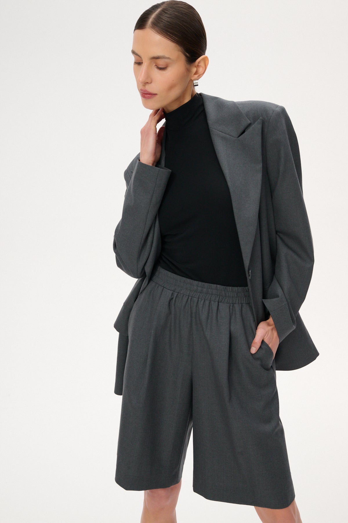 Szorty typu bermudy o długości za kolano i szerokich nogawkach wykonanych z lekkiej wełnianej tkaniny w szarym kolorze. Posiadają delikatne zaszewki, elastyczną talię oraz dwie kieszenie boczne.