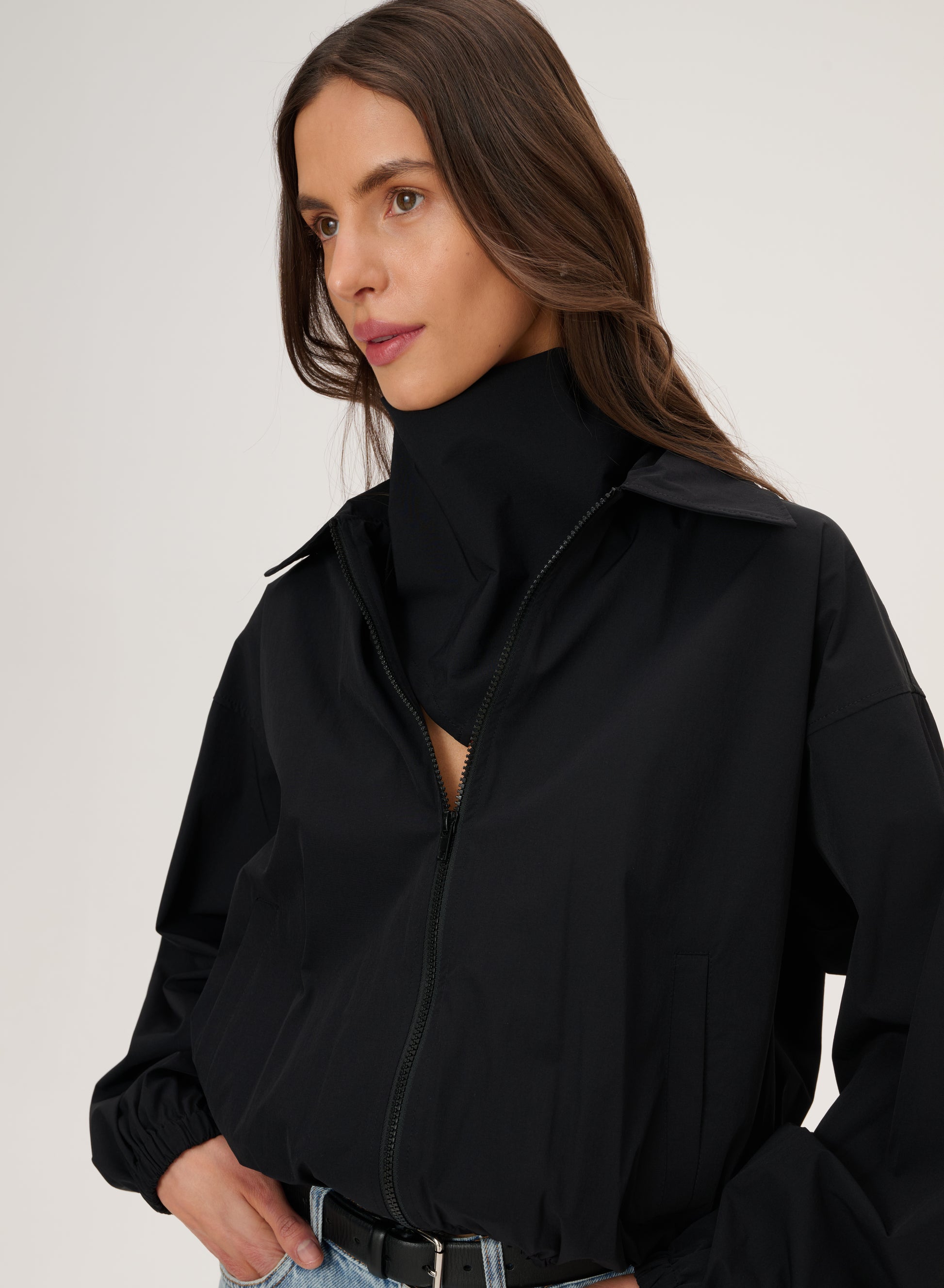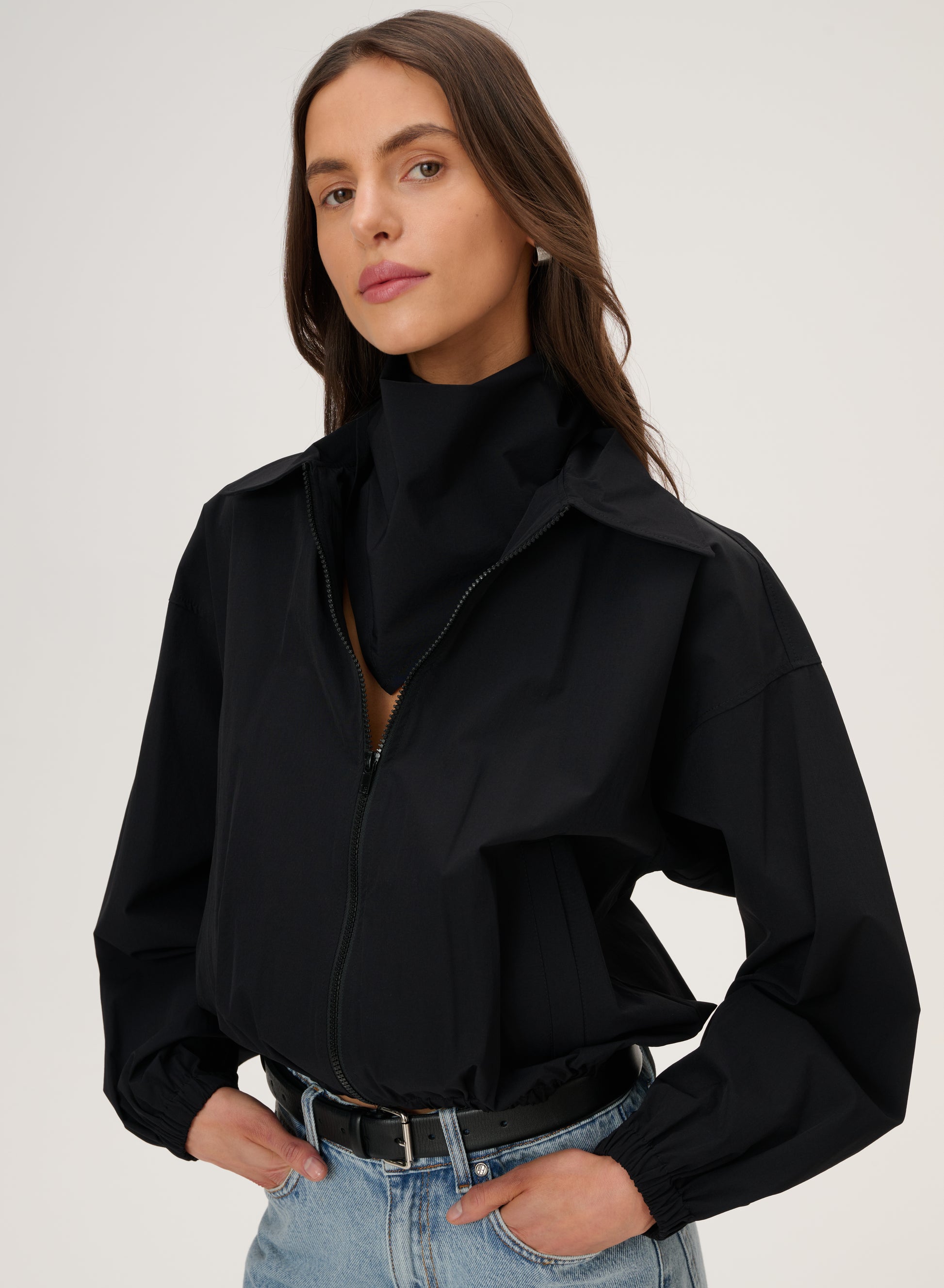 Uniwersalna, trójkątna chusta wykonana z elastycznej, ortalionowej tkaniny w czarnym kolorze.