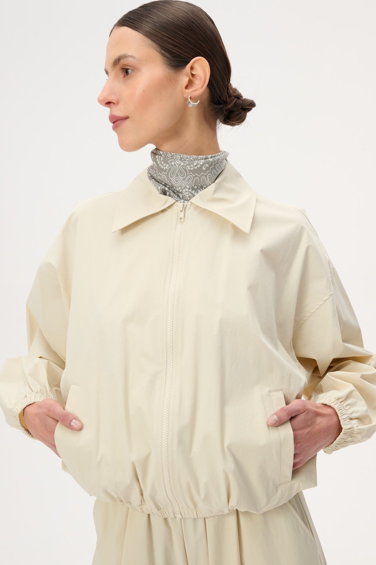 Kurtka ortalionowa o luźnym kroju wykonana z lekkiego materiału w kolorze ecru. Posiada elastyczny dół i gumki na zakończeniu rękawa, dwie boczne kieszenie oraz zapięcie na zamek błyskawiczny.
