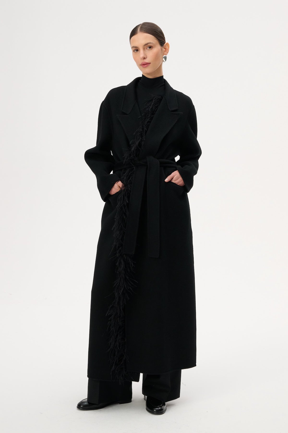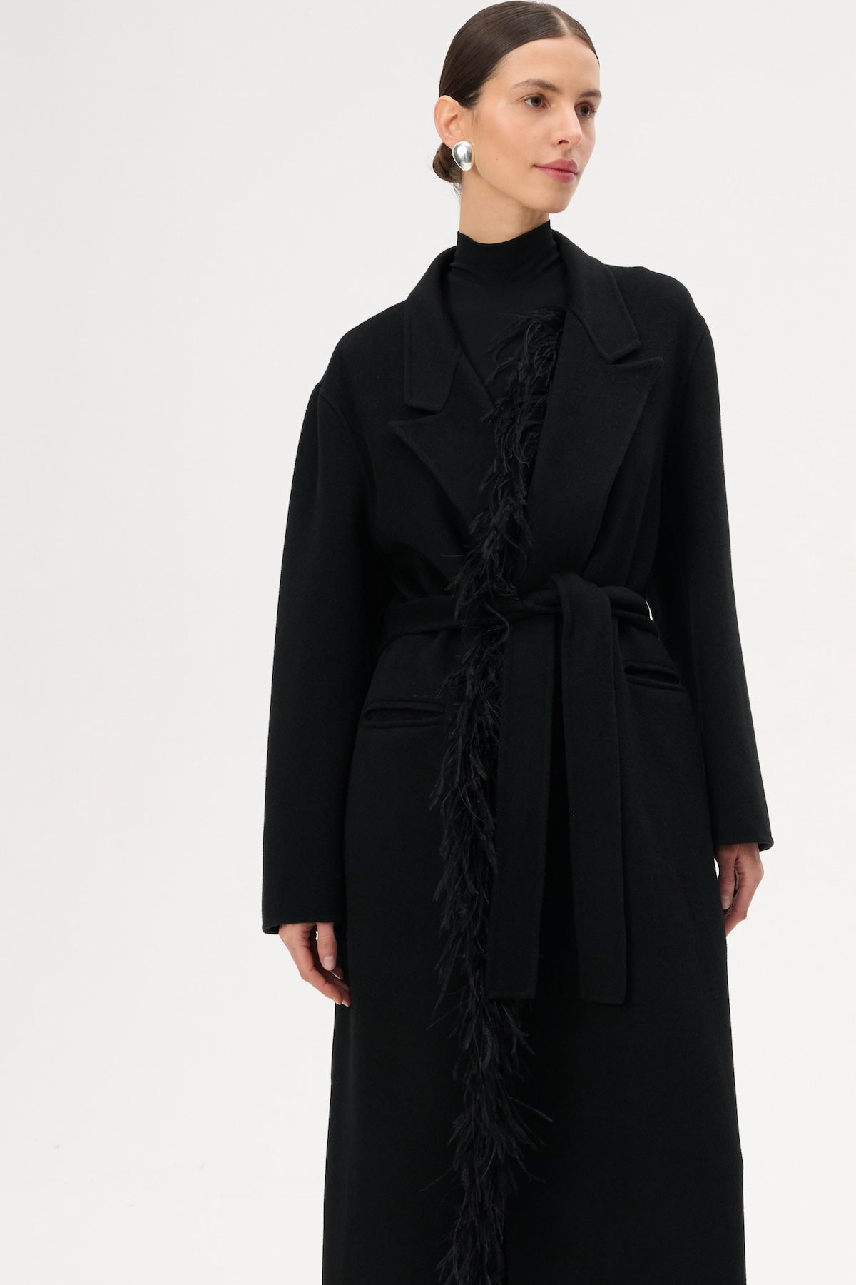 Płaszcz o szlafrokowym kroju i długości maxi w kolorze czarnym. Zdobiony panelem z naturalnych piór, które można odpiąć. Model bez podszewki/ double face.