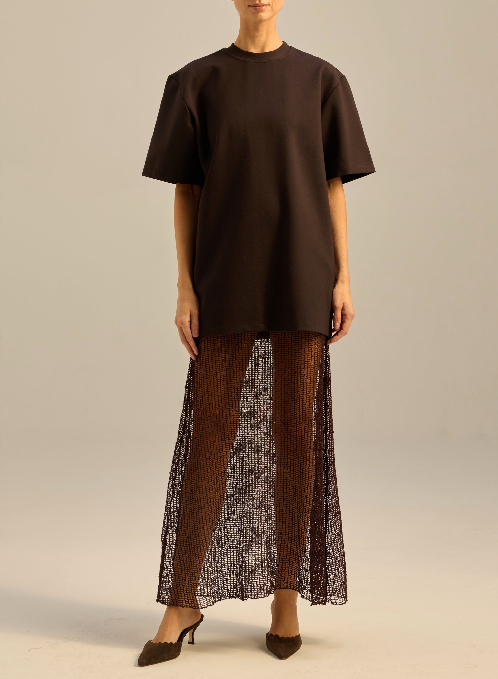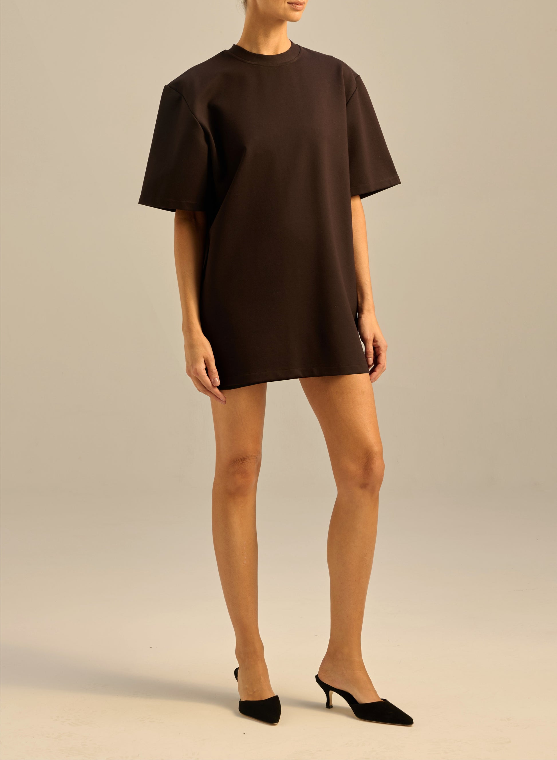 Mini sukienka o kroju t-shirtu, wykonana z miękkego jerseyu. Posiada okrągły dekolt i rękawy przed łokieć.