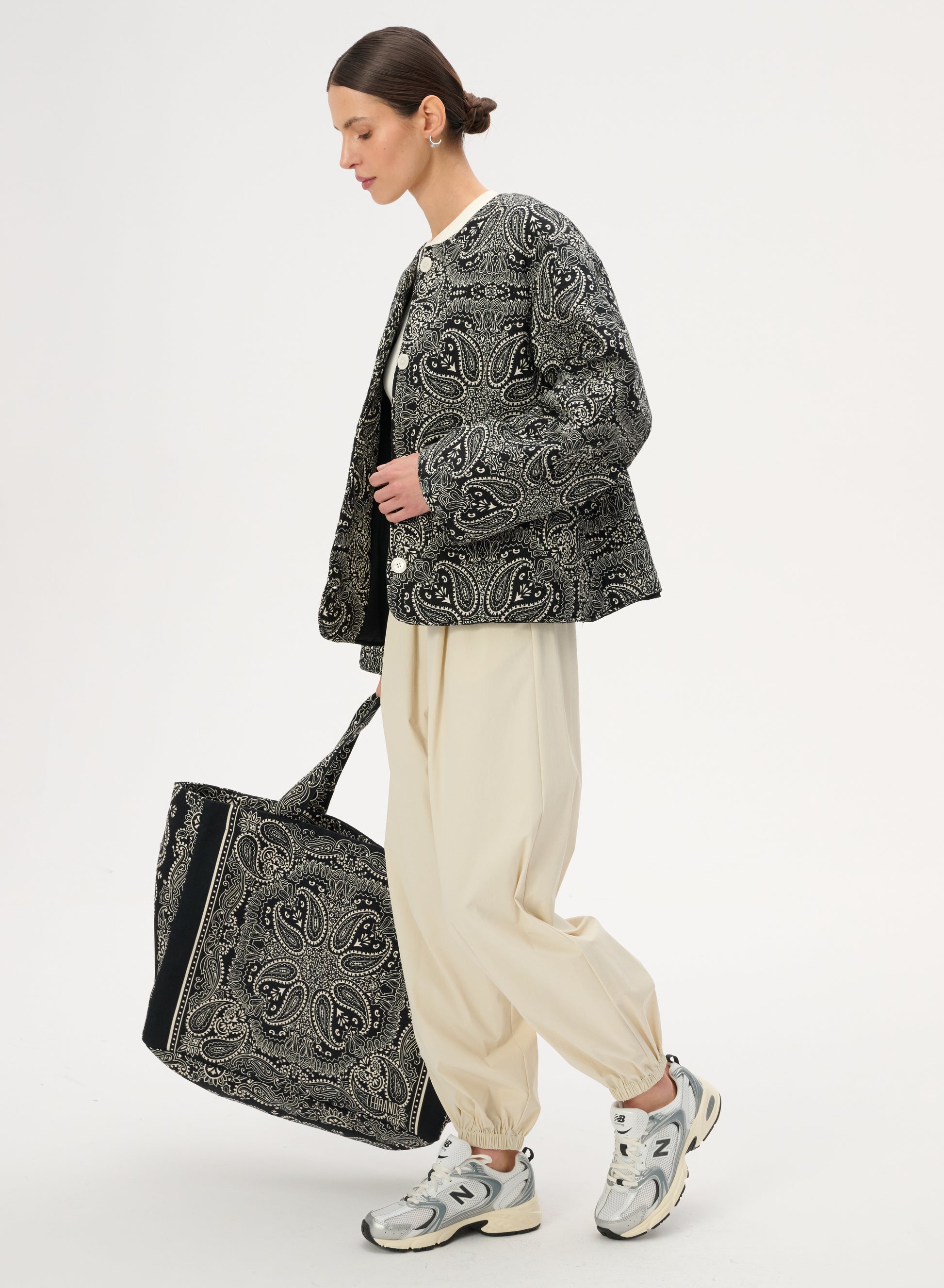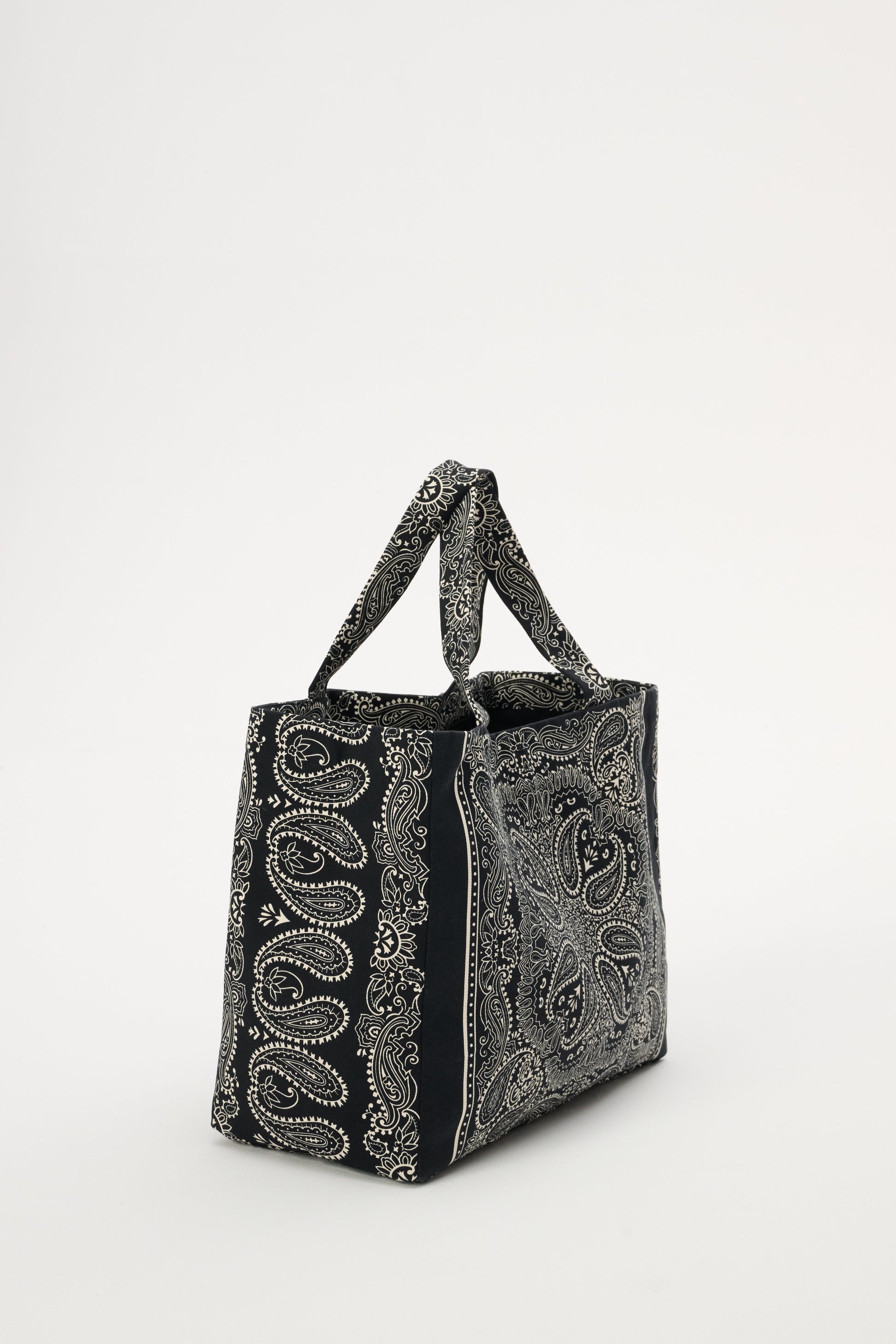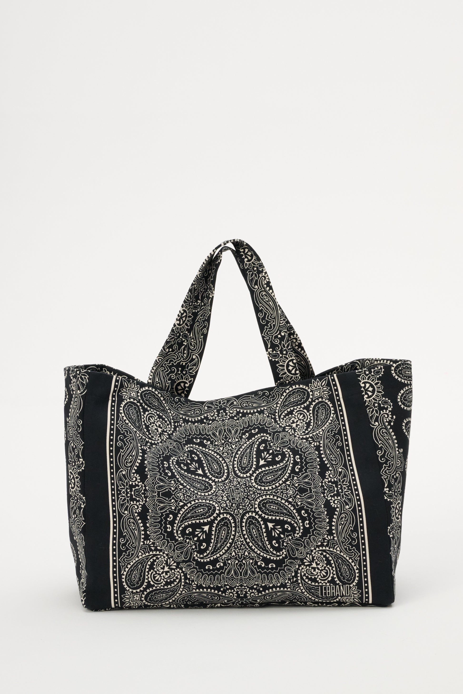 Torba oversize typu shopper wykonana z grubego bawełnianego płótna z nadrukiem bandany w kolorze czarnym i ecru.
