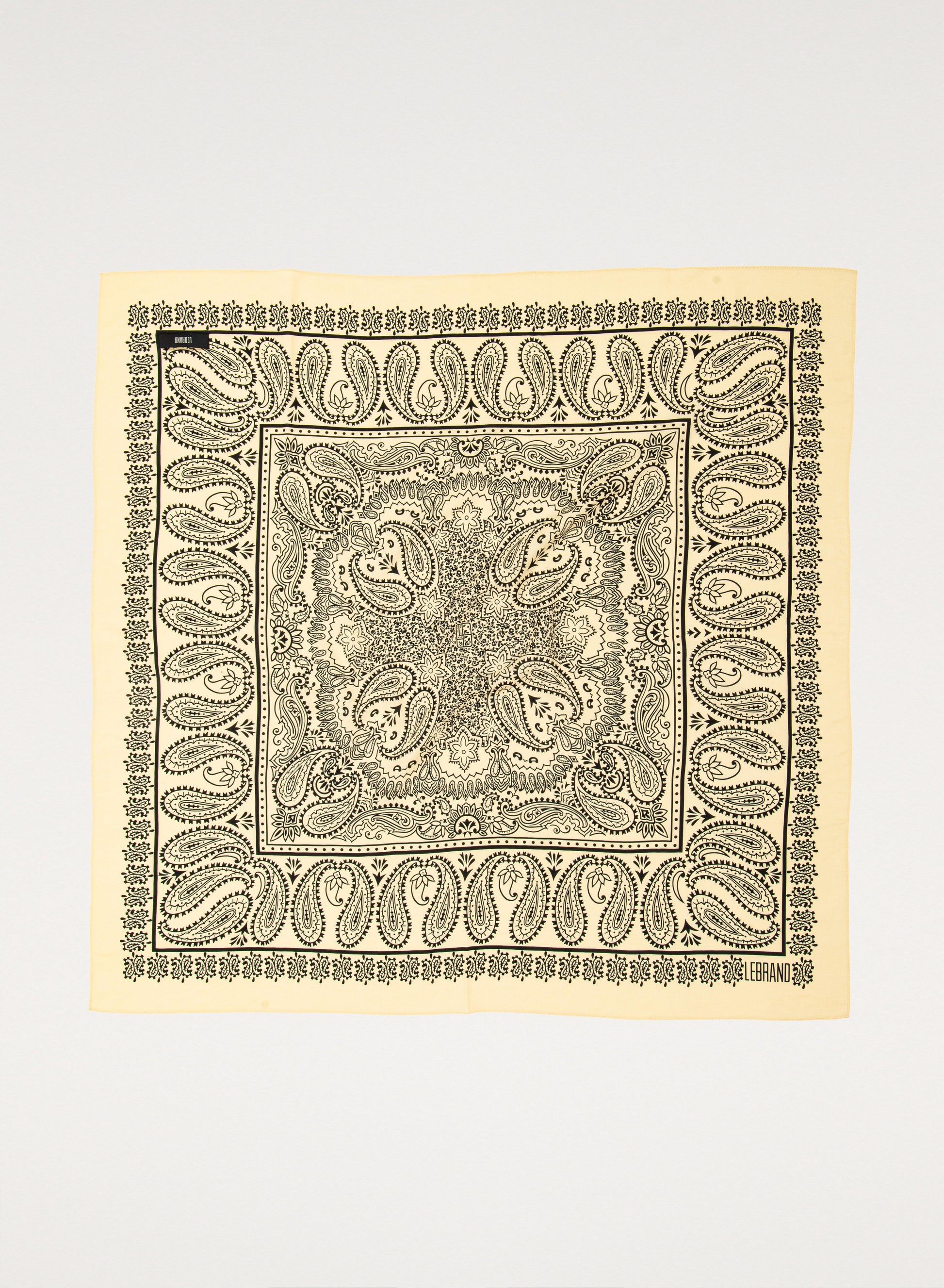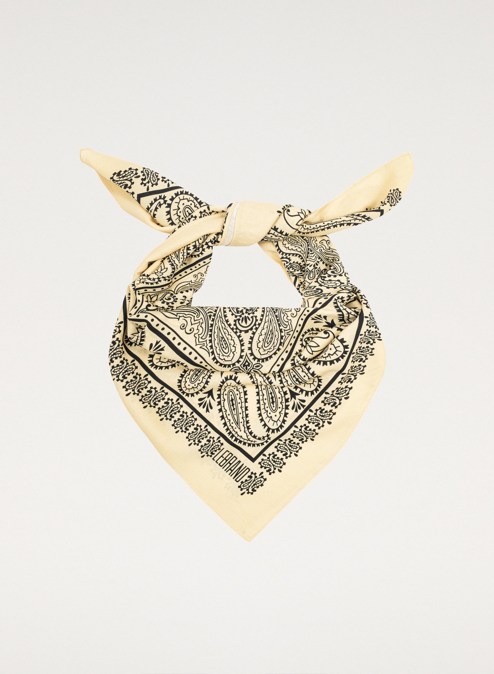 Uniwersalna bandana, ręcznie wykończona, wykonana z miękkiej wiskozy w kolorze żółtym z nadrukiem w kolorze ecru.