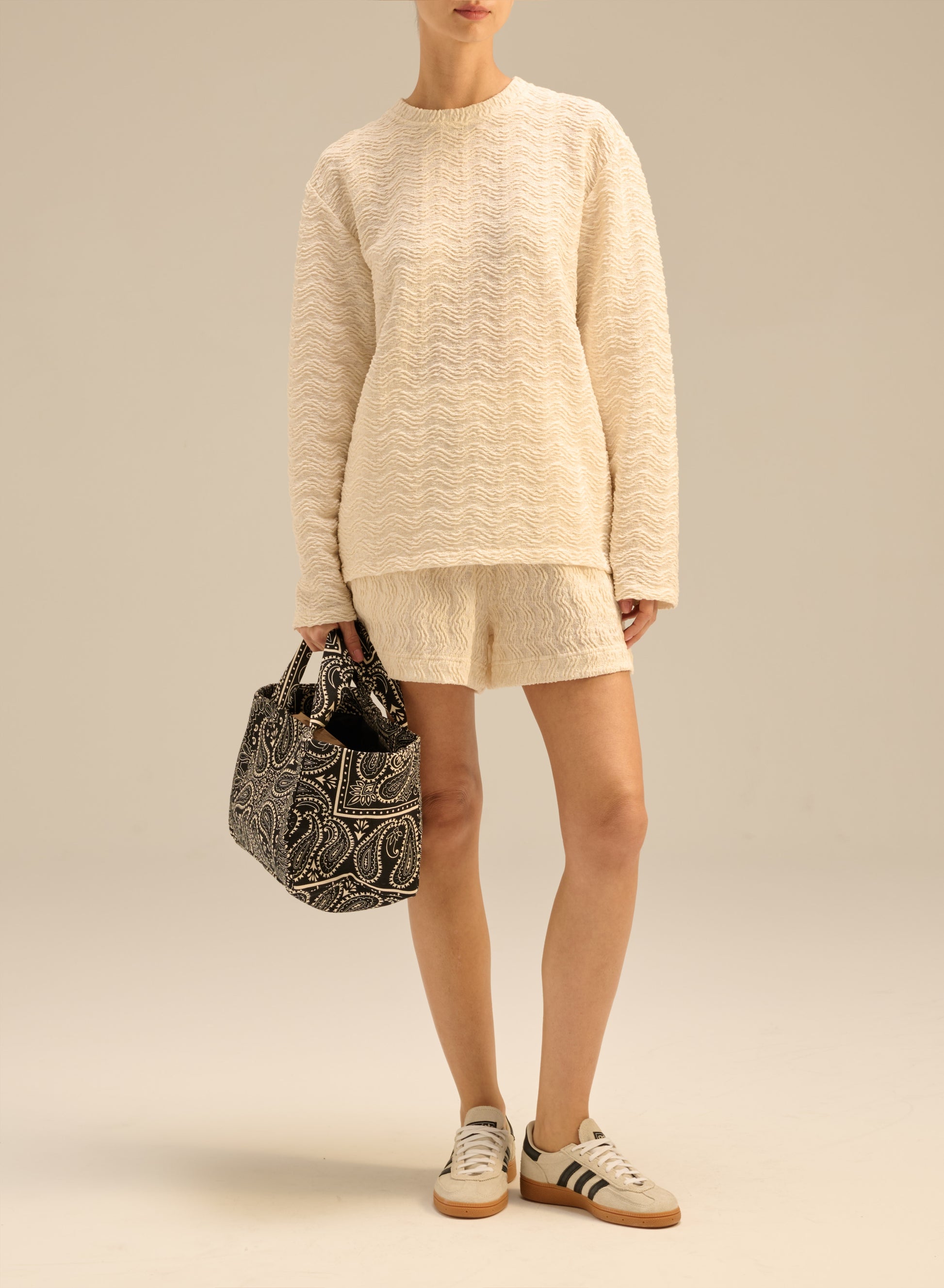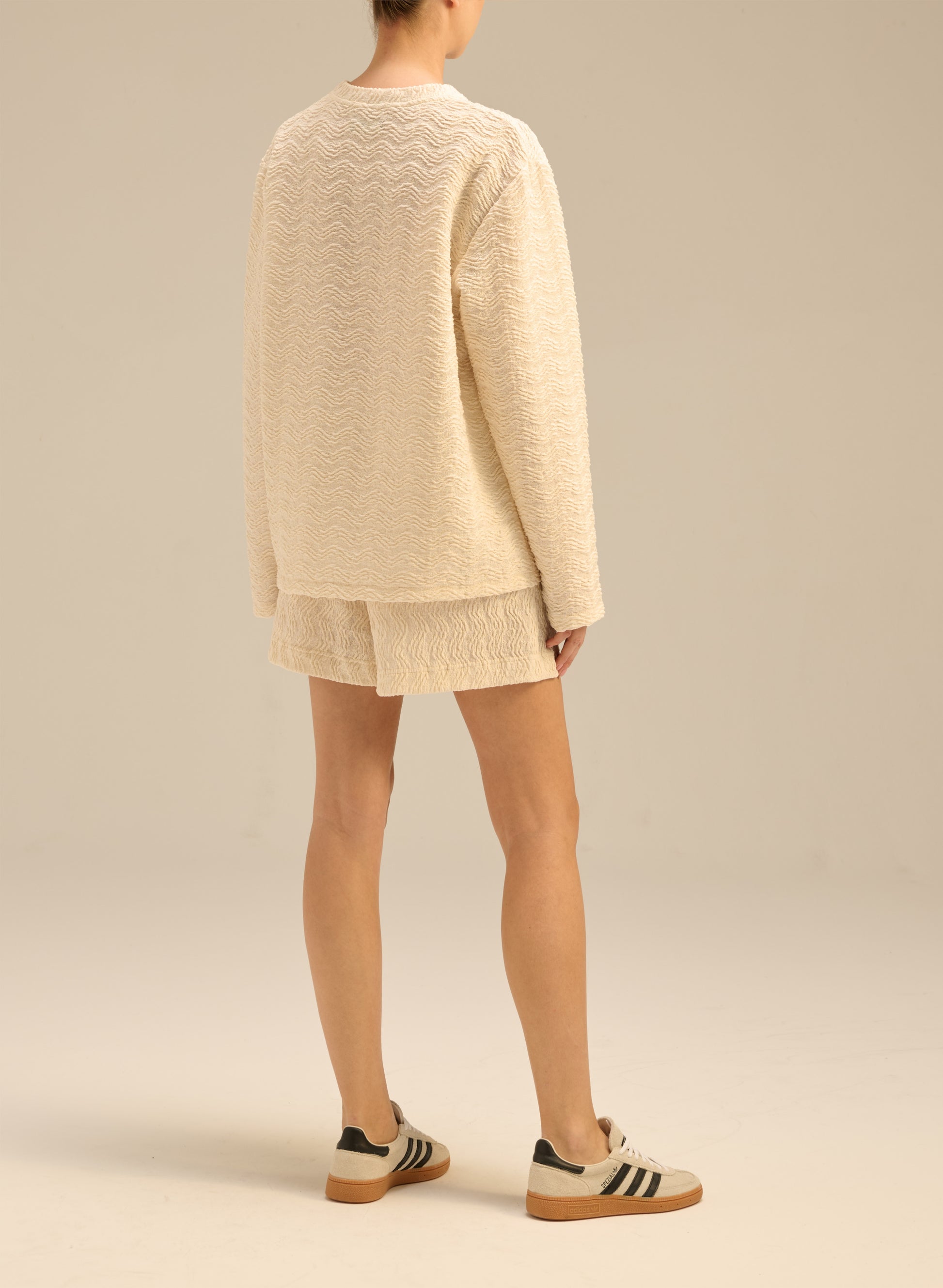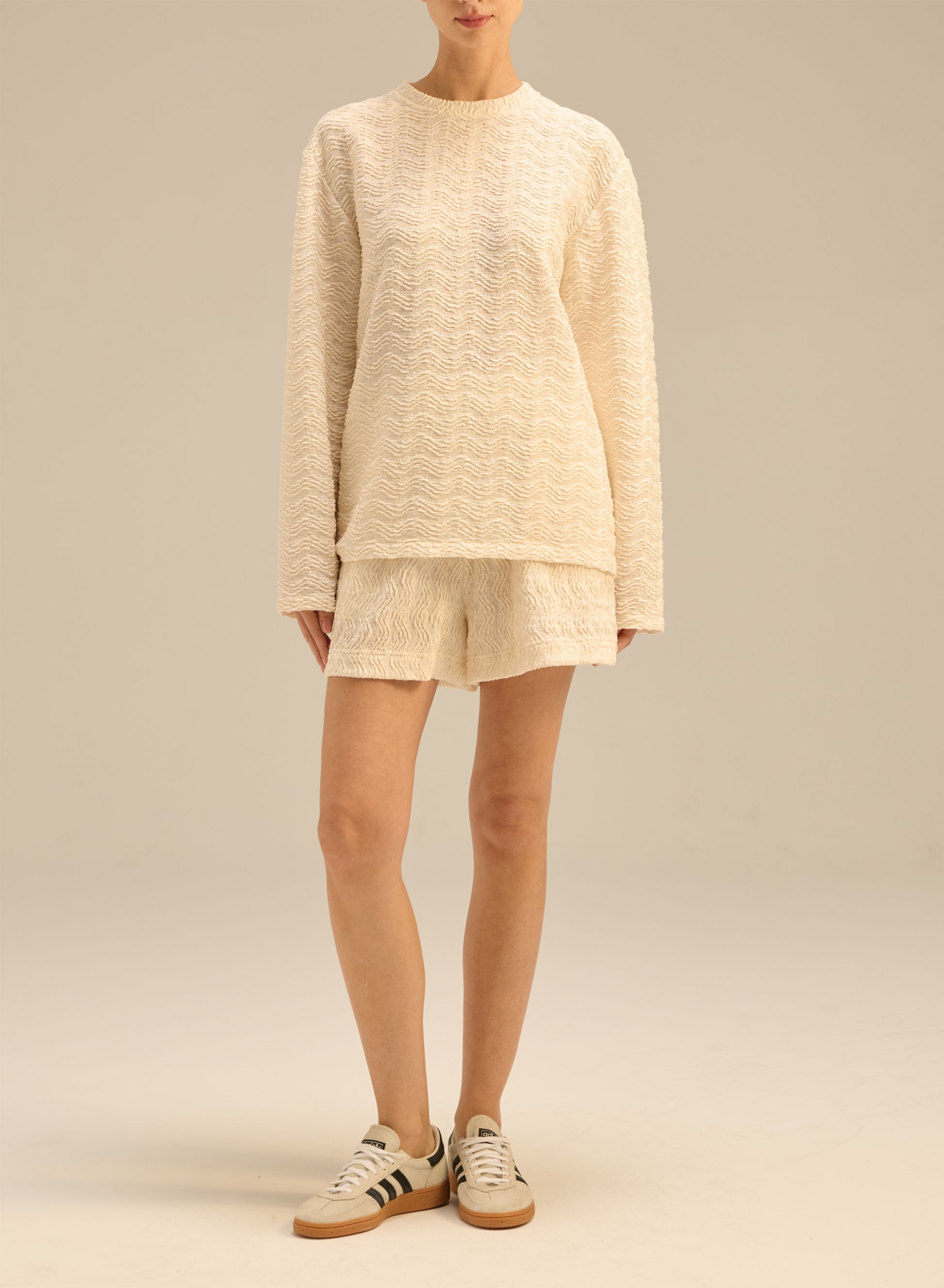 Longsleeve o kroju oversize, wykonany z miękkiego materiału w teksturę sweterkową. Posiada luźny krój, okrągły dekolt i długie rękawy